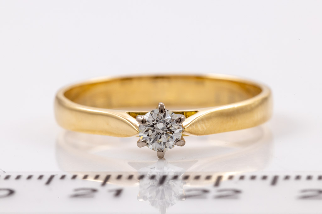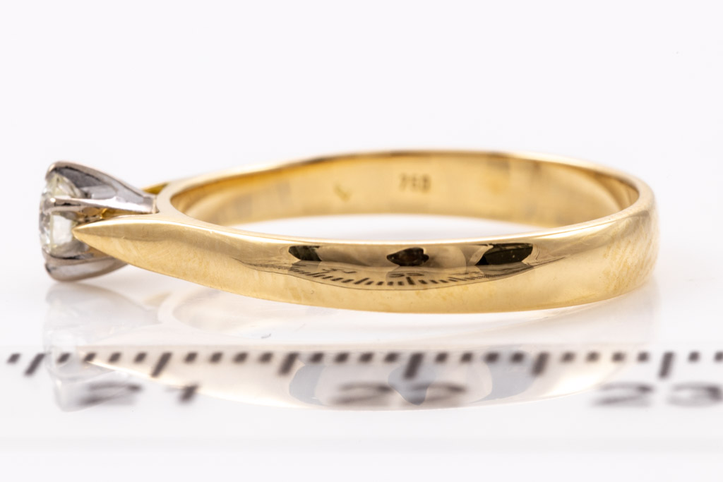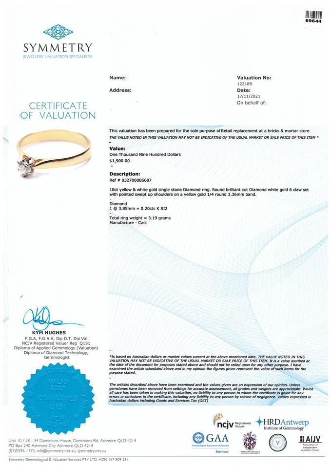 Solitaire Diamond ring with round cut Diamond of approximately 0.20ct (Estimated grading K SI2). 18ct yellow and white gold. Ring size R. Weight 3.1g With Valuation. (Pre-owned)