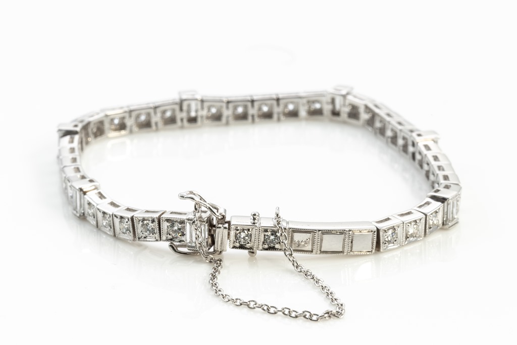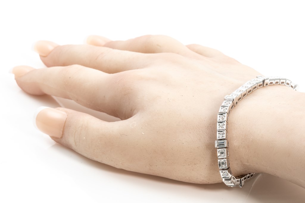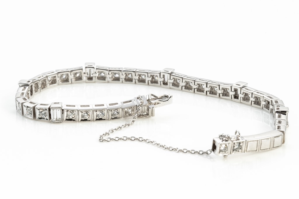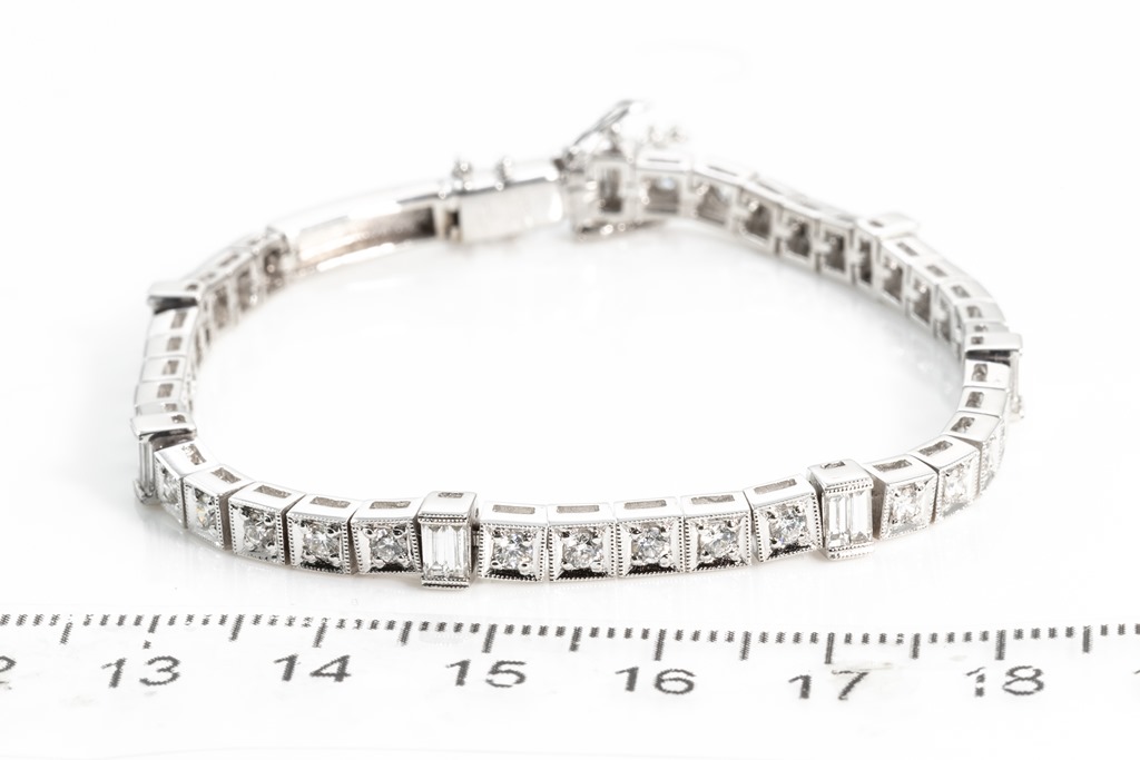 Diamond tennis bracelet with round Diamonds (Estimated grading: F-G VS) and baguette cut Diamonds (Estimated grading H-I SI) totalling approximately 2.31cts . Length: 16cm. 18ct white gold. With safety chain. Weight 20.5g. (Pre-owned)