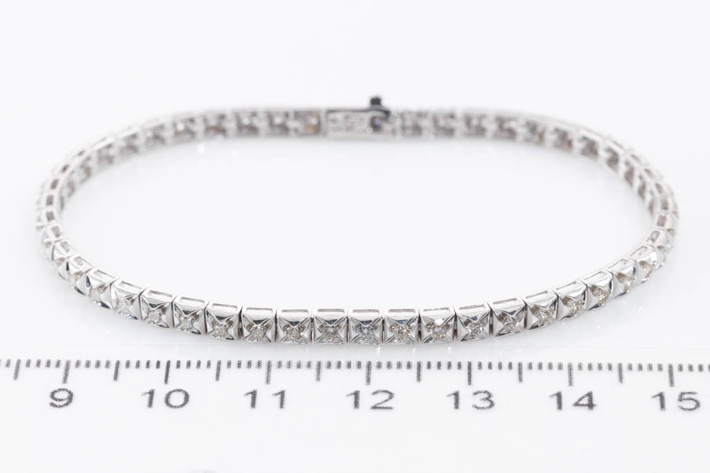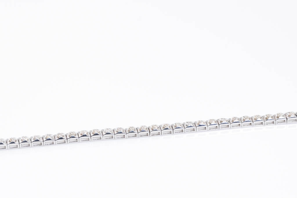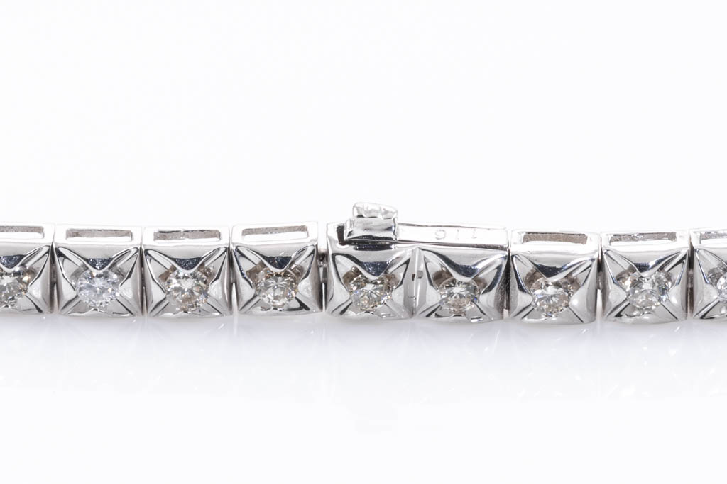 Diamond tennis bracelet with 50 round Diamonds totalling 1.16cts (Estimated grading: I-K SI). 18ct white gold. Length: 17.5cm. Weight: 8.7g. (Pre-owned)