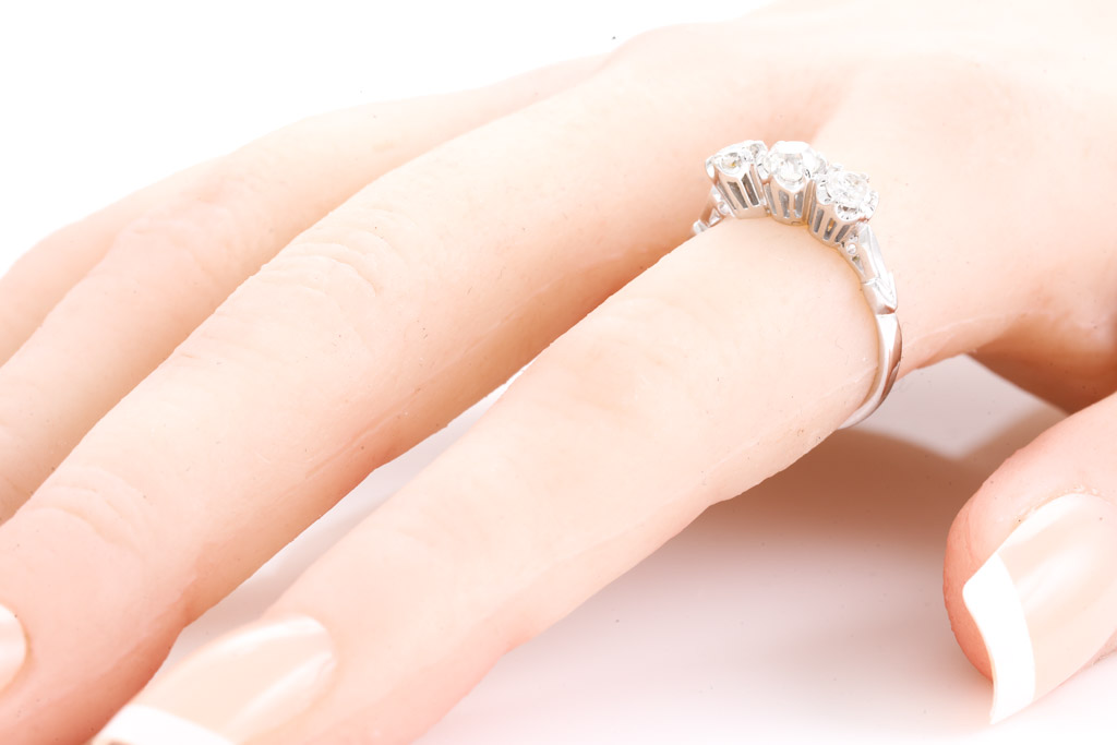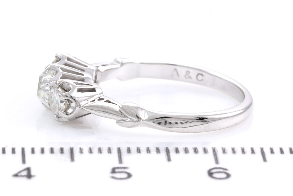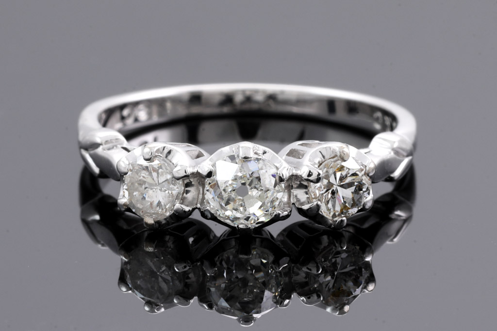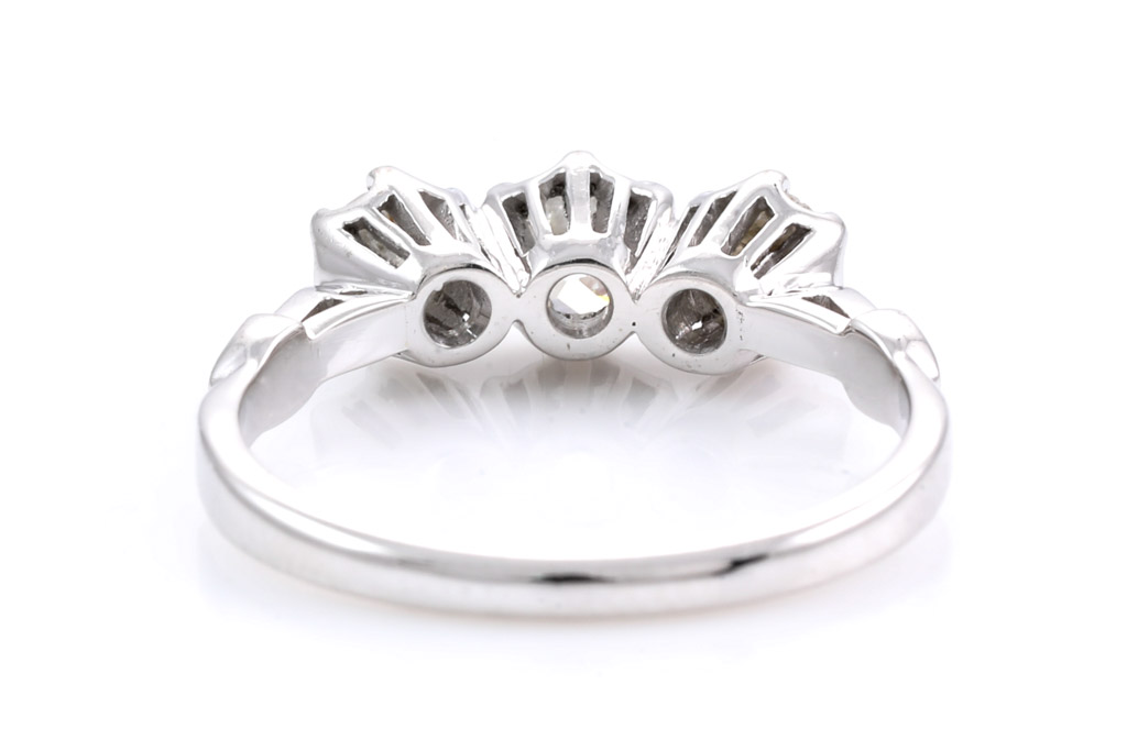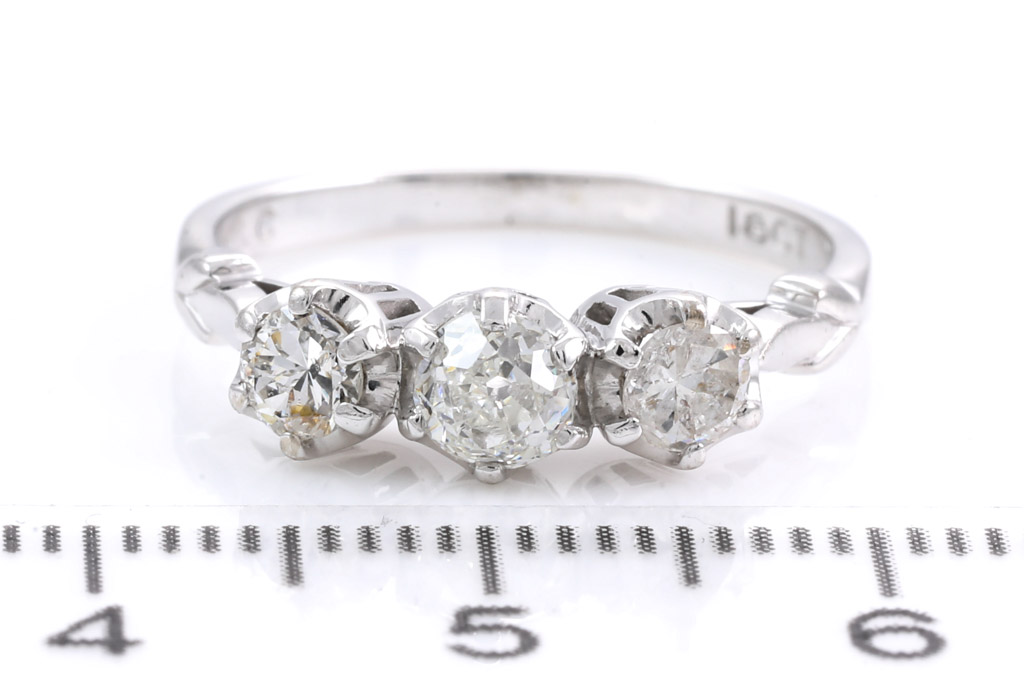 Diamond trilogy ring with old cut Diamonds totalling approximately 0.60cts (Estimated grading I-J SI-P). 18ct white gold. Ring size L. Weight 3.2g. Signed by Angus & Coote. (Pre-owned)