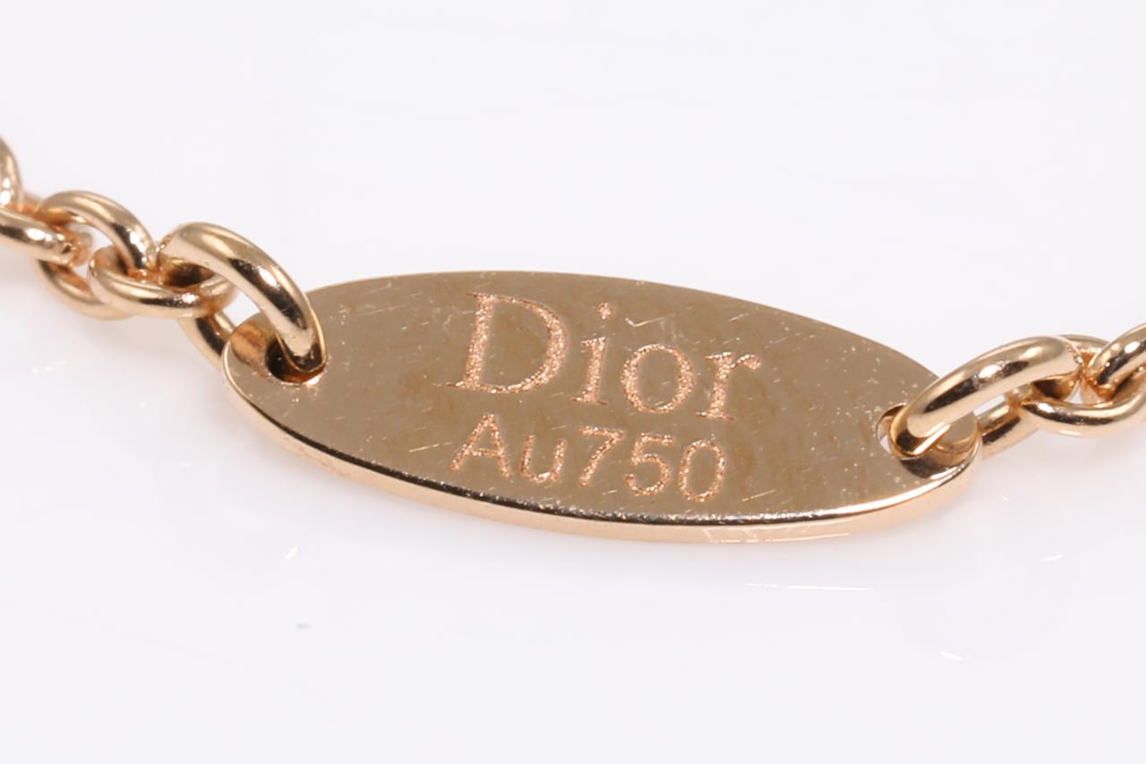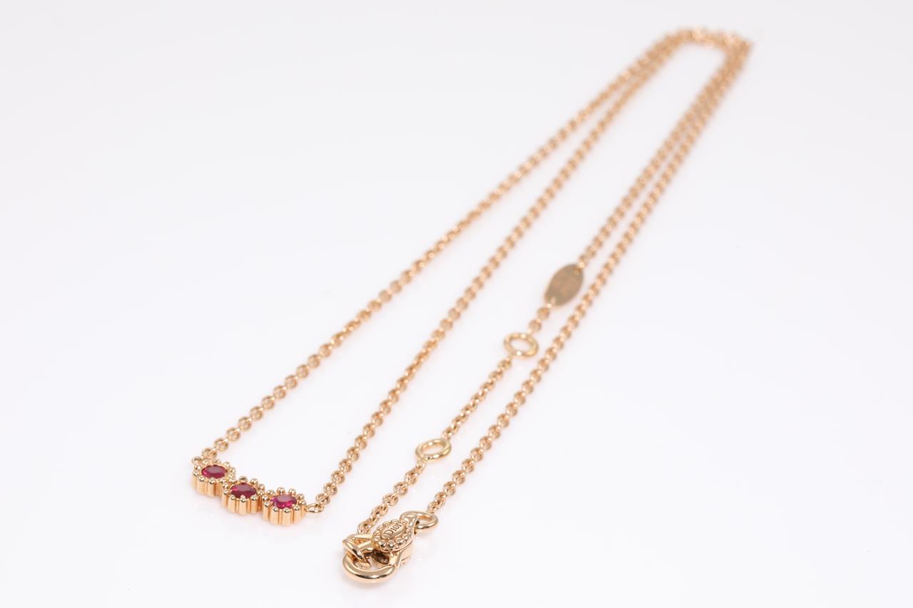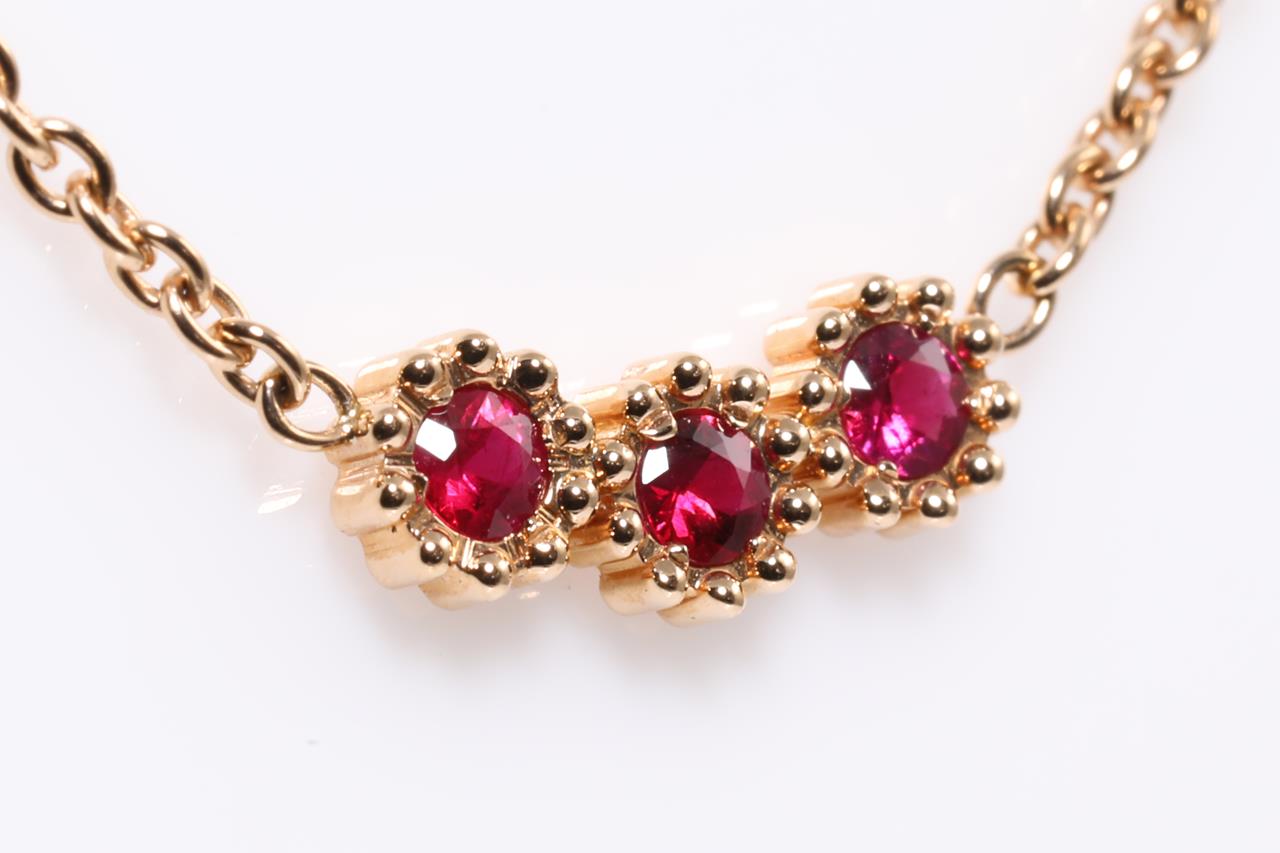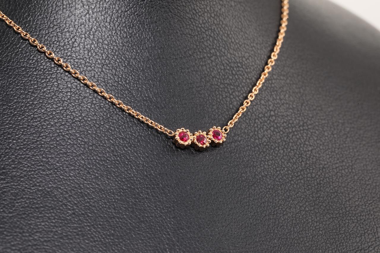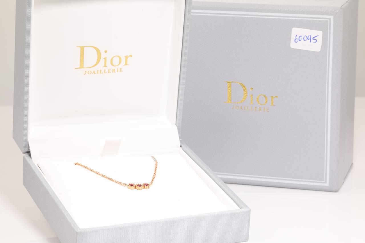 Dior Mimirose necklace with 3 round rubies totalling 0.16cts. 18ct rose gold with attached chain. Adjustable max length 42cm. Weight: 3.7g. With Dior box and Dior authenticity card dated 28/07/2021. (Pre-owned)
