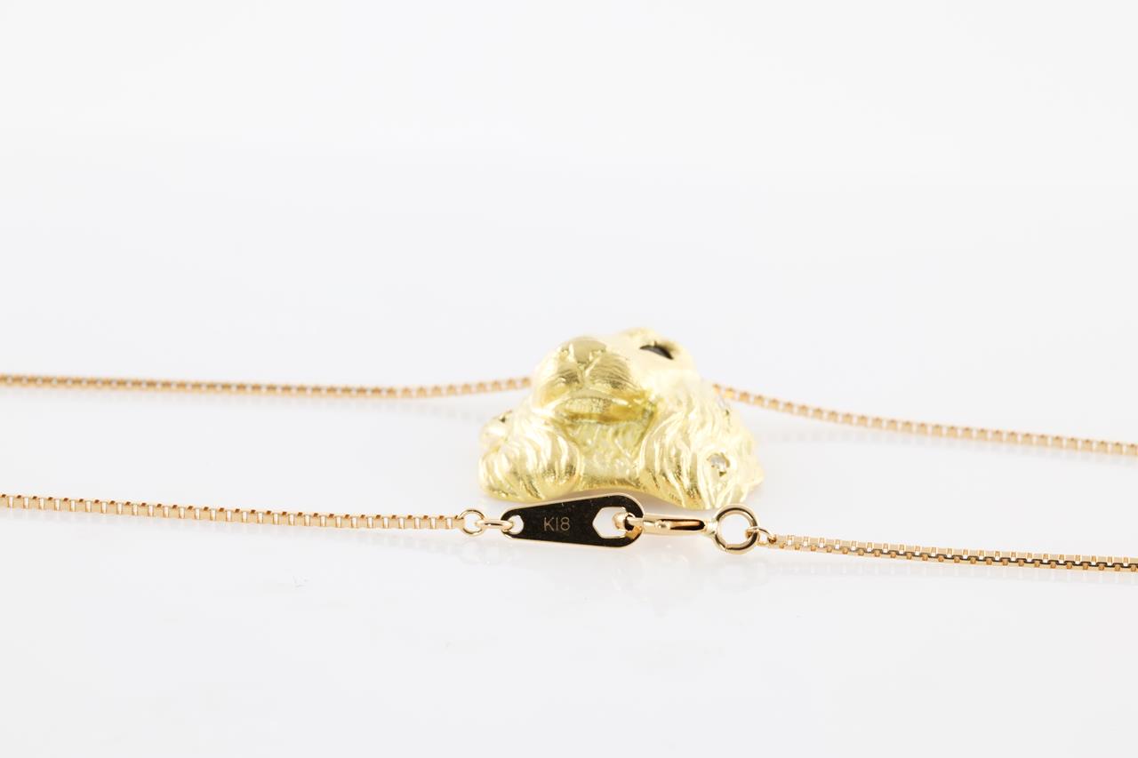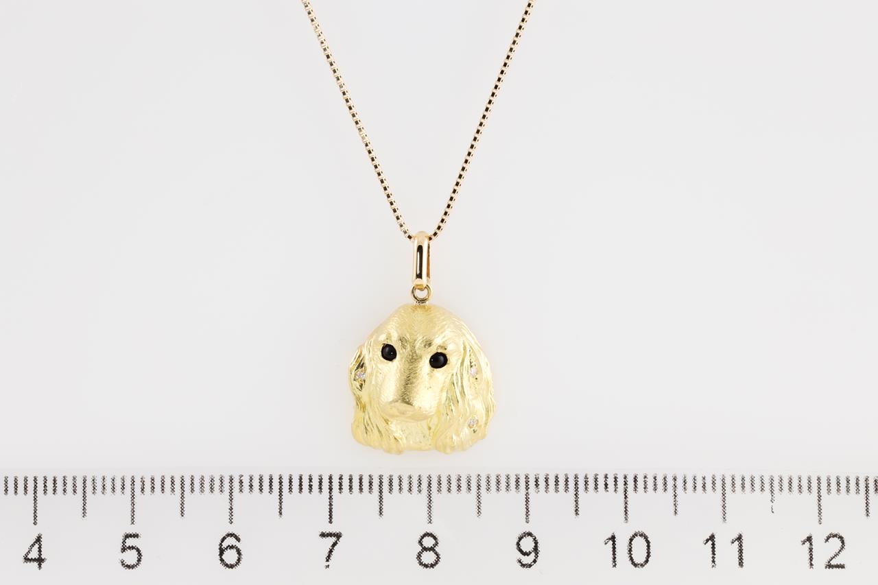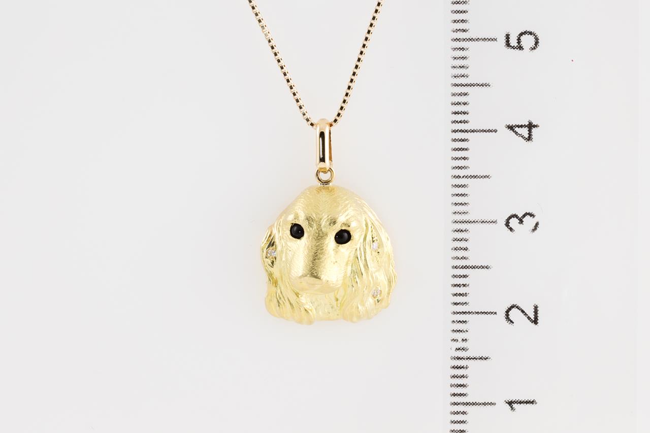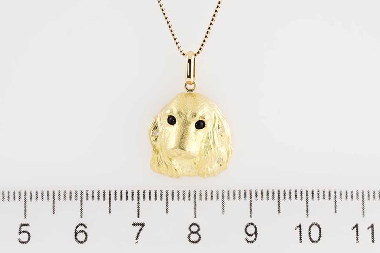 Dog design pendant with Onyx eyes and three Diamonds. 18ct yellow gold with 18ct gold 40cm chain. Weight: 5.0g (Pre-owned)