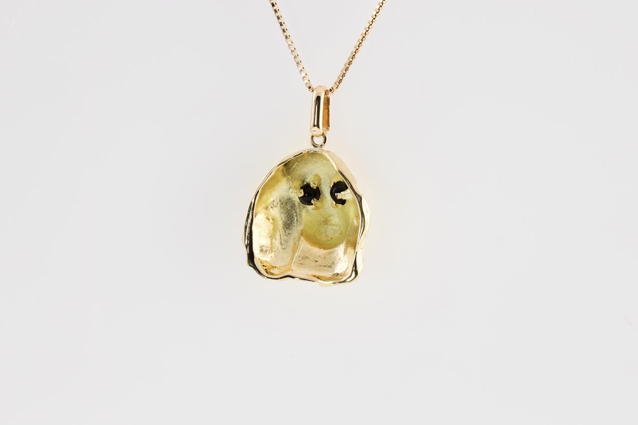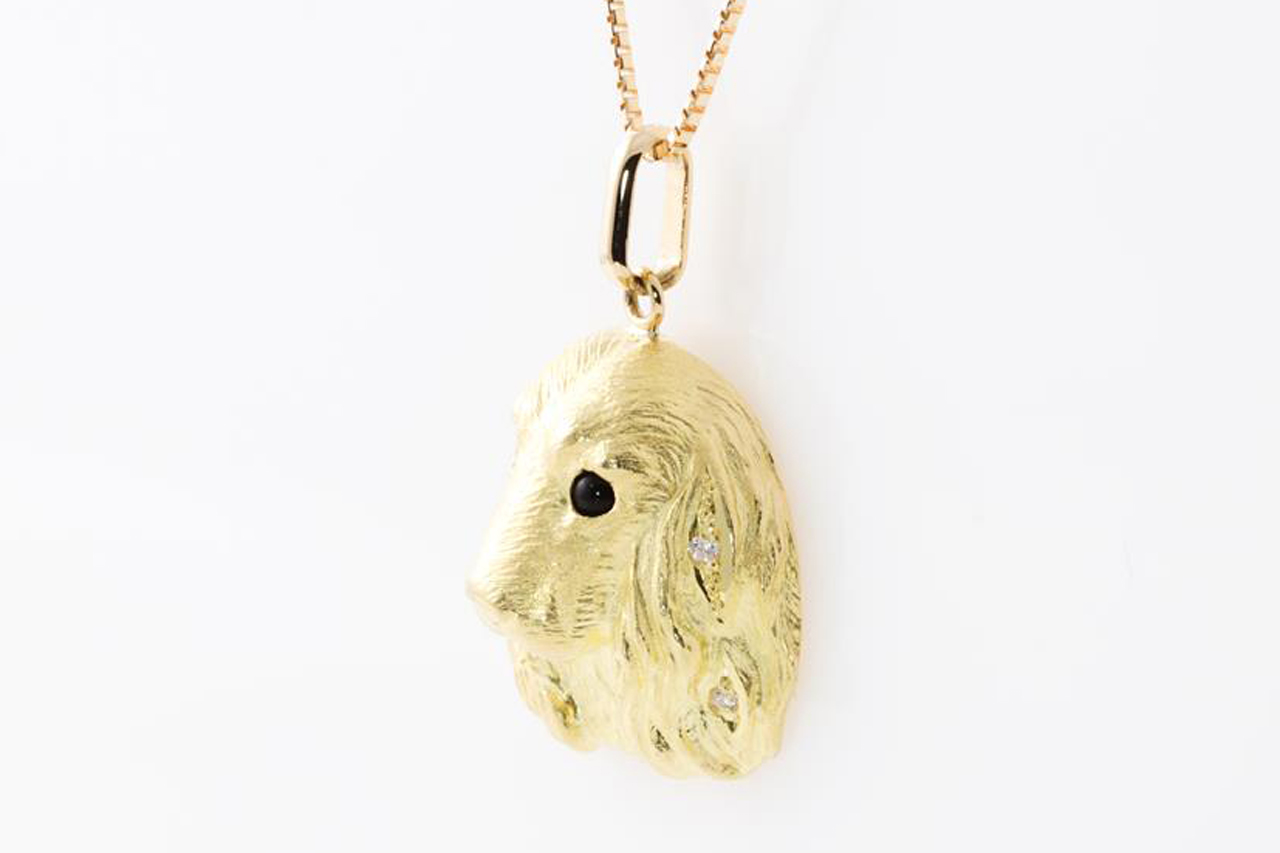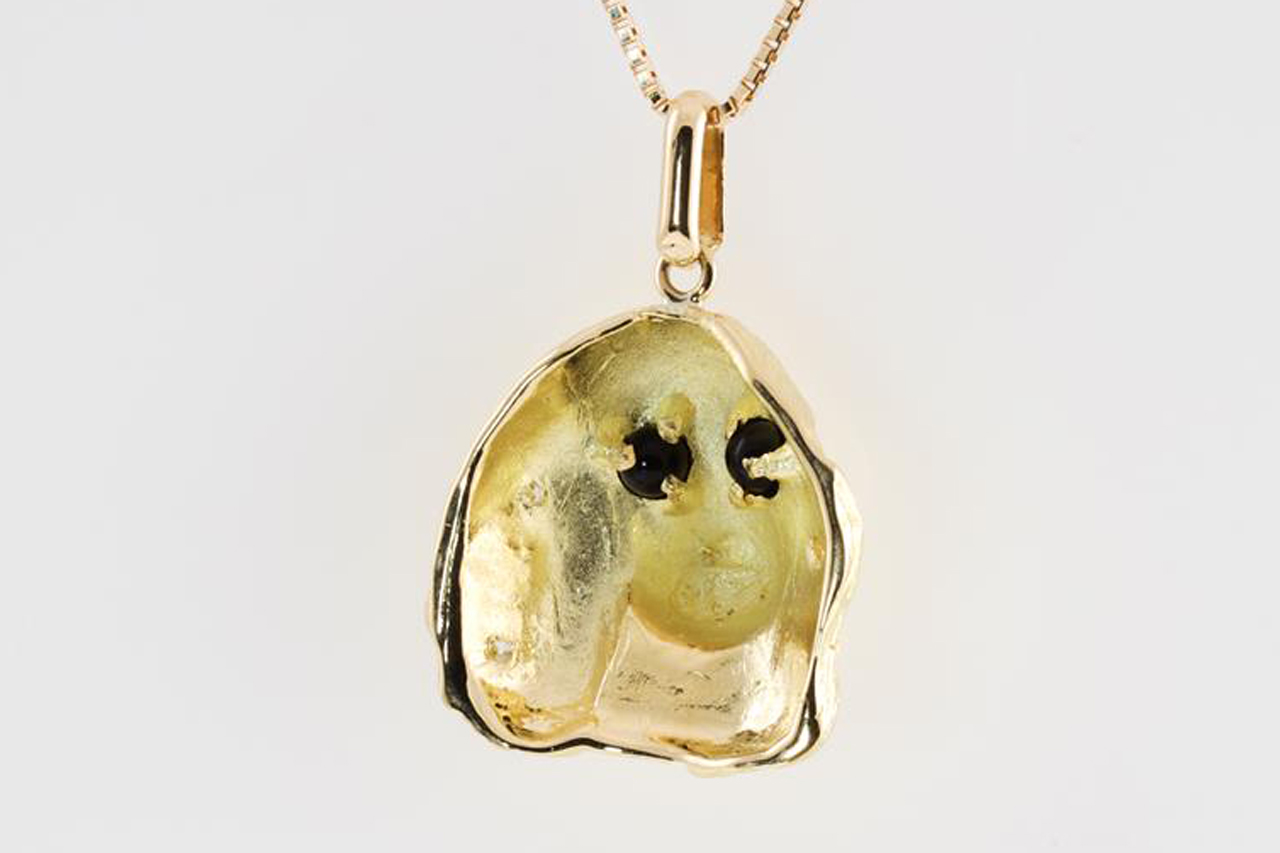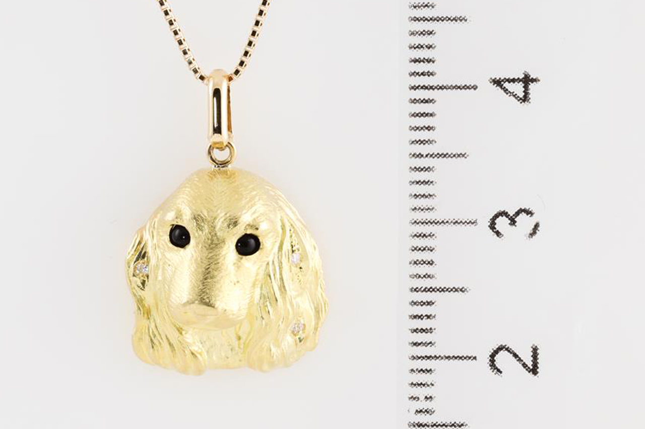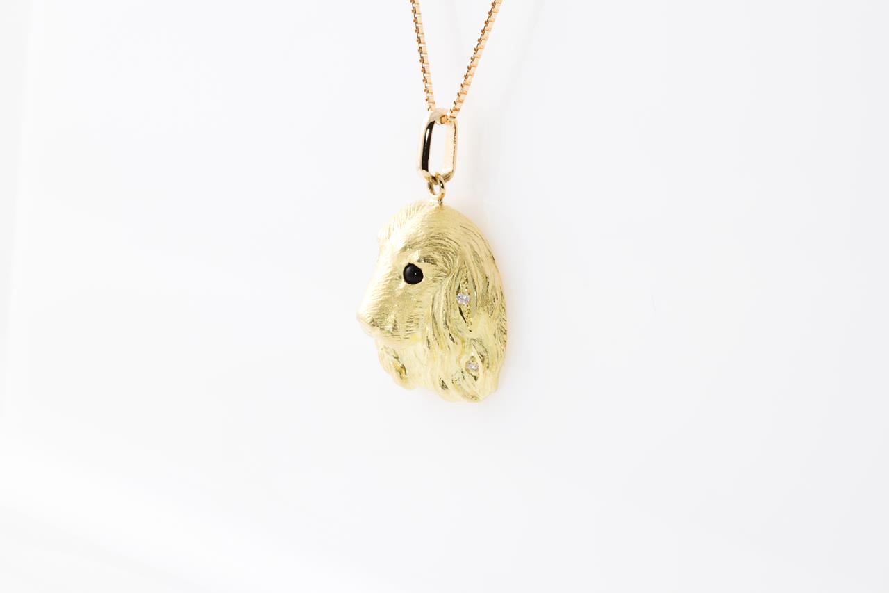 Dog design pendant with Onyx eyes and three Diamonds. 18ct yellow gold with 18ct gold 40cm chain. Weight: 5.0g (Pre-owned)