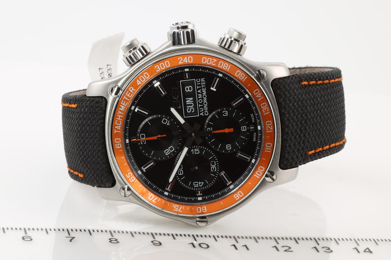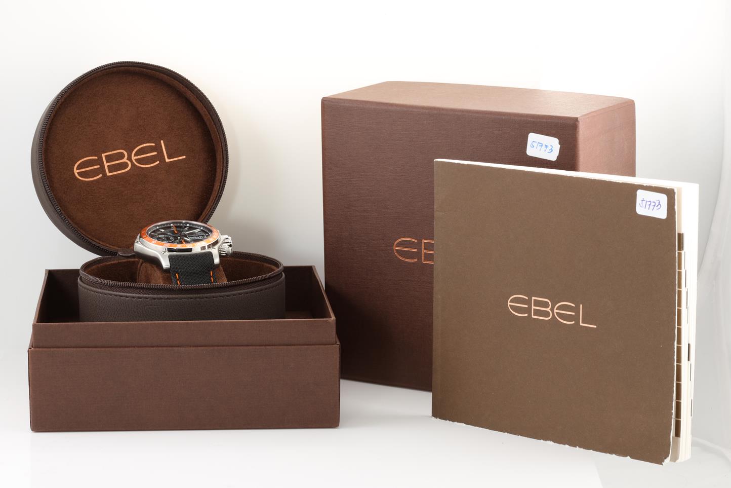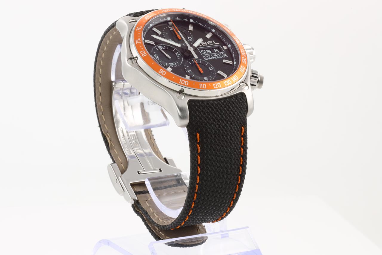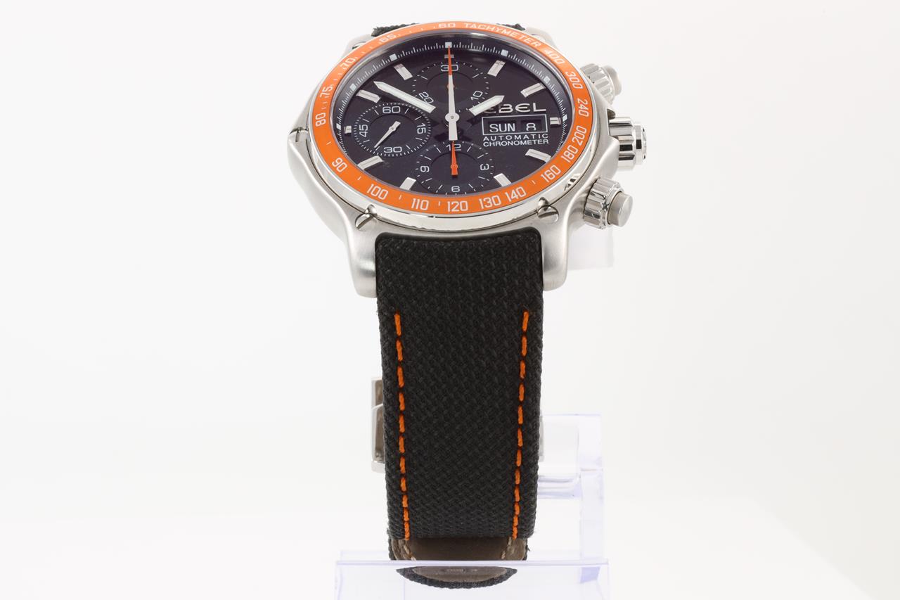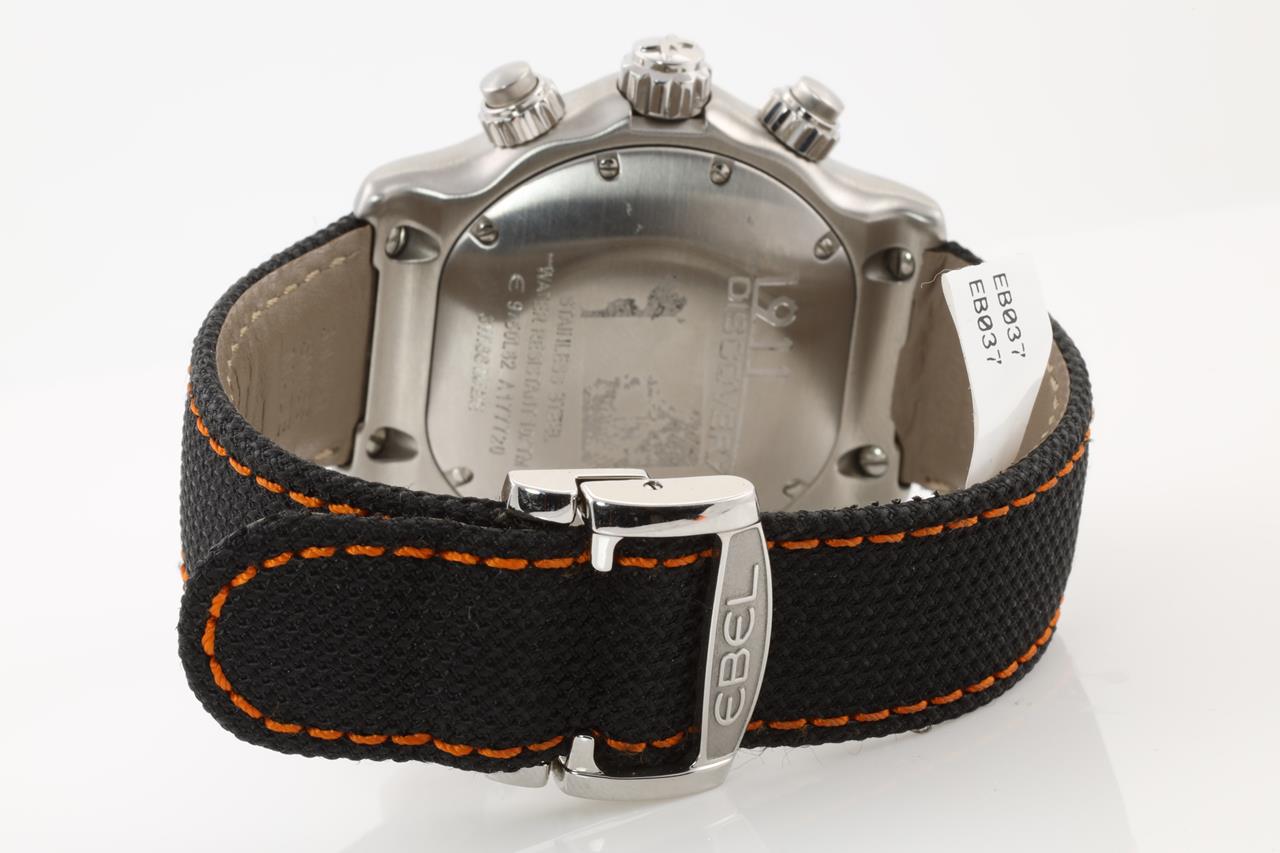 Ebel 1911 Discovery stainless steel automatic mens watch. Black with black guilloche subdials, day & date, case diameter: 43mm, Swiss made. Ref #1215889. With Ebel black with orange stitching leather and strap and clasp. Note: slight wear on strap due to being display stock. With Ebel instruction manual inside Ebel box. 3 month FSA warranty. (new)