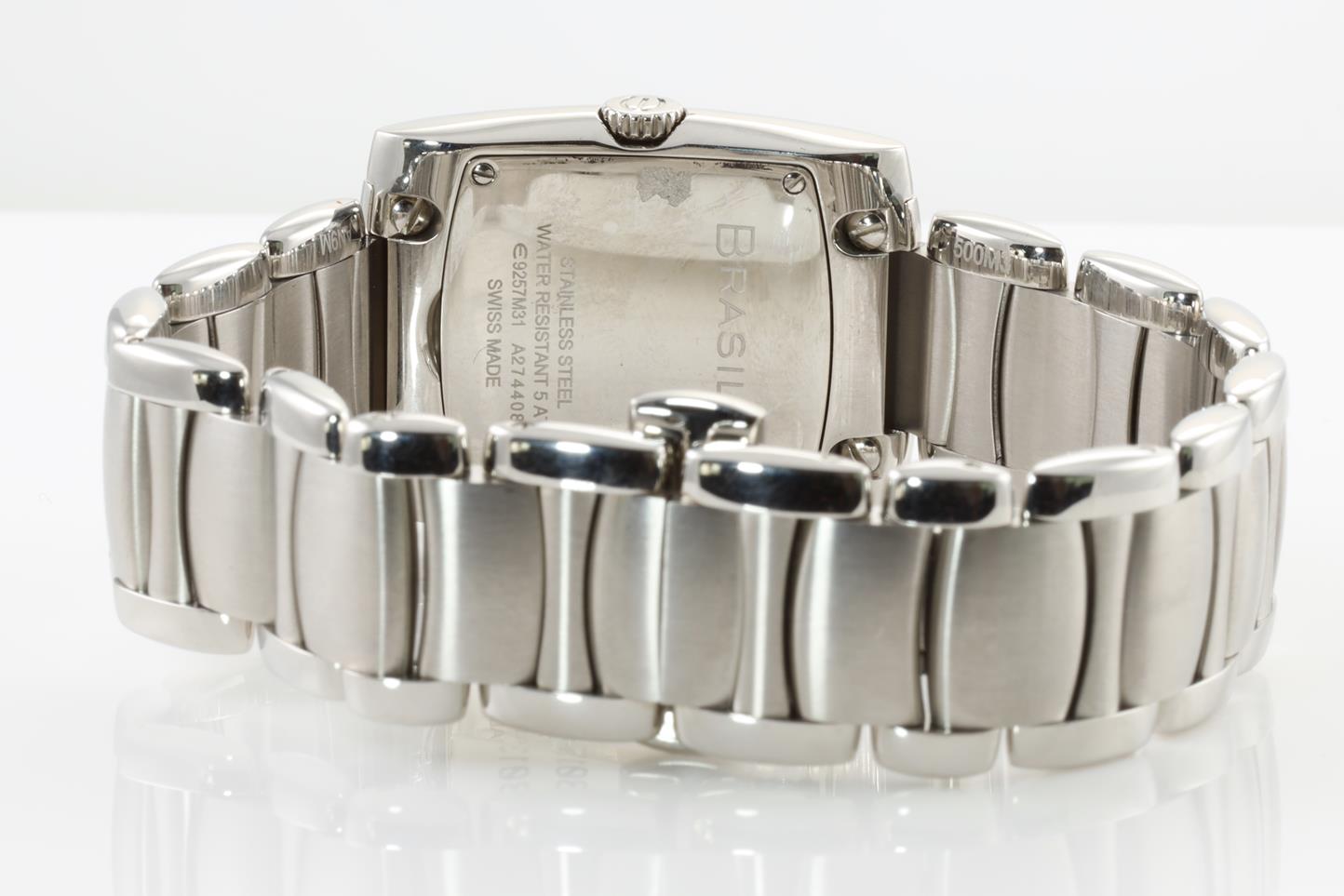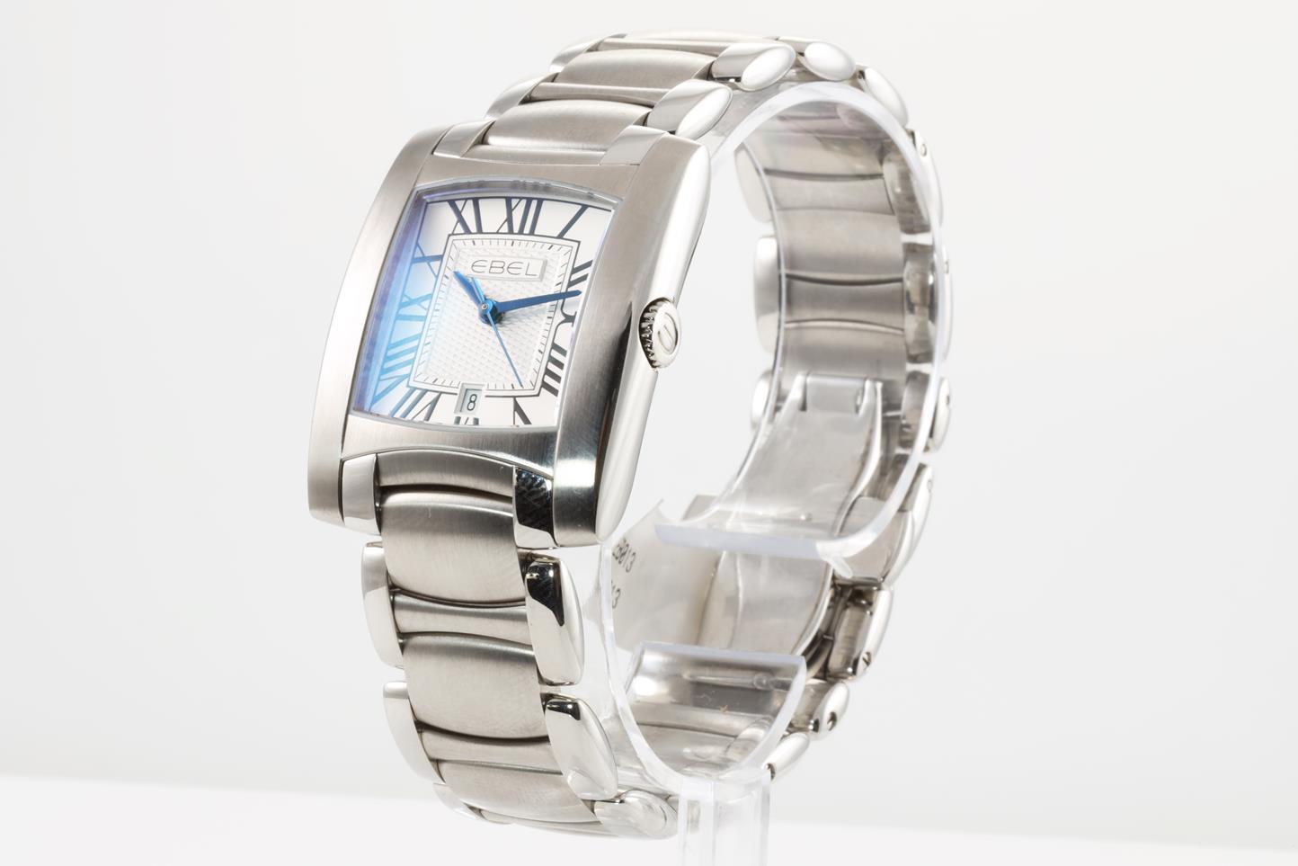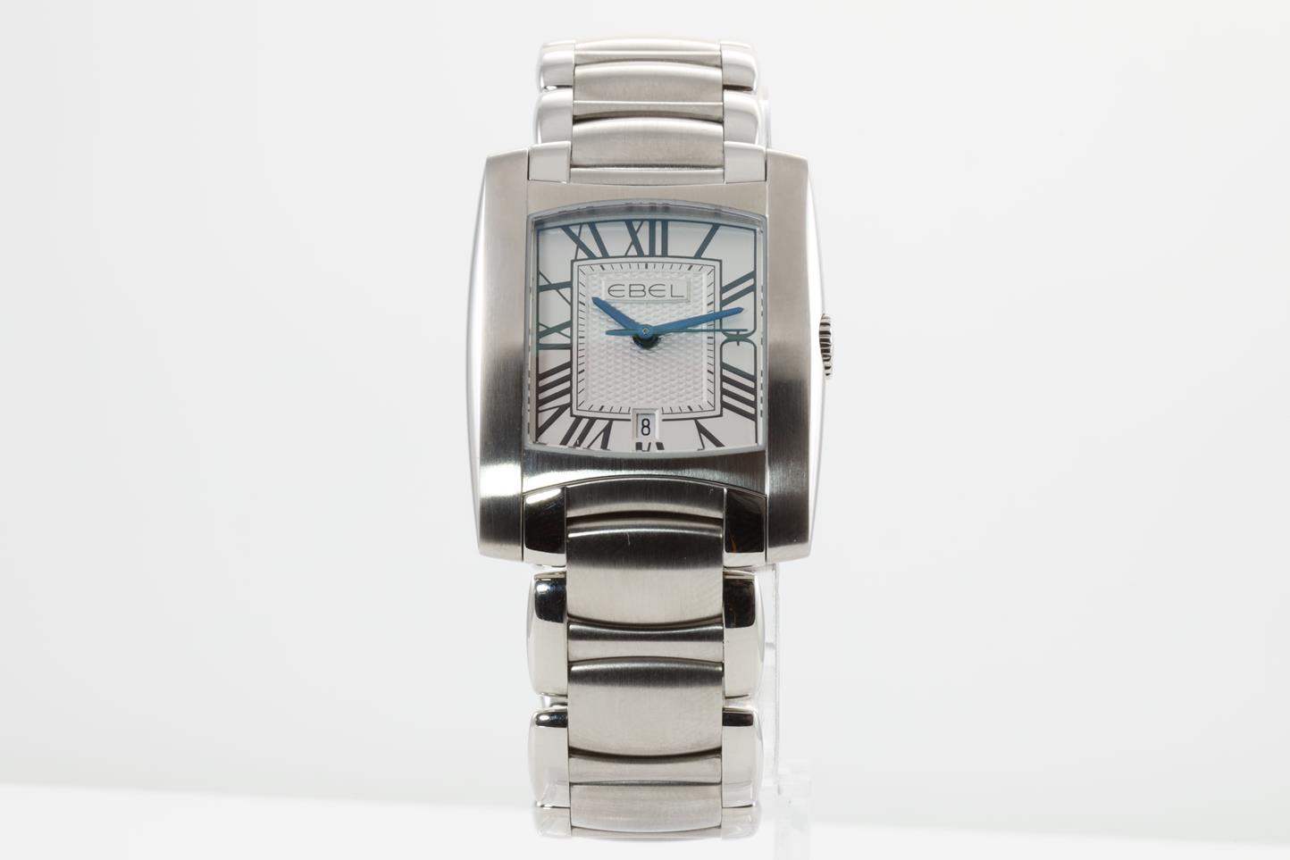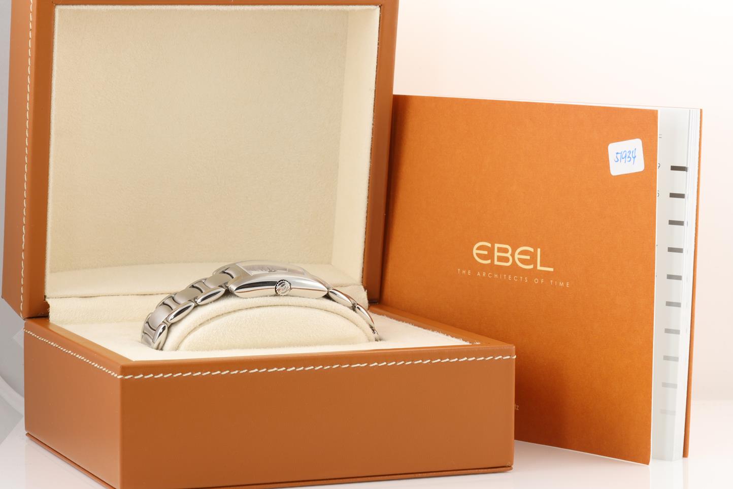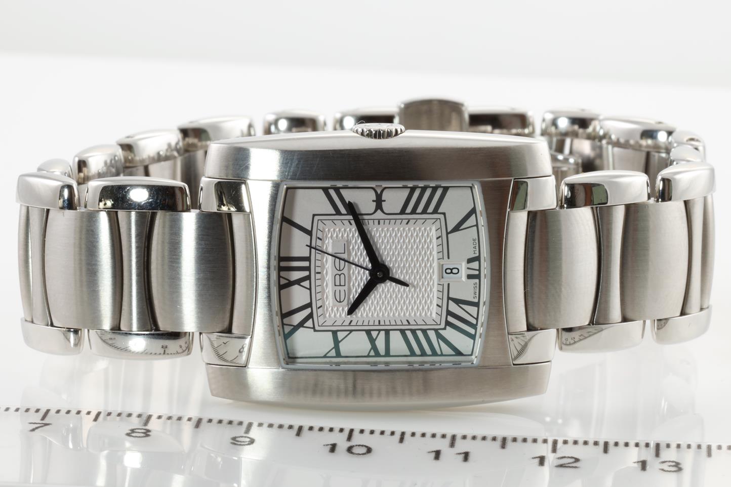 Ebel Brasilia stainless steel quartz ladies watch. Silver dial, date, case diameter: 34mm x 28mm, Swiss made. Ref #1216036. With Ebel stainless steel bracelet and clasp. With Ebel instruction manual inside Ebel box. 3 month FSA warranty. (New)