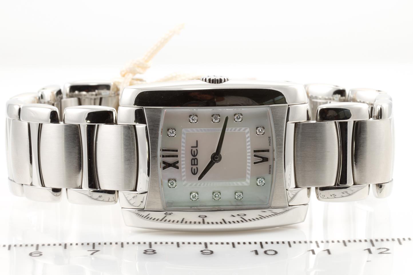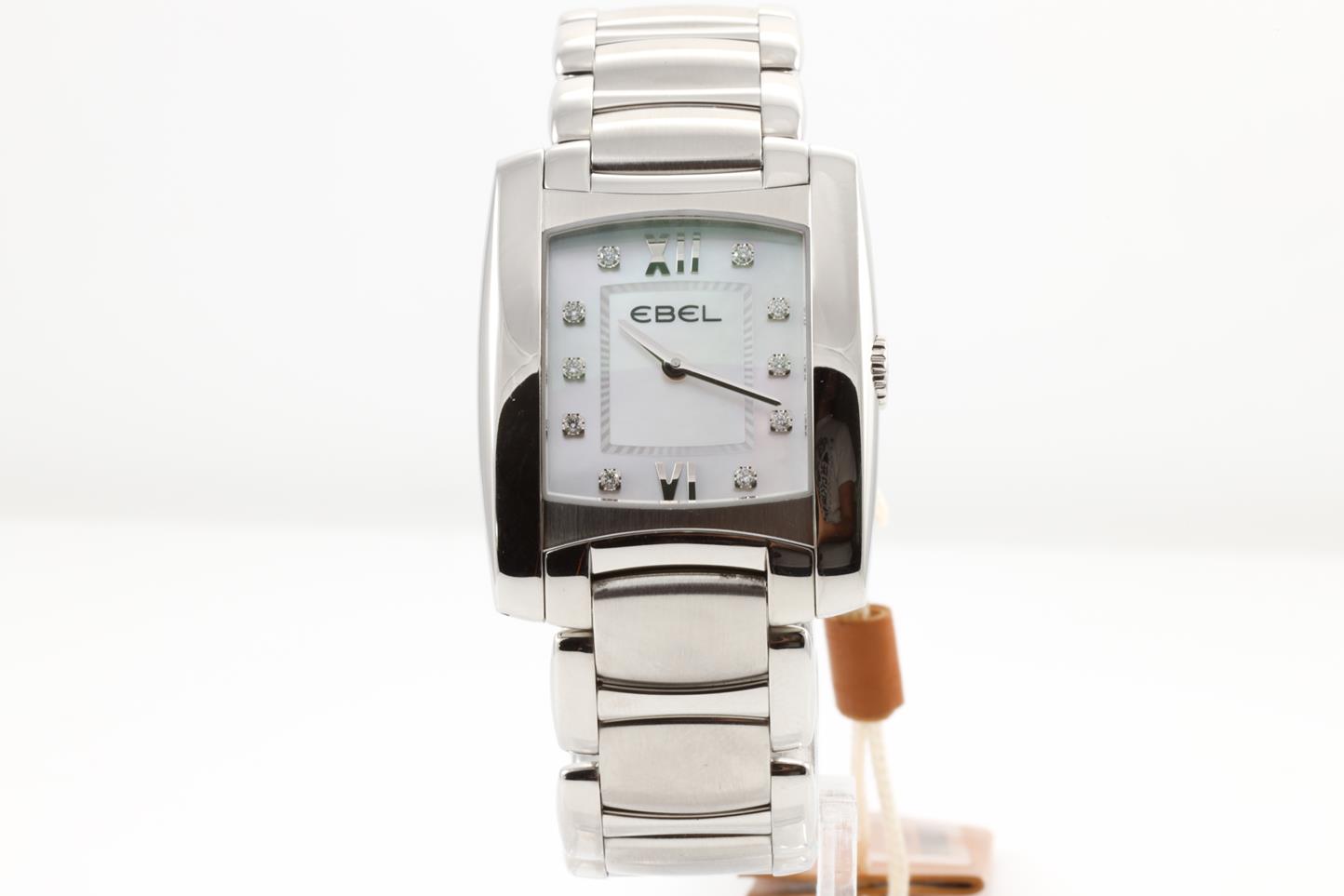 Ebel Brasilia stainless steel quartz ladies watch. Mother of Pearl dial, Diamond indicators, case diameter: 28mm, Swiss made. Ref #1215776. With Ebel stainless steel bracelet and clasp. Wit Ebel instruction manual inside Ebel box. 3 month FSA warranty. (New)