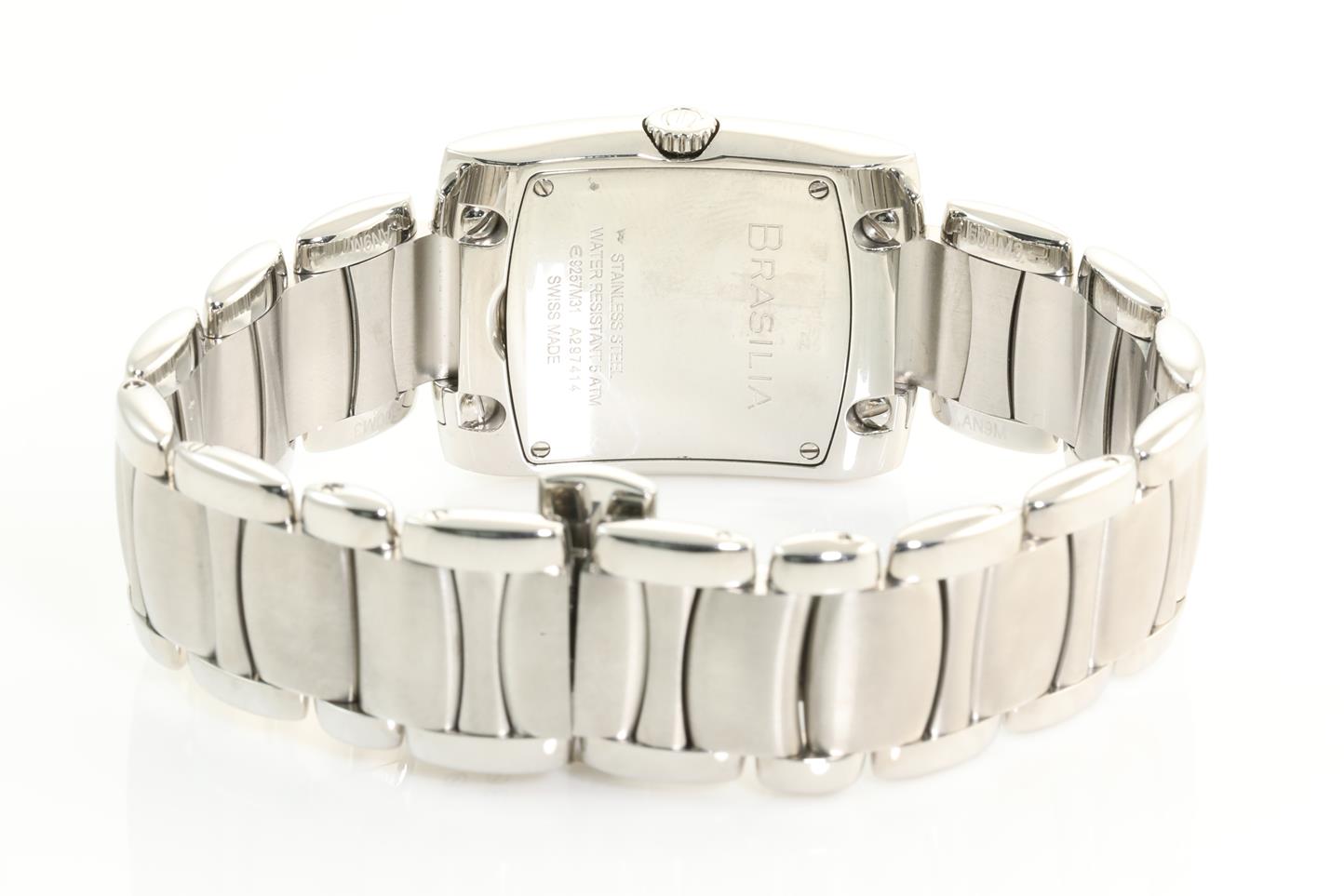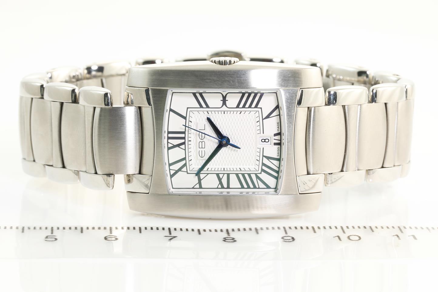 Ebel Brasilia stainless steel quartz ladies watch. Silver dial, date, case diameter: 34mm x 28mm, Swiss made. Ref #1216036. With Ebel stainless steel bracelet and clasp. With Ebel instruction manual inside Ebel box. 3 month FSA warranty. (New)