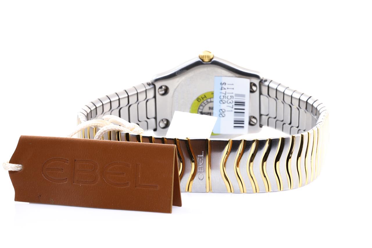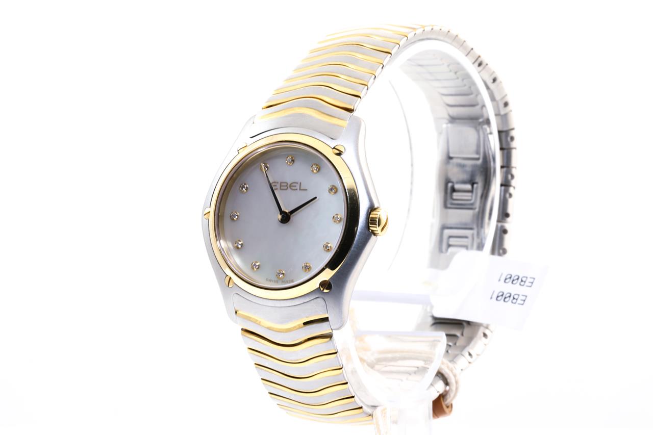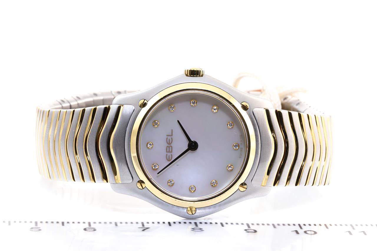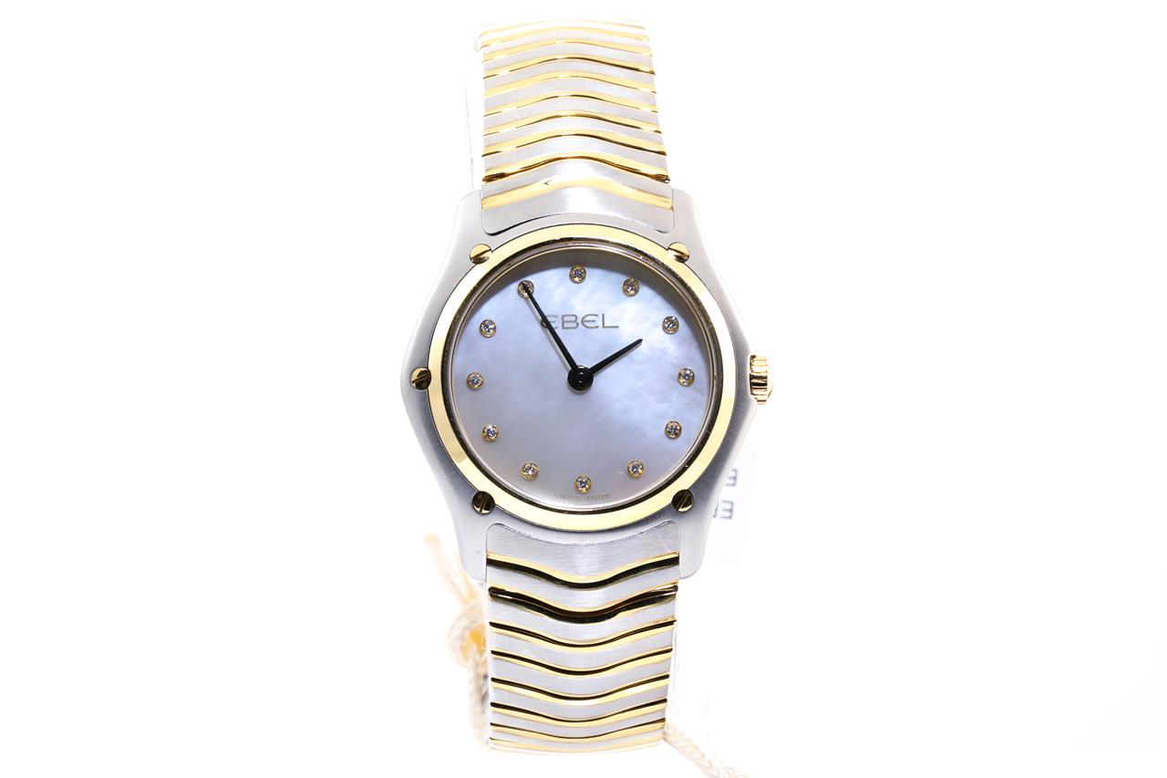 Ebel Classic 18ct yellow gold and stainless steel quartz ladies watch. Mother of Pearl dial, Diamond indicators, case diameter: 27mm, wrist size: 17.5cm, Swiss made. Ref #1215371. With Ebel two-tone bracelet and clasp. Note: minor scratches due to being display stock. With Ebel instruction manual. 3 month FSA warranty. (New)