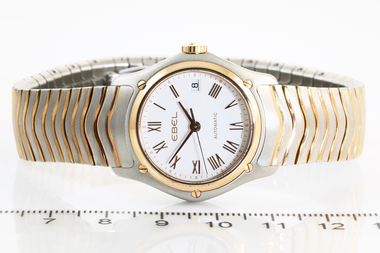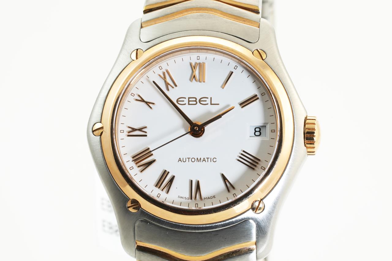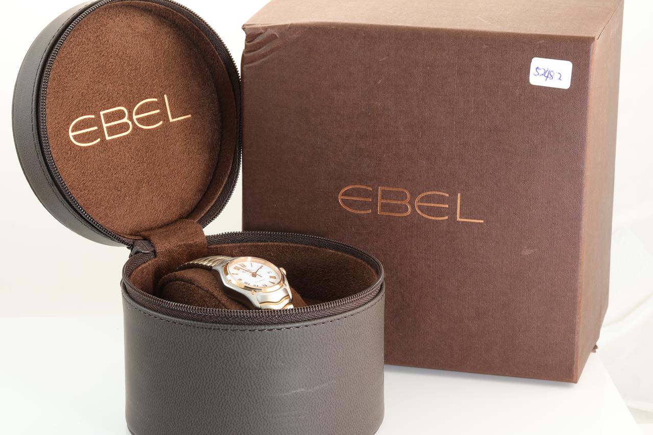 Ebel Classic 18ct rose gold and stainless steel quartz ladies watch. White dial, date, case diameter; 27mm, wrist size: 17.5cm, Swiss made. Ref #1215926. With Ebel two-tone wave bracelet and clasp. With Ebel instruction manual inside Ebel box (outer box damaged). 3 month FSA warranty. (New)