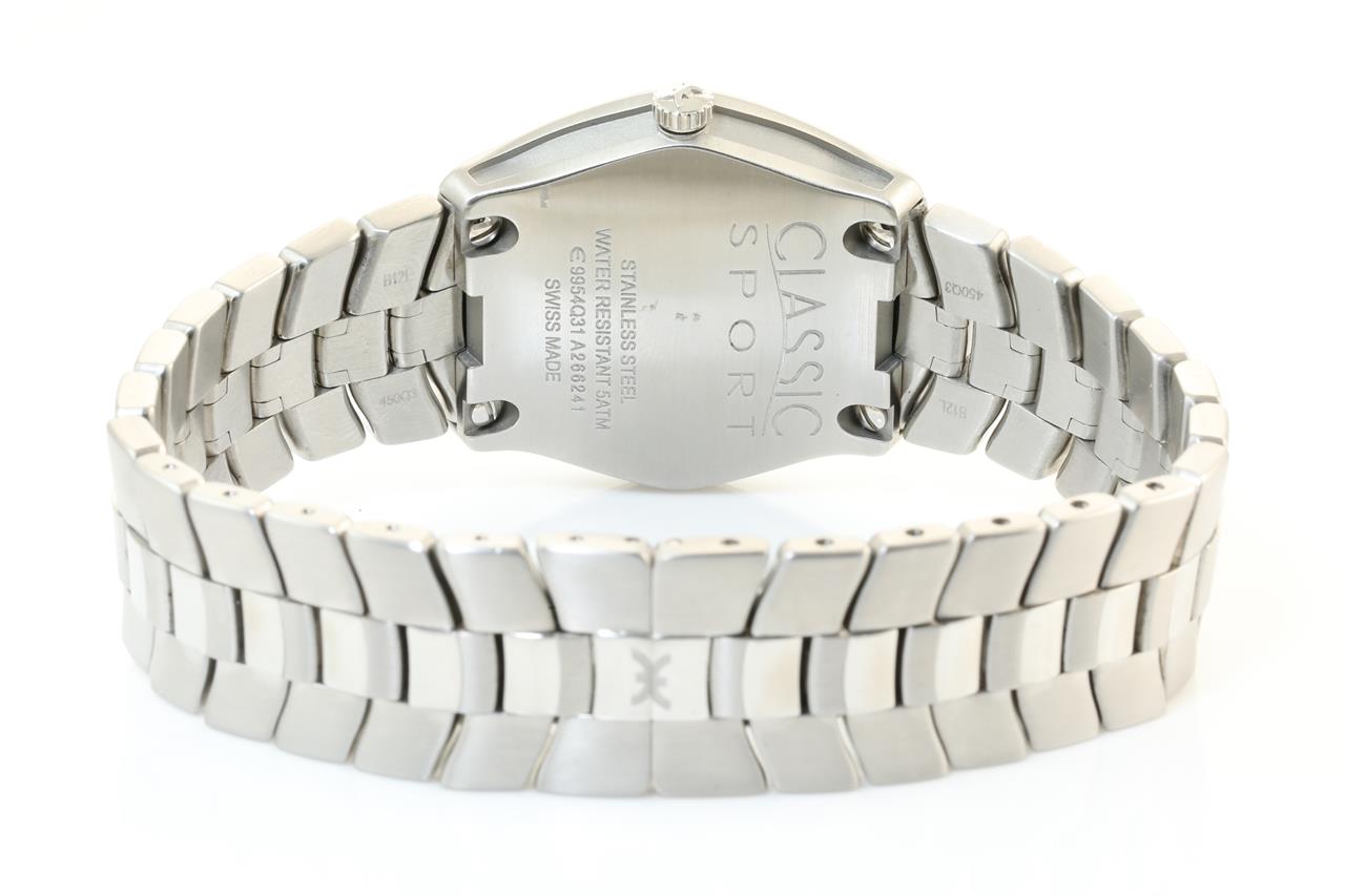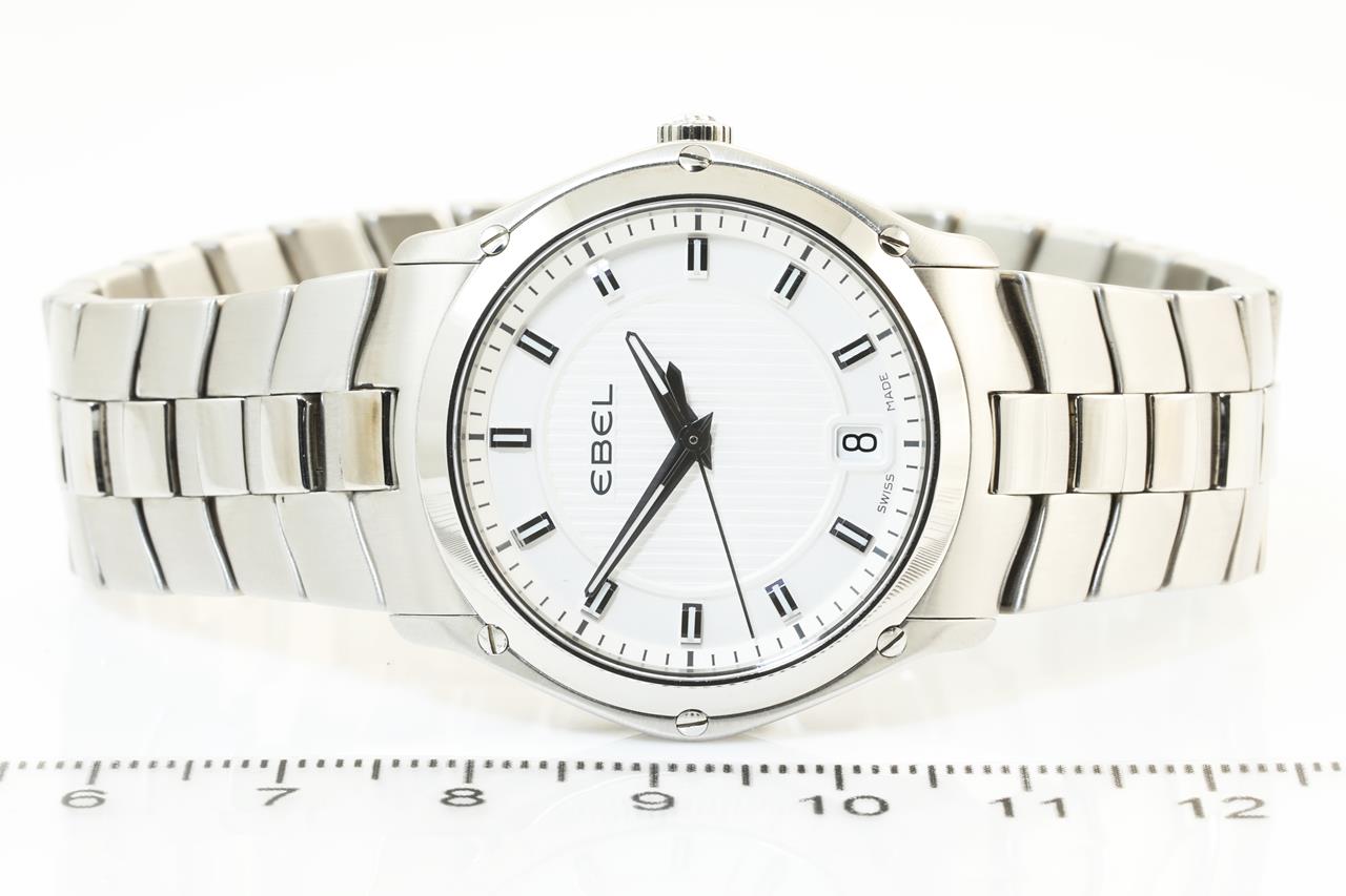 Ebel Classic Sport Grande stainless steel quartz ladies watch. Silver with centre linear design dial, date, case diameter: 32mm wrist size: 17cm, Swiss made. Ref #1216017. With Ebel stainless steel bracelet and clasp. With Ebel instruction manual inside Ebel box. 3 month FSA warranty. (New)