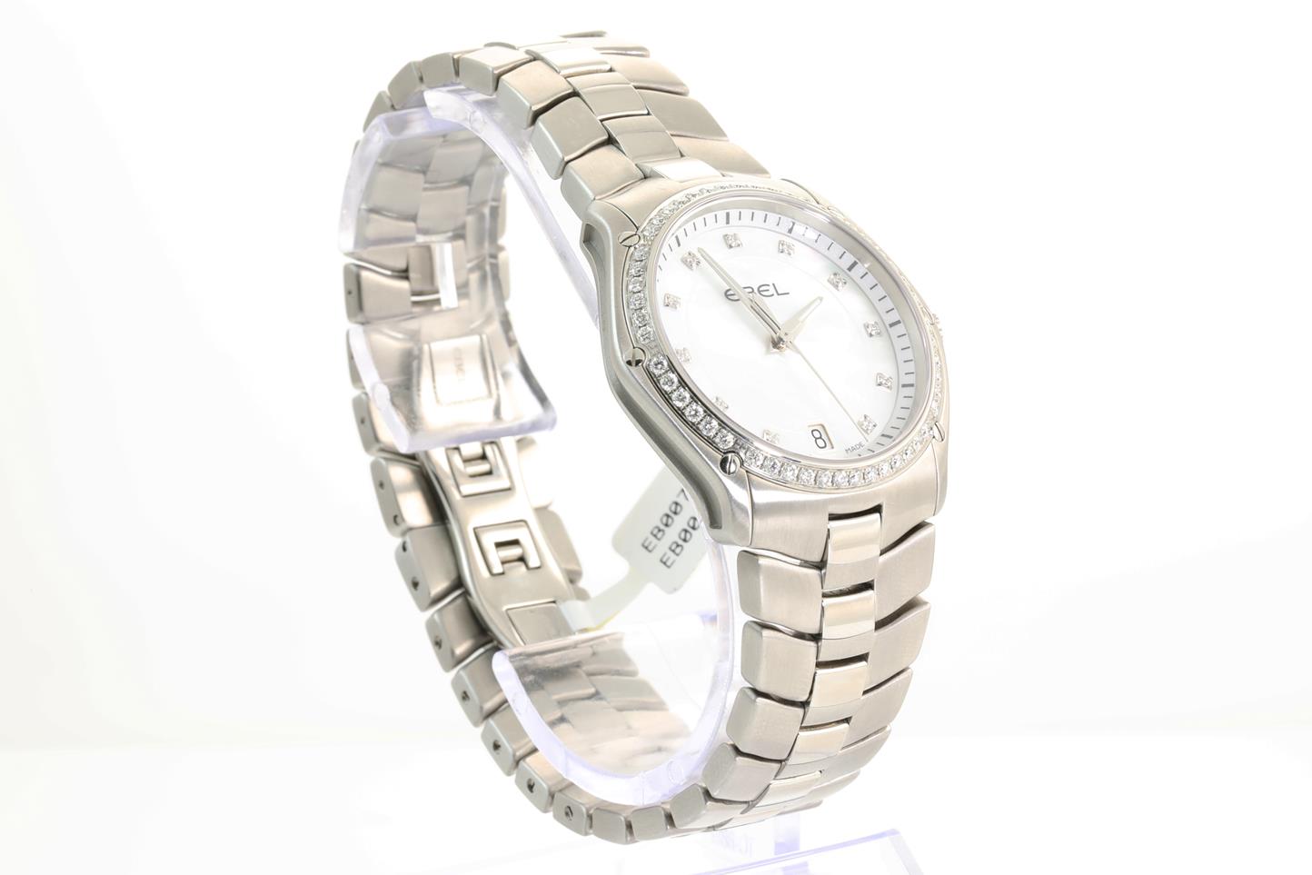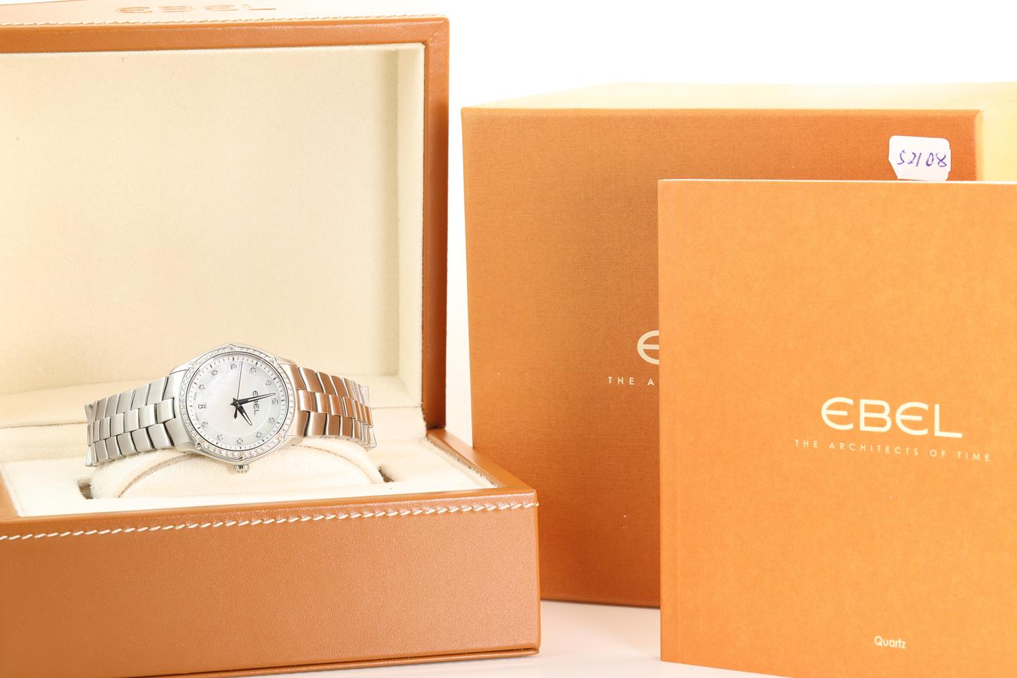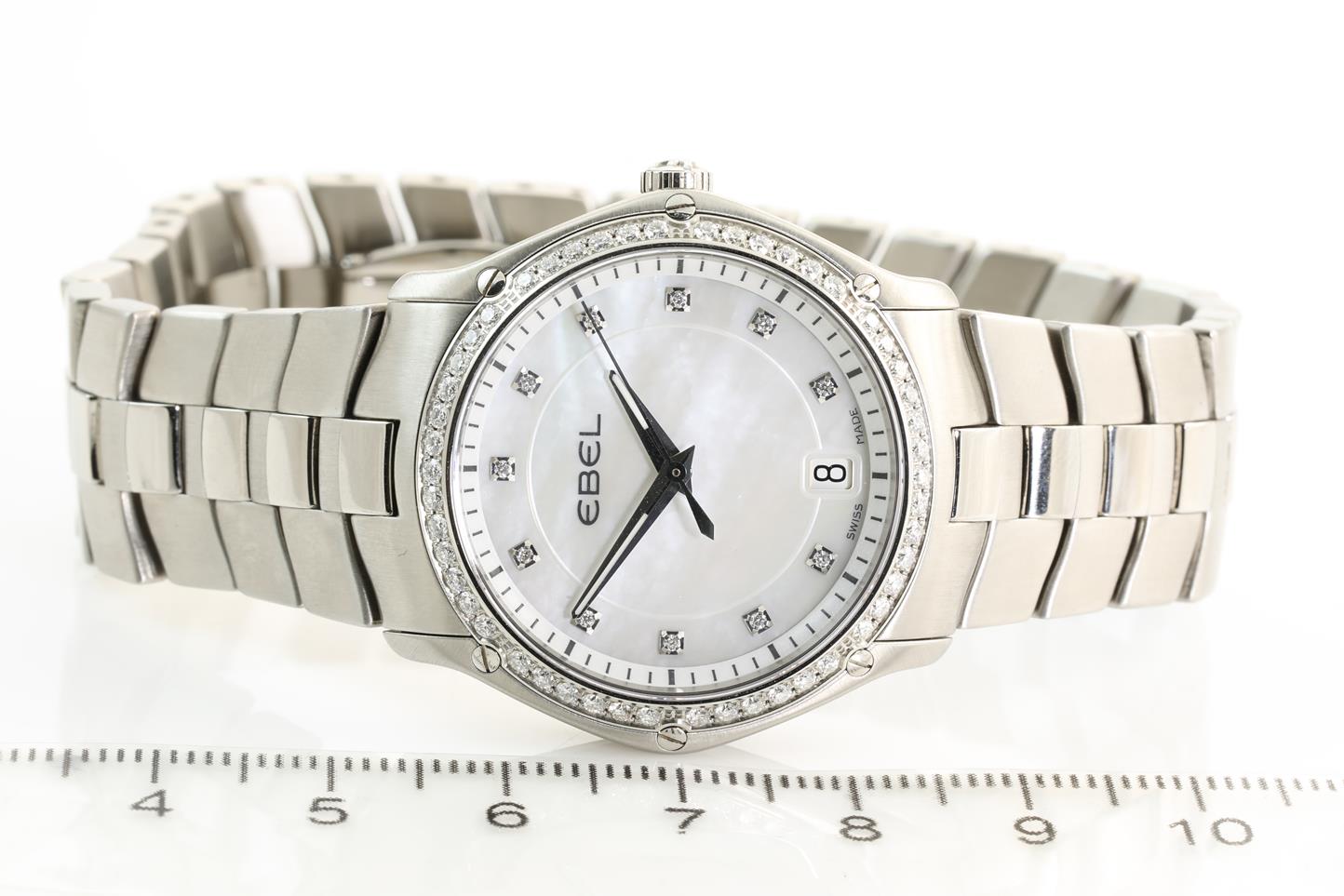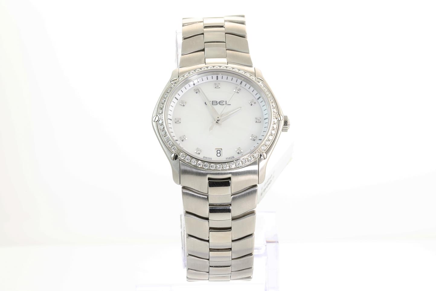 Ebel Classic Sport stainless steel quartz ladies watch. Mother of Pearl dial, Diamond set bezel, Diamond indicators, date, case diameter: 32mm, Swiss made. Ref #1215987. With Ebel stainless steel bracelet and clasp. With Ebel instruction manual inside Ebel box. 3 month FSA warranty. (New)