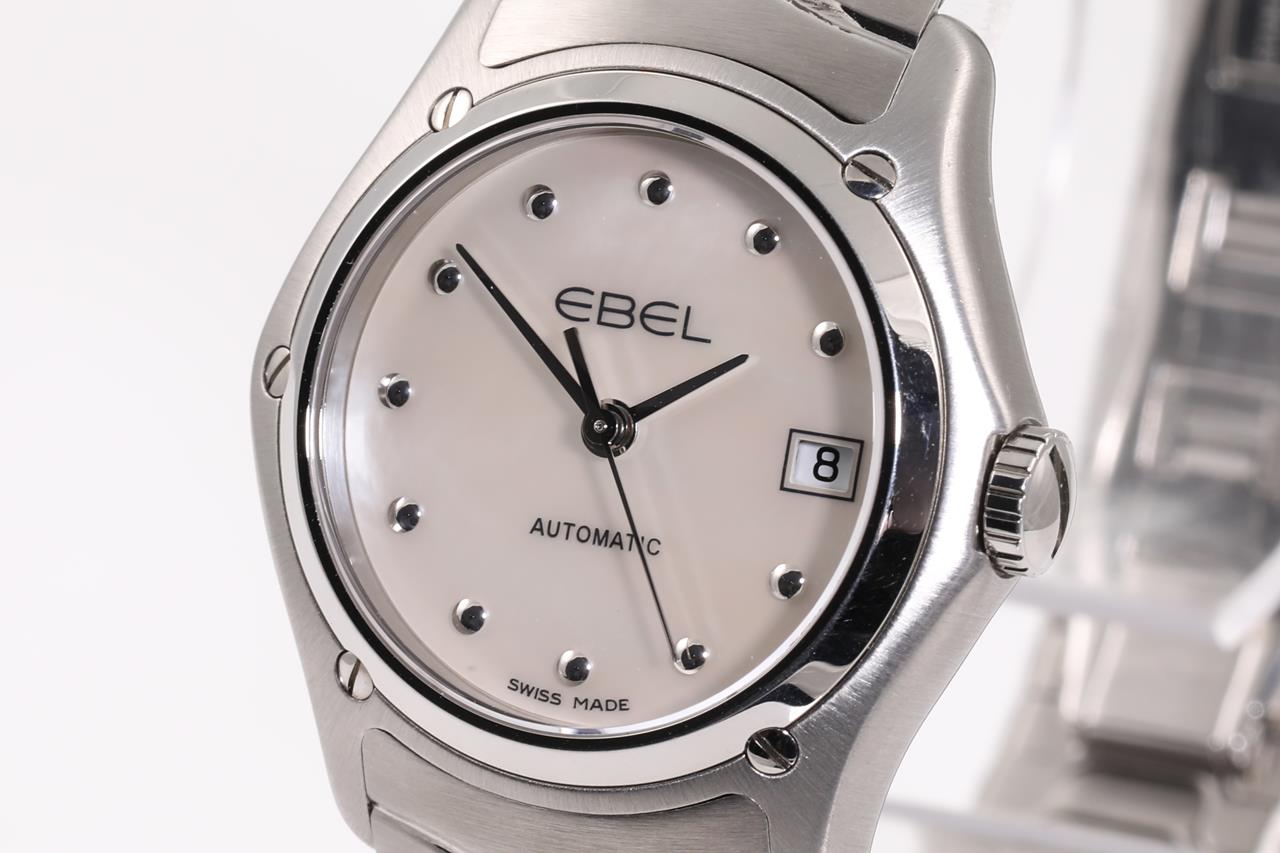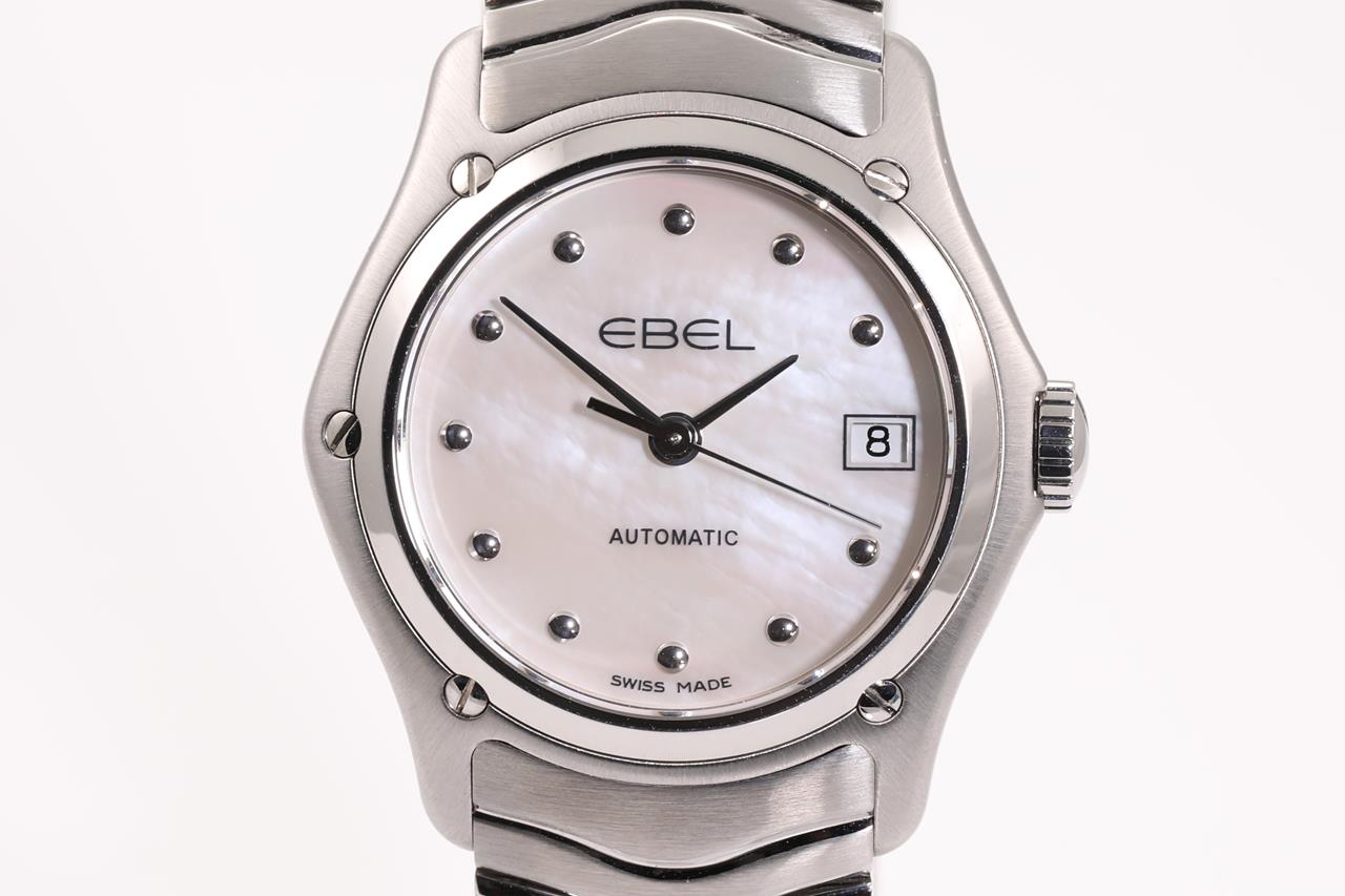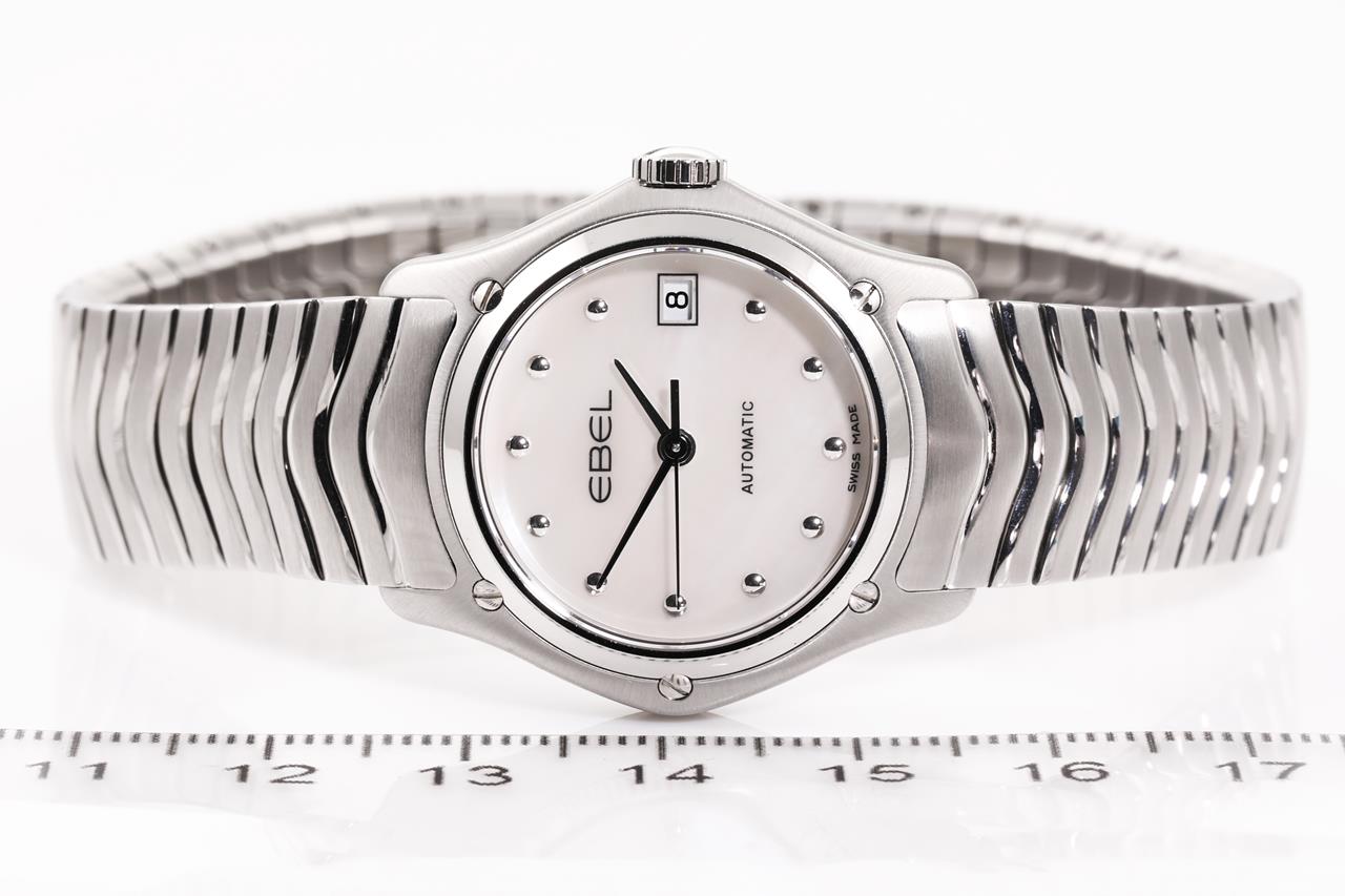 Ebel Classic Wave stainless steel automatic ladies watch. Mother of Pearl dial, date, case diameter: 27mm, wrist size: 17.5cm, Swiss made Ref# 1216174. With Ebel stainless steel bracelet and clasp. With Ebel damaged box. 3 month FSA warranty. (As New)