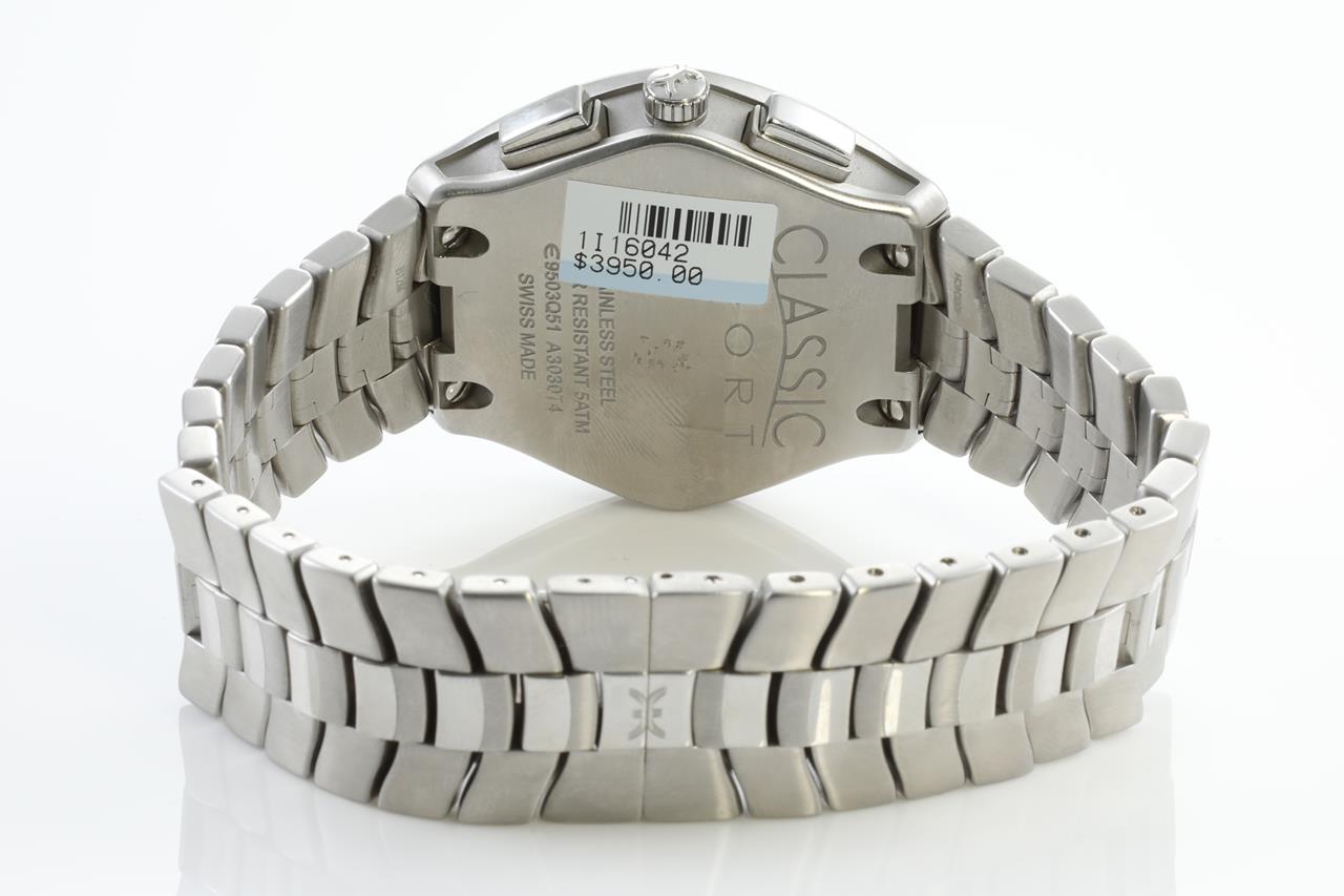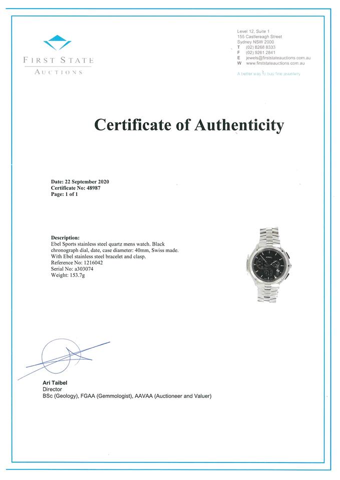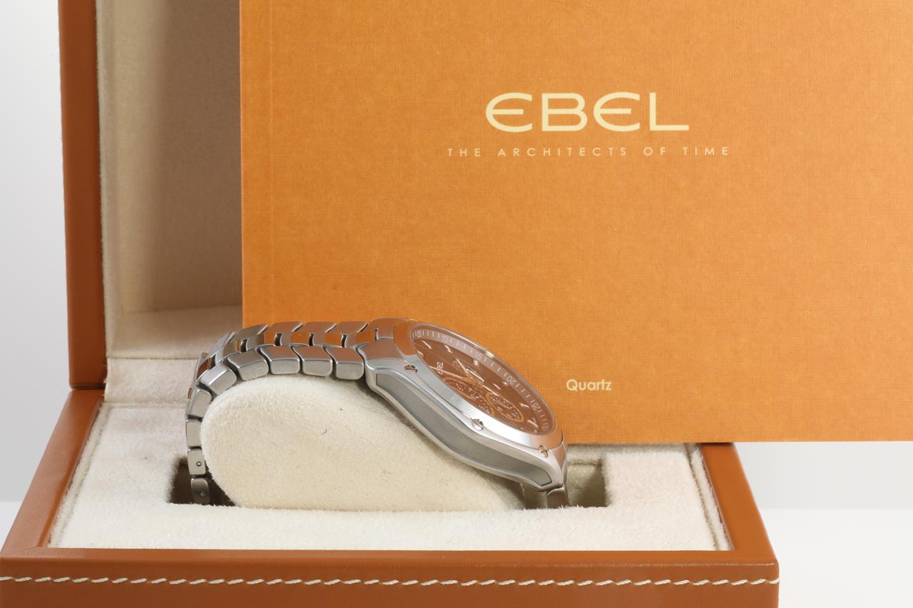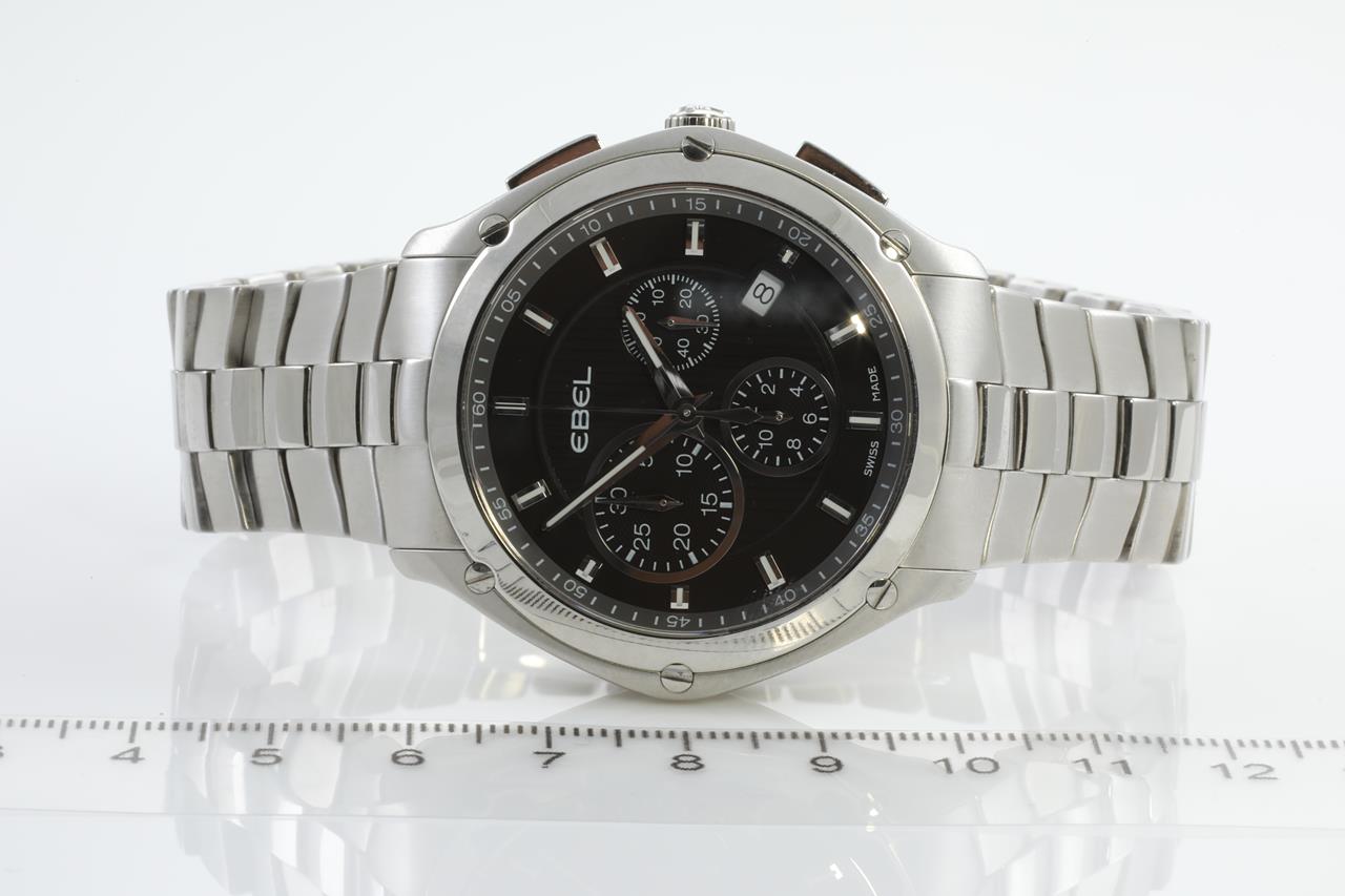 Ebel Sports stainless steel quartz mens watch. Black chronograph dial, date, case diameter: 40mm, Swiss made. Ref# 1216042. With Ebel stainless steel bracelet and clasp. With Ebel instruction manual inside box. With FSA certificate of authenticity. Manufacturers warranty card not supplied, 3 month FSA warranty applies. (As New)