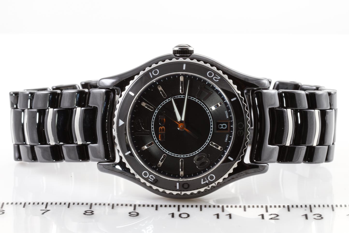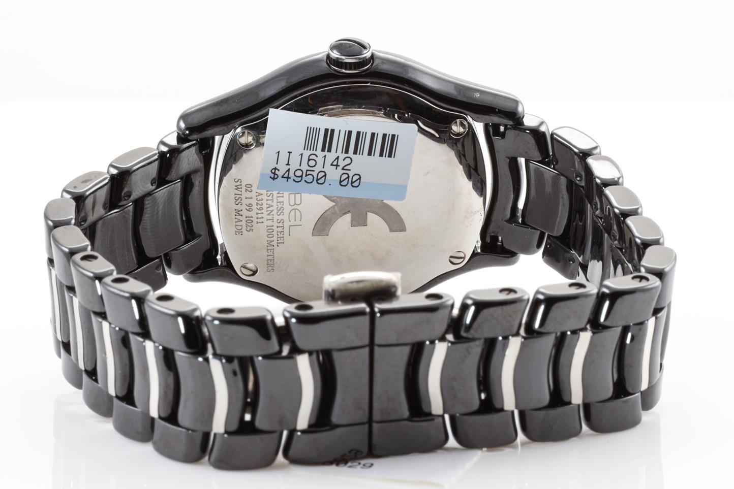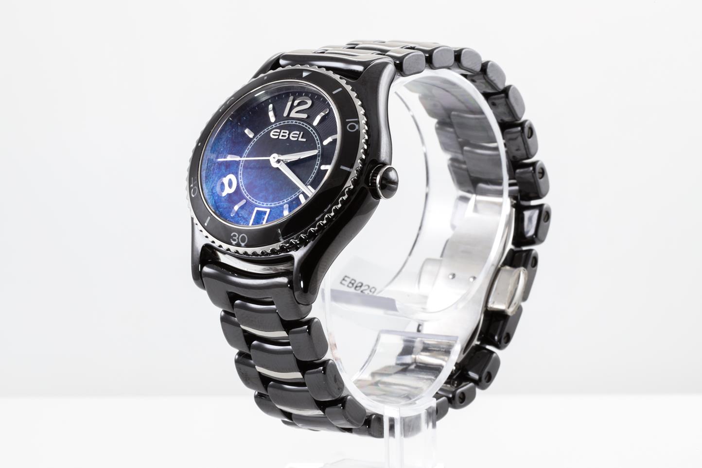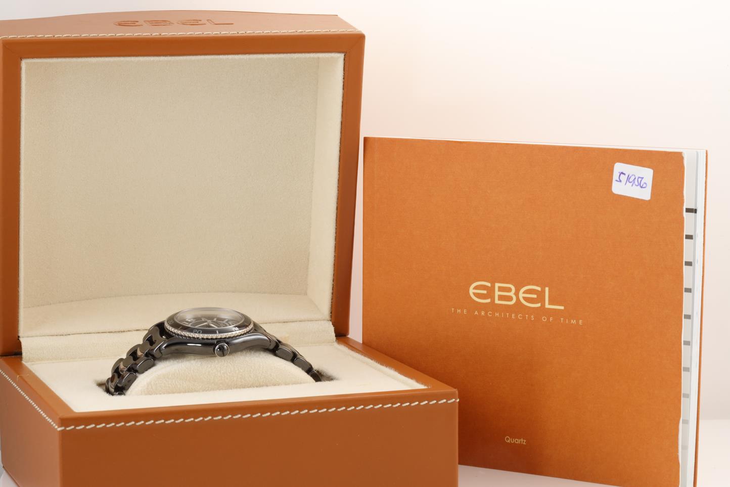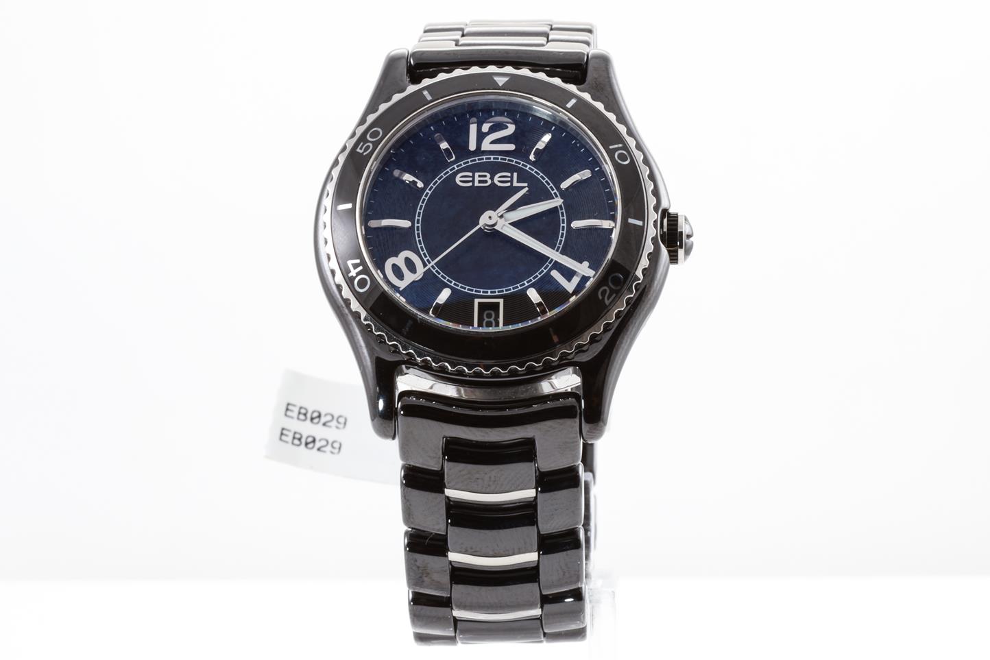 Ebel X-1 black ceramic quartz ladies watch. Black dial, date, case diameter: 34mm, Swiss made. Ref #1216142. With Ebel bracelet and clasp. Note minor scratches on back case due to being display stock. With Ebel instruction manual inside box. 3 month FSA warranty. (New)