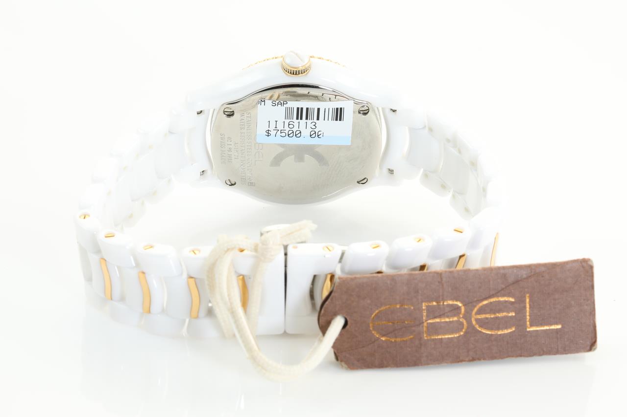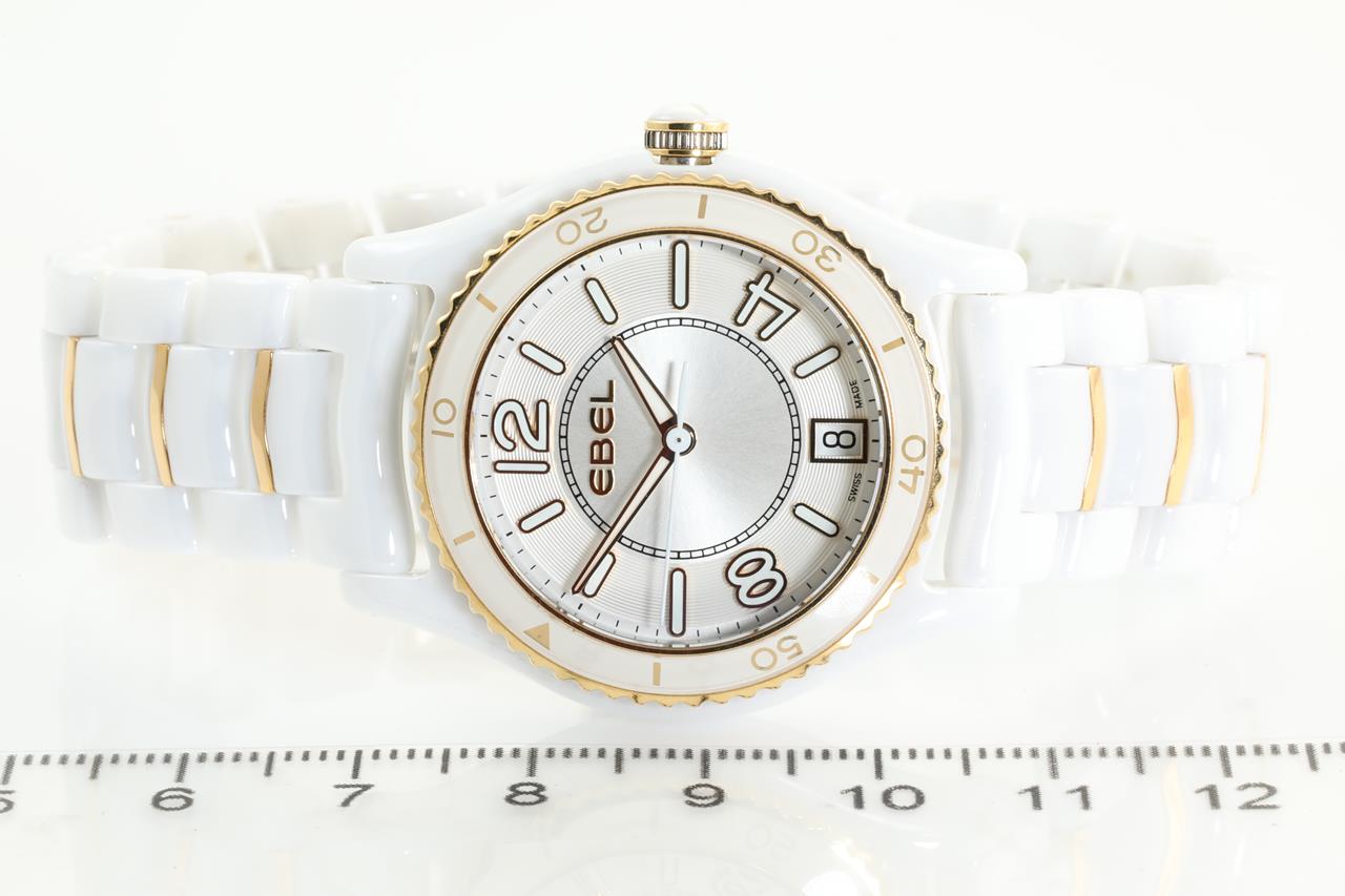 Ebel X-1 ceramic and 18ct rose gold quartz ladies watch. Silver galvanic dial, date, case diameter: 34mm, wrist size: 17cm, Swiss made. Ref #1216113. With Ebel two-tone bracelet and clasp. With Ebel instruction manual. 3 month FSA warranty. (New)