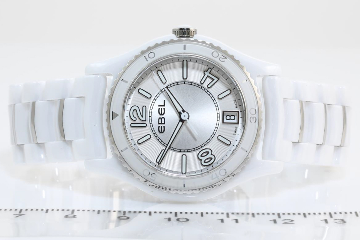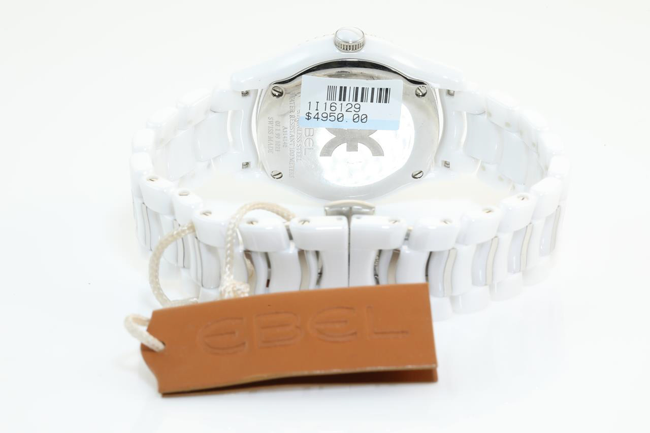 Ebel X-1 white ceramic quartz ladies watch. Silver dial, date, case diameter: 34mm, wrist size: 16cm, Swiss made. Ref #1216129. With Ebel ceramic bracelet and clasp. With instruction manual. 3 month FSA warranty. (New)