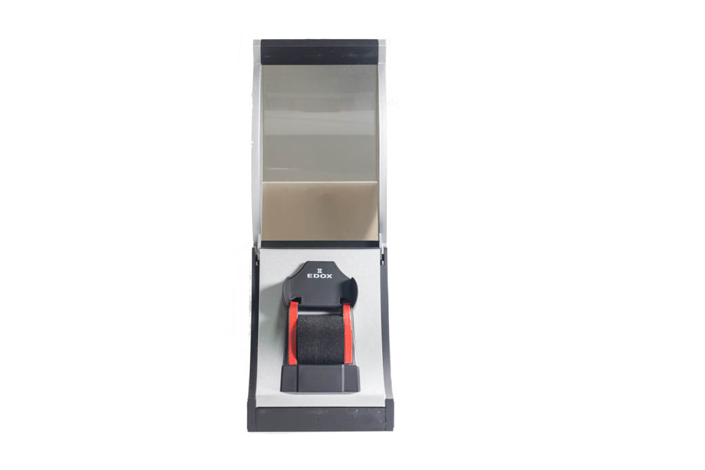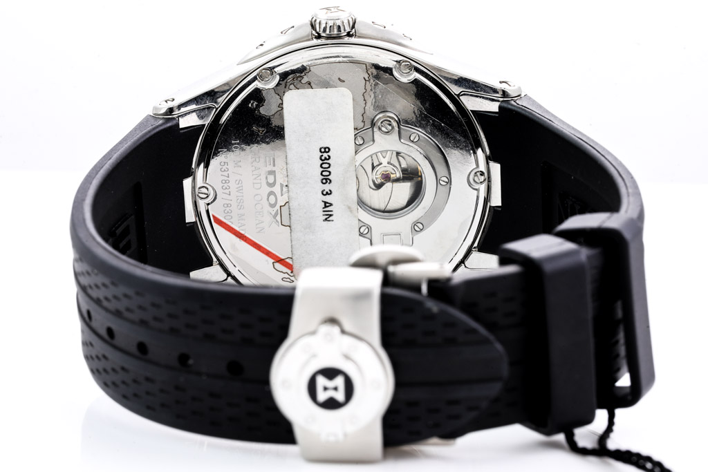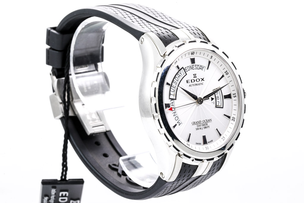 Edox Grand Ocean stainless steel automatic men's watch. Silver dial, day & date, case diameter: 45mm, adjustable max wrist size: 20.5cm, Swiss made. Ref# 830063AIN. With Edox black rubber strap and clasp. With Edox International Warranty card and Edox box. Edox 2-Year warranty applies. (As new, Note: minor scratches on case due to being display stock)