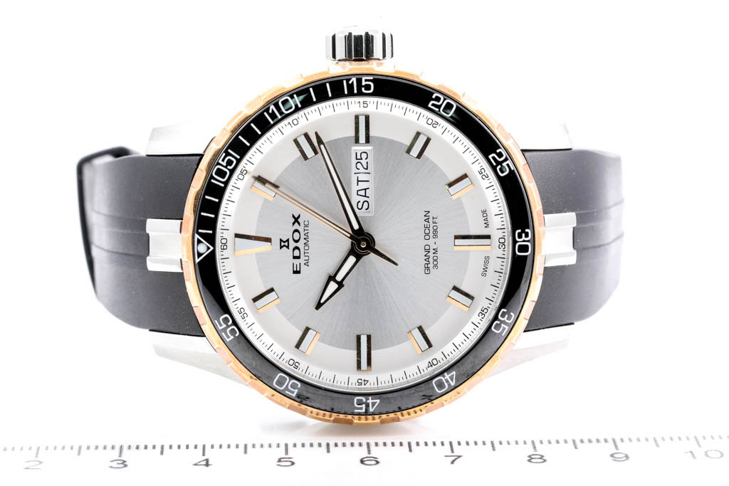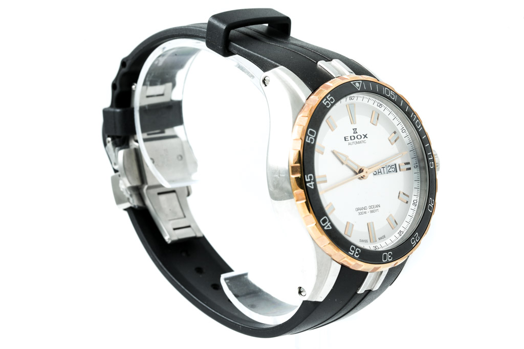 Edox Grand Ocean gold tone and stainless steel automatic mens watch. Silver dial, day & date, approximate case diameter: 45cm, adjustable max wrist size: 21cm, Swiss made. Ref# 88002357RCAIR. With Edox International Warranty card and Edox box. Edox 2 year warranty applies. (As New, Note: scratches on case due to being display stock)
