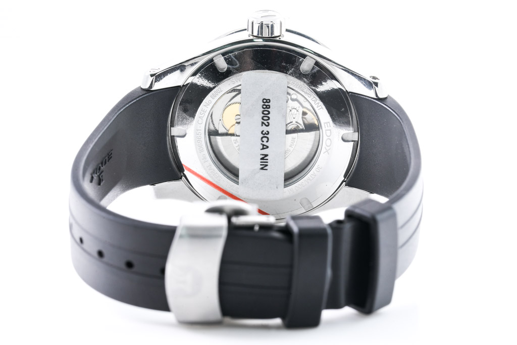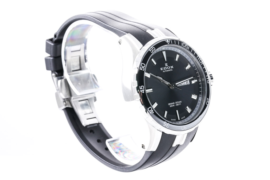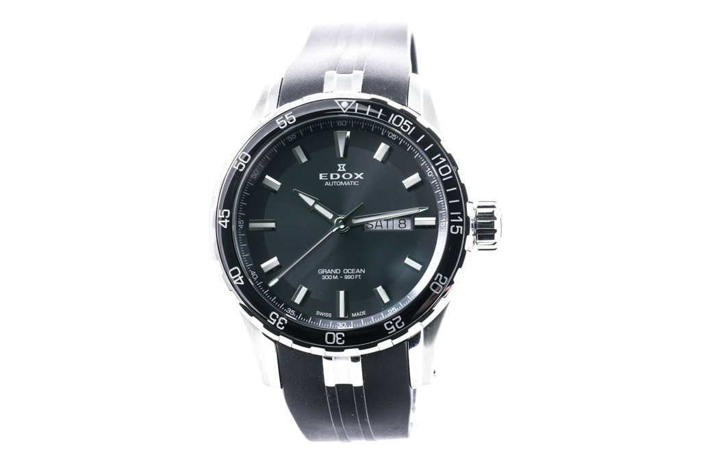 Edox Grand Ocean stainless steel automatic mens watch. Black dial, day & date, case diameter: 45cm, adjustable max wrist size; 21cm, Swiss made. Ref# 880023CNIN. With Edox black rubber strap and clasp. With Edox International Warranty card and Edox box. Edox 2 year warranty applies. (As New, Note: minor scratches on case and clasp due to being display stock)