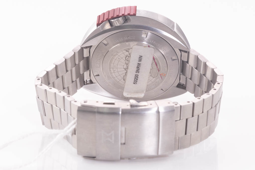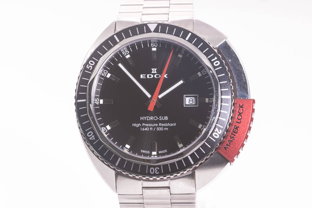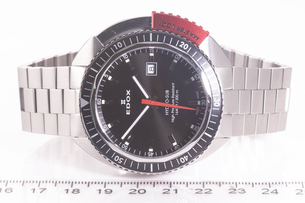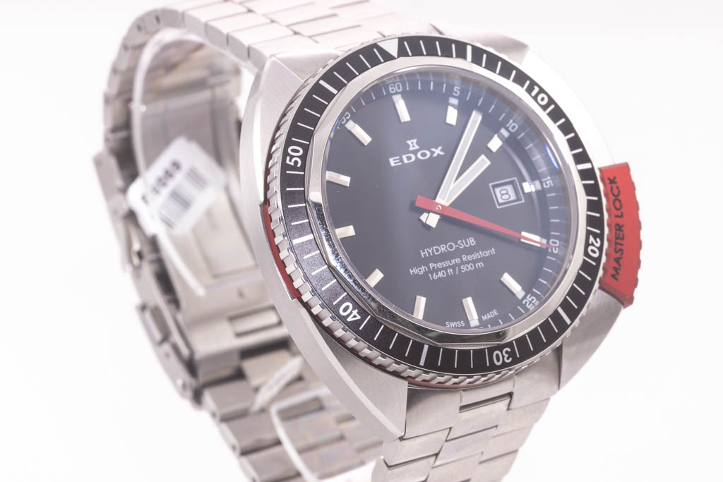 Edox Hydro-Sub stainless steel quartz men's watch. Black dial, case diameter: 44mm, wrist size: 19.5cm, Swiss made. Ref# 532003NRMNIN. With Edox stainless steel bracelet and clasp. With Edox International Warranty card and Edox box. Edox 2-Year warranty applies. (As New, Note: minor scratches on case and bracelet due to display stock)