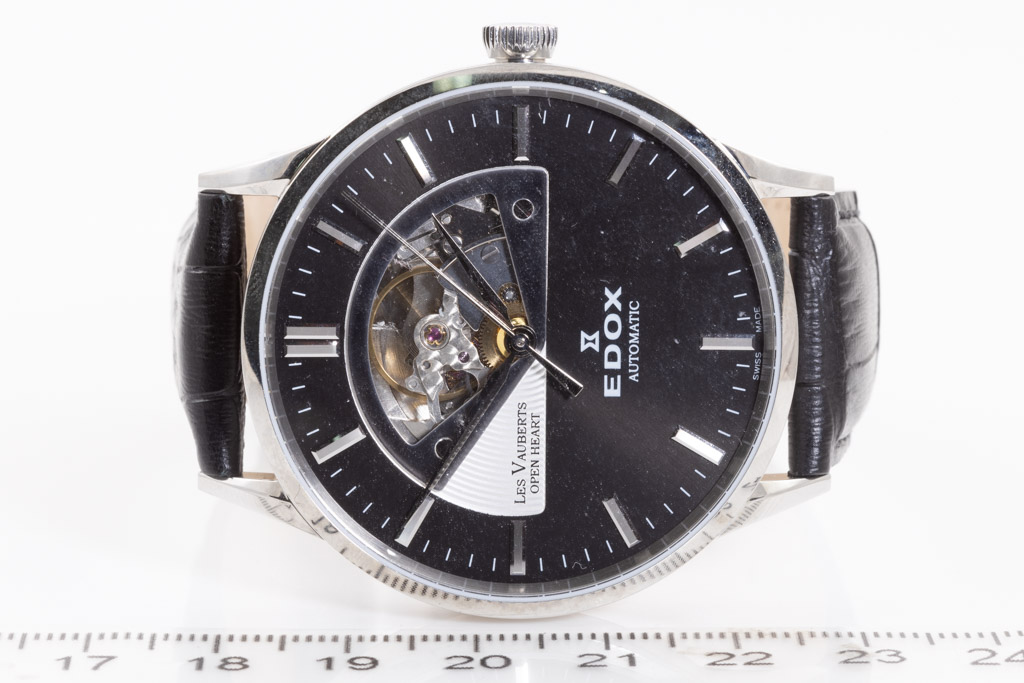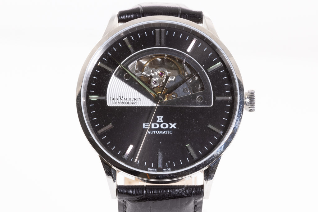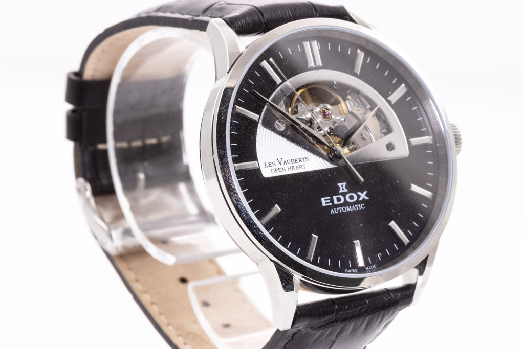 Edox Les Vauberts Open Heart stainless steel automatic men's watch. Black dial, case diameter: 43mm, strap length: 21.5cm, Swiss made. Ref# 850143NIN. With Edox black leather strap and buckle. With Edox International Warranty card and Edox box. 2-year warranty applies. (As new, Note: minor scratches on case and light wear on strap due to being display stock)