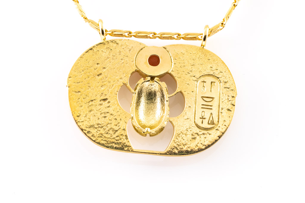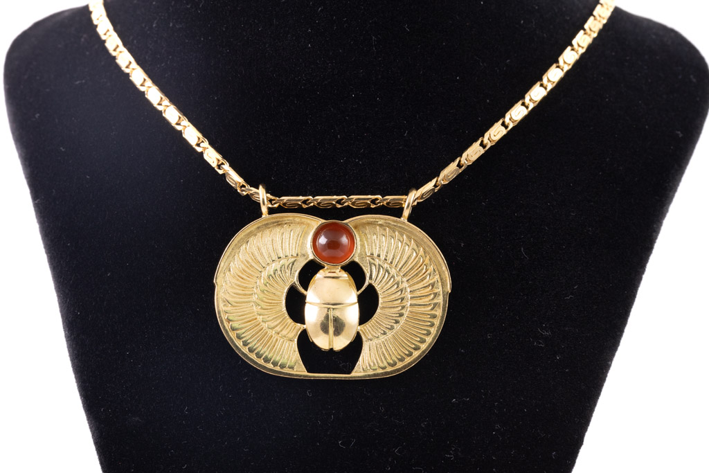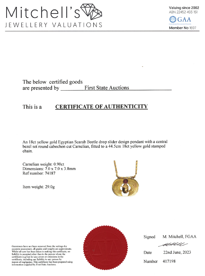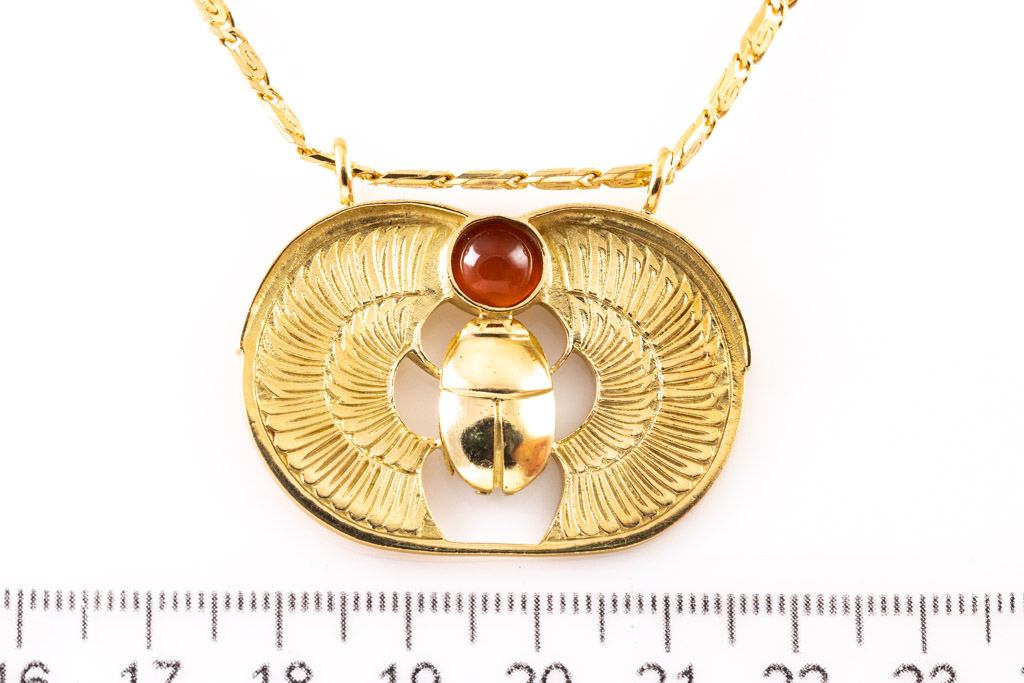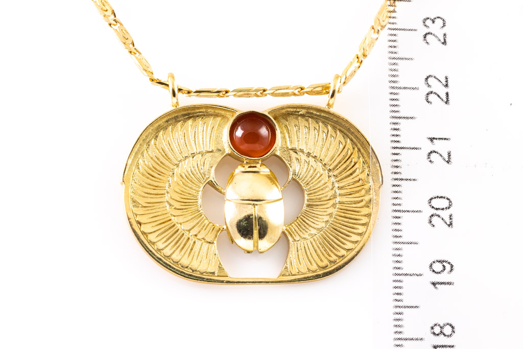 Egyptian Scarab Beetle Pendant with round cabochon cut Carnelian of approximate 0.90ct. 18ct yellow gold with 44.5cm 18ct yellow gold chain. Weight: 29.0g. With Certificate #417198. (Pre-owned)