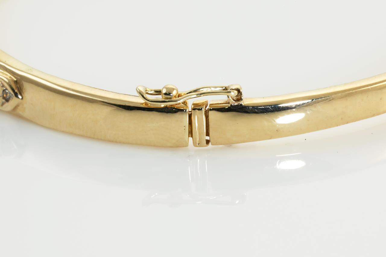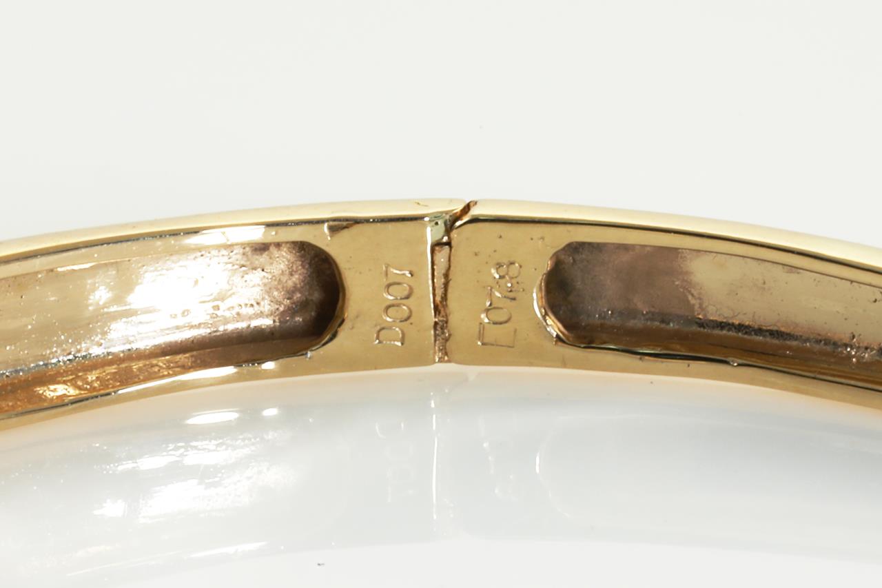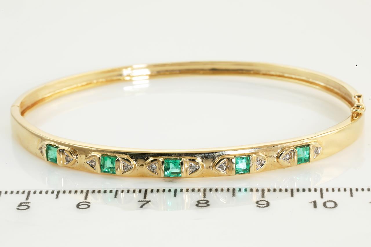 Emerald and Diamond bangle with carre cut Emeralds totalling 0.78cts and Diamonds totalling approximately 0.07cts. Inner circumference 17.5cm. 14ct yellow gold. Weight: 10.8g. (Pre-owned)