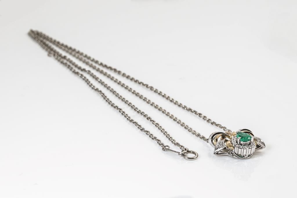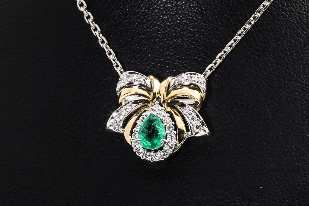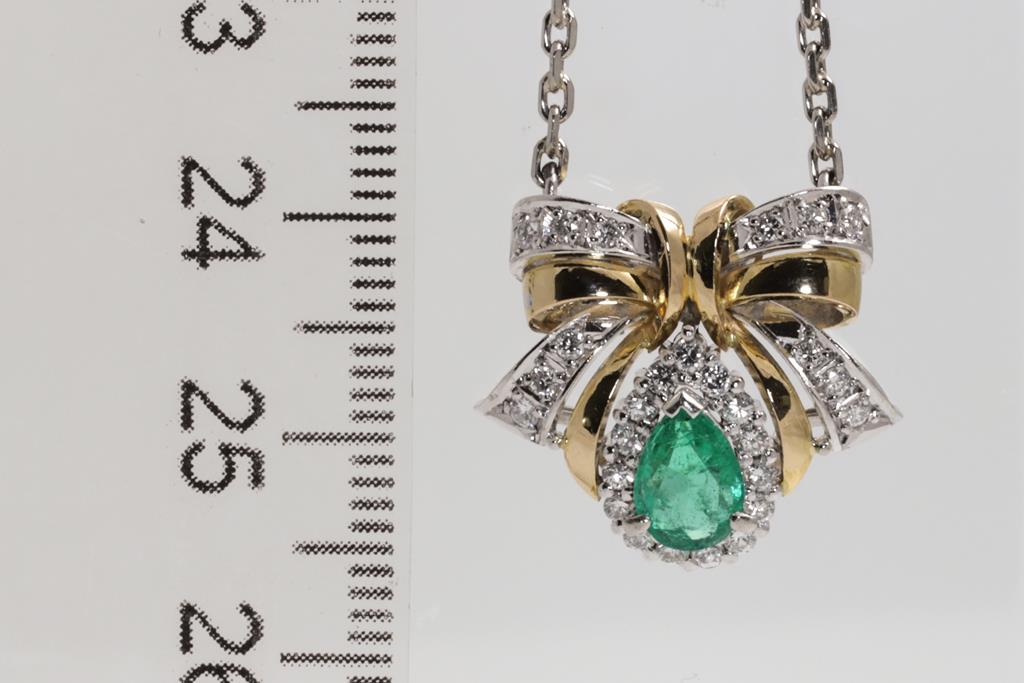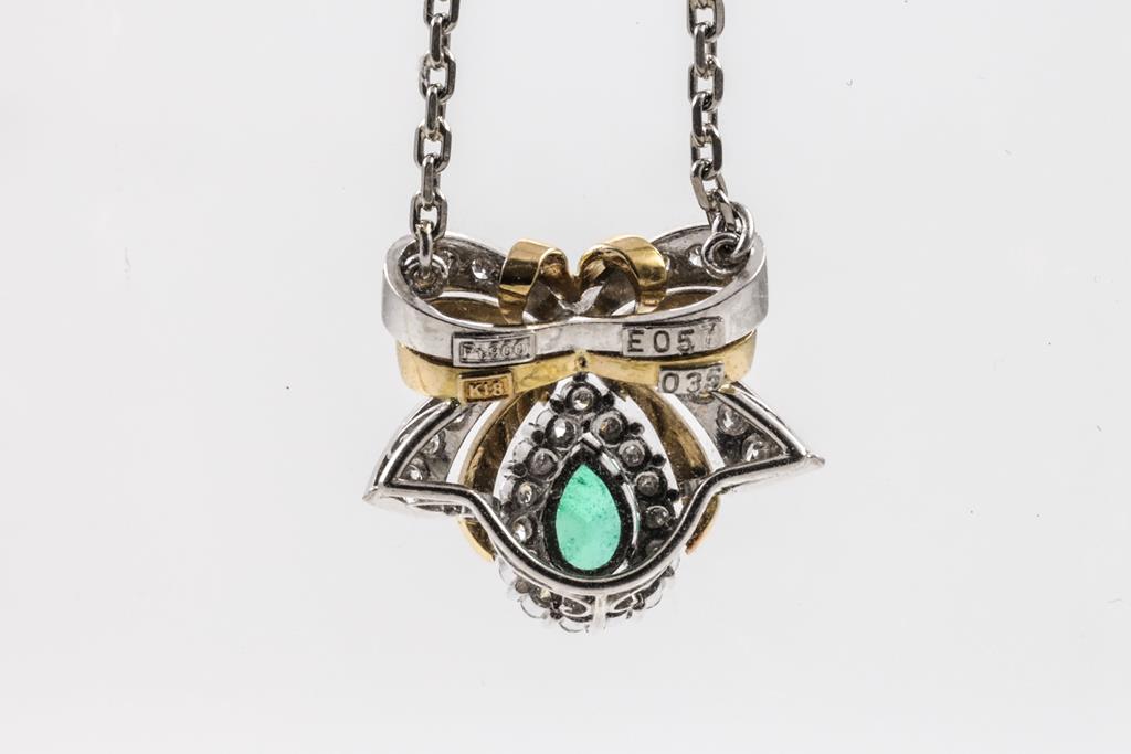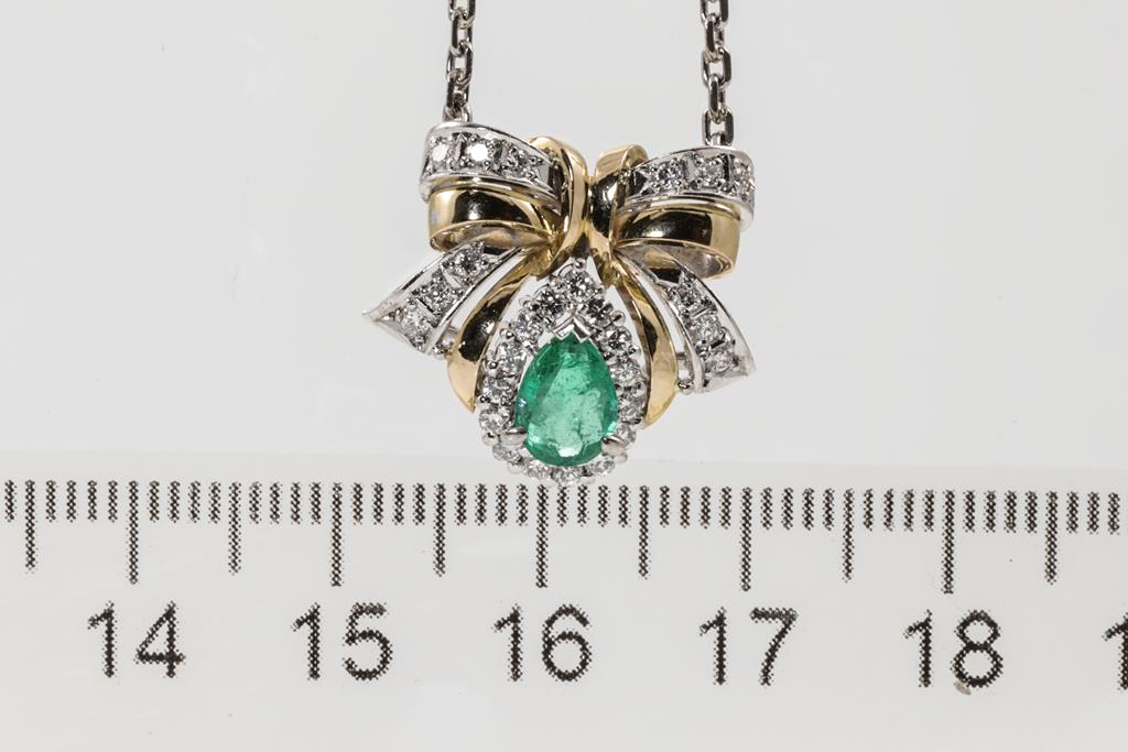 Emerald and Diamond bow design pendant with centre pear shape Emerald of 0.57ct and round cut Diamonds totalling 0.35cts (Estimated grading: G-H SI). 18ct yellow gold and platinum with attached chain. Adjustable max length: 60cm. Weight: 12.8g. (Pre-owned)