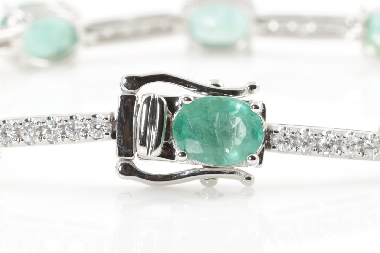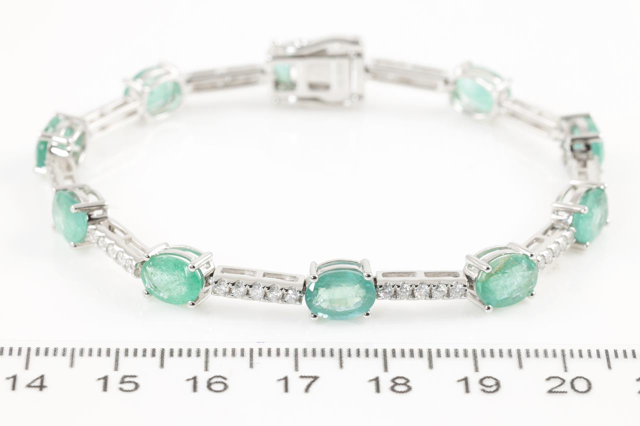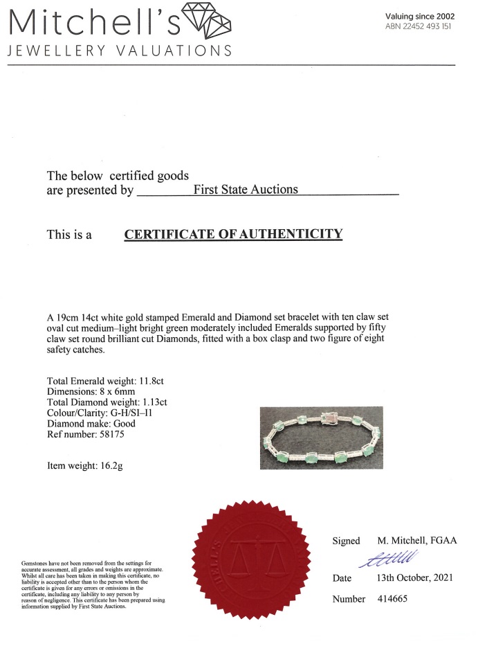 Emerald and Diamond bracelet with oval shape Emeralds totalling 11.80cts and Diamonds totalling 1.13cts (Estimated grading: G-H SI-P1). 14ct white gold. Length: 19cm. Weight: 16.2g. With Certififcate #414665. (As new)