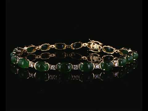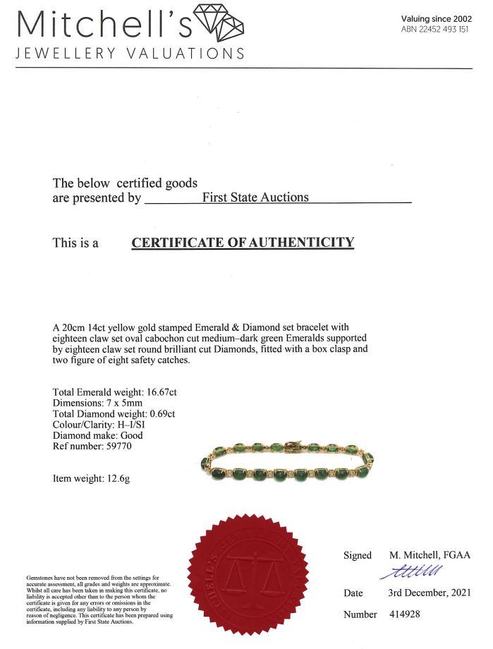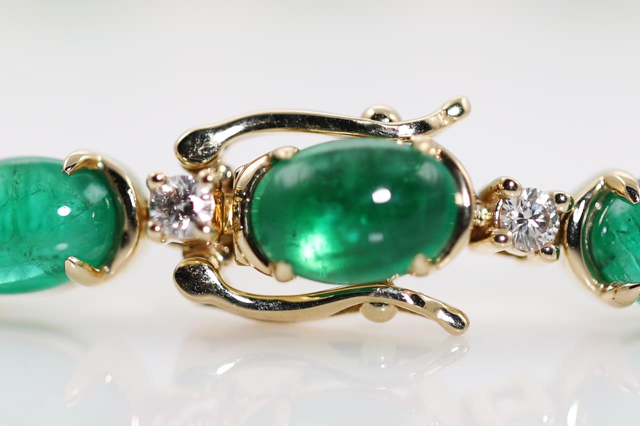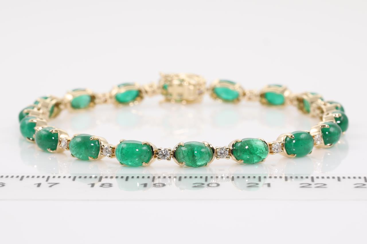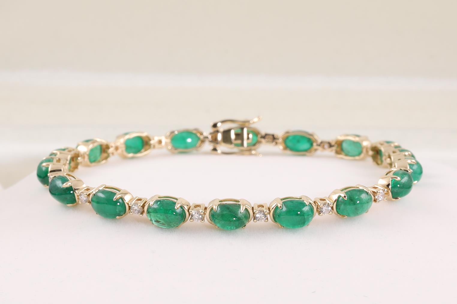 Emerald and Diamond bracelet with oval cabochon cut Emeralds totalling 16.67cts and Diamonds totalling 0.69cts (Estimated grading: H-I SI). 14ct yellow gold. Length: 20cm. Weight: 12.6g. With certificate #414928. (As new)
