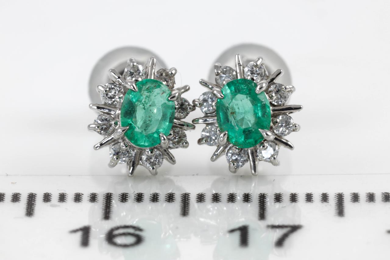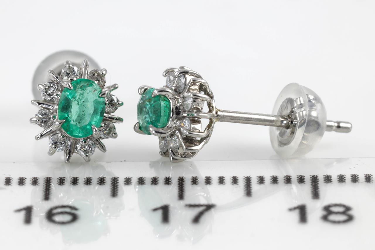 Emerald and Diamond earings with oval Emeralds totalling 0.45cts and Diamonds totalling 0.18cts. Platinum with platinum & silicon backs. Weight: 1.8g (Pre-owned)