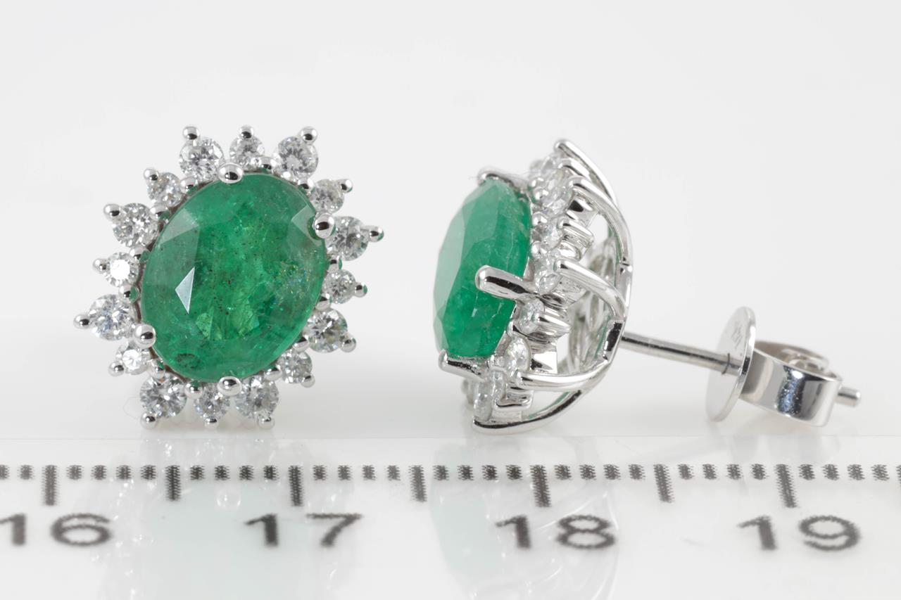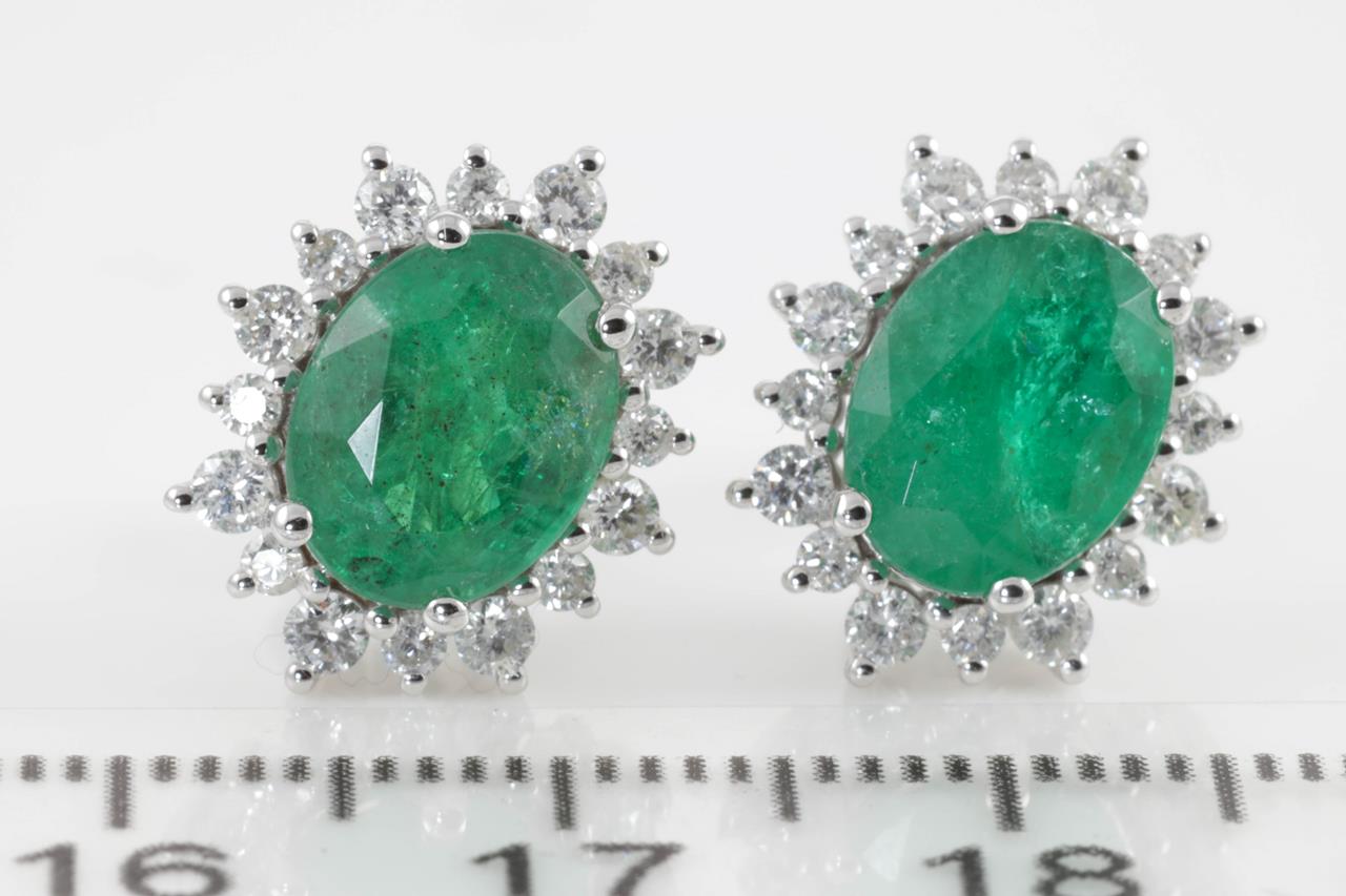 Emerald and Diamond earrings with Emerald totalling 3.39cts and Diamonds totalling 0.64cts (Estimated grading: H-I SI-P1). 14ct yellow gold. Weight: 4.1g (As new)
