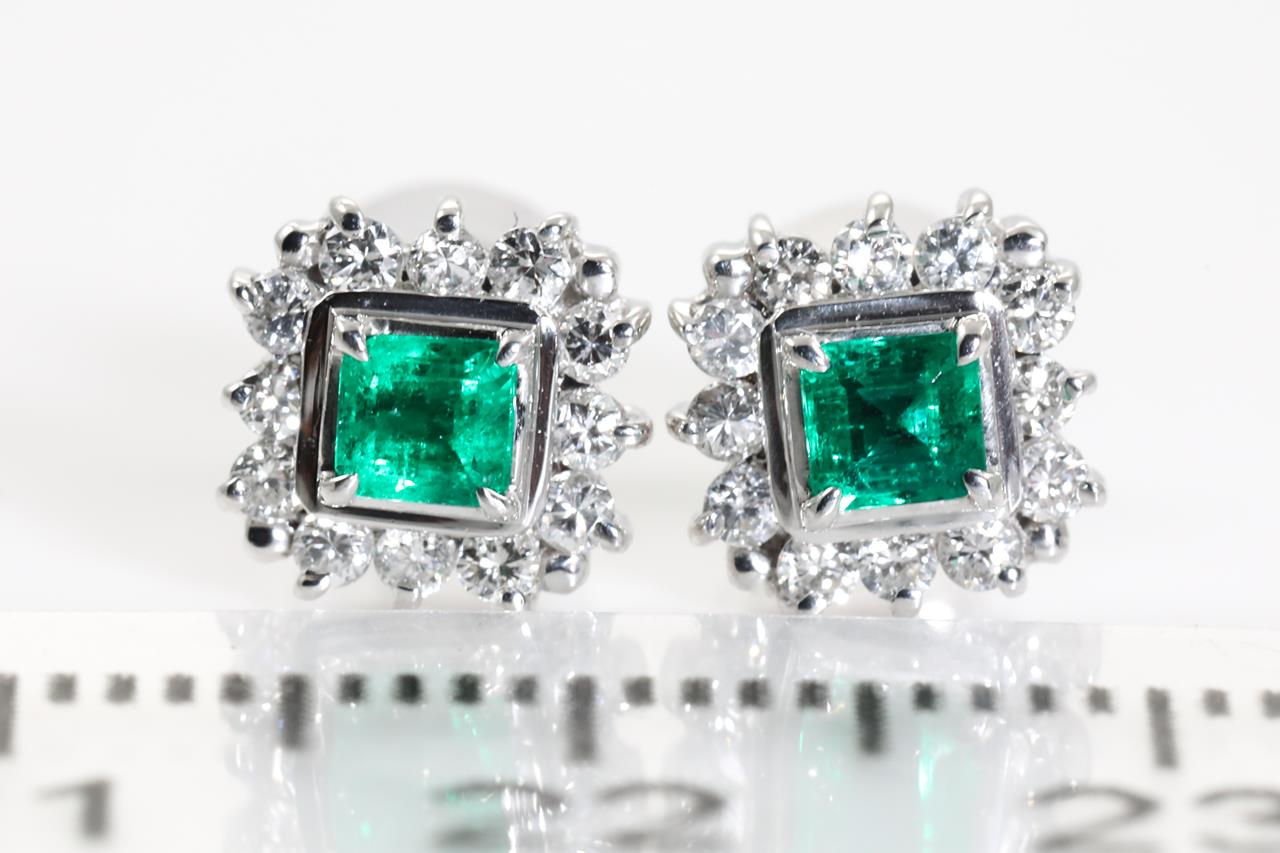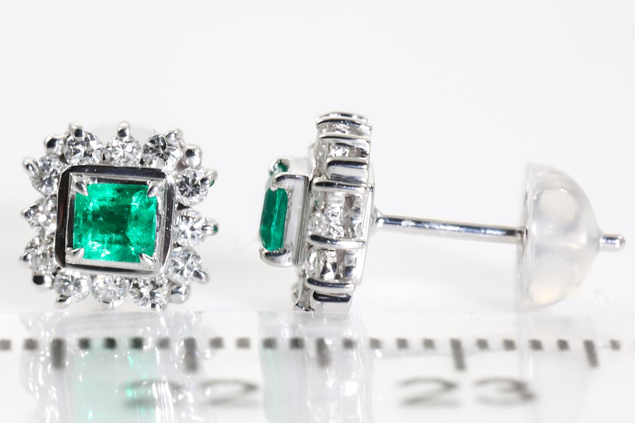Emerald and Diamond Earrings with square emerald cut Emeralds totalling 0.54cts and Diamonds totalling 0.60cts (Estimated grading: G-H SI). Platinum with 14ct white gold and silicon backs. Weight: 2.6g (Pre-owned)