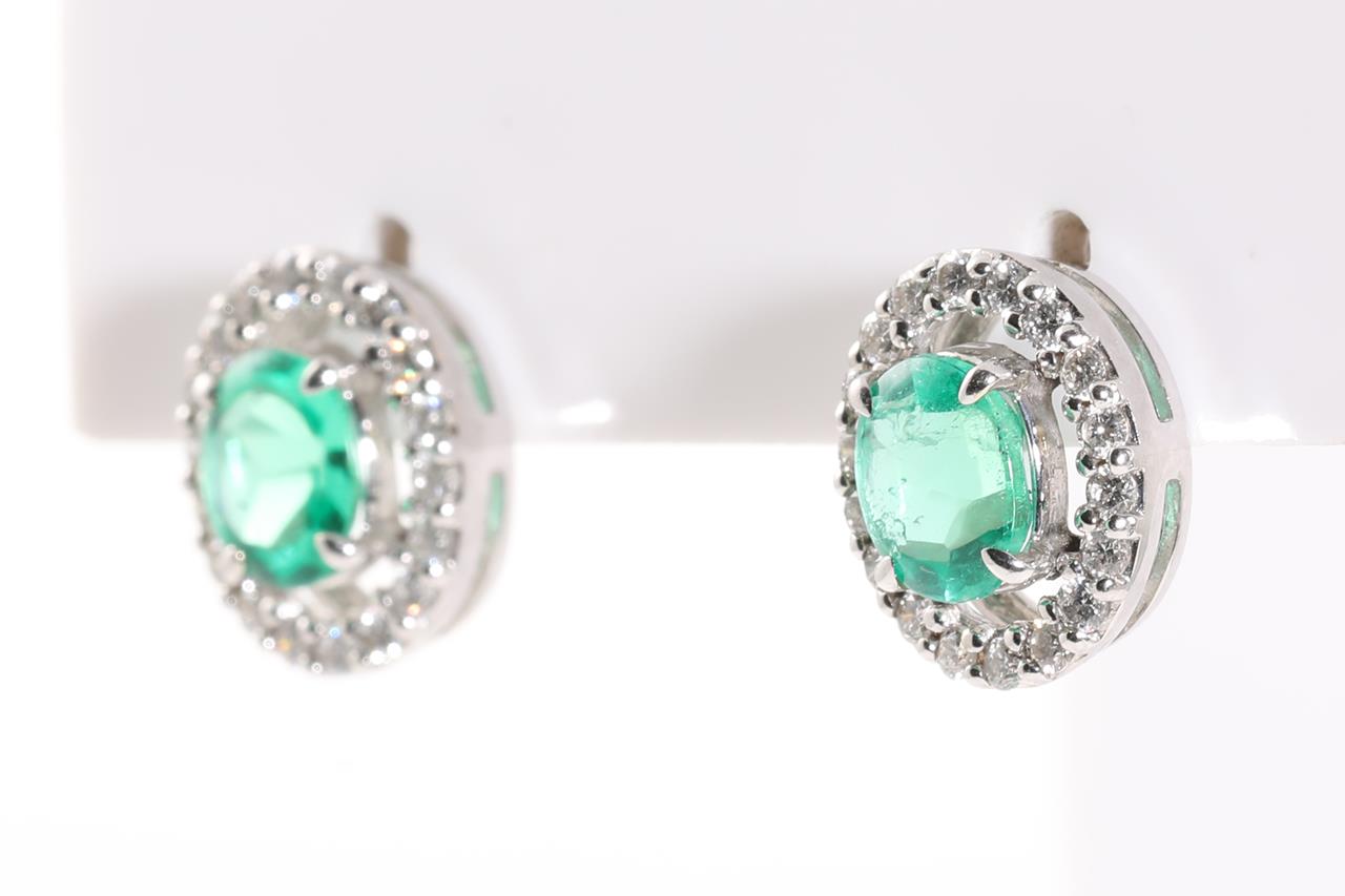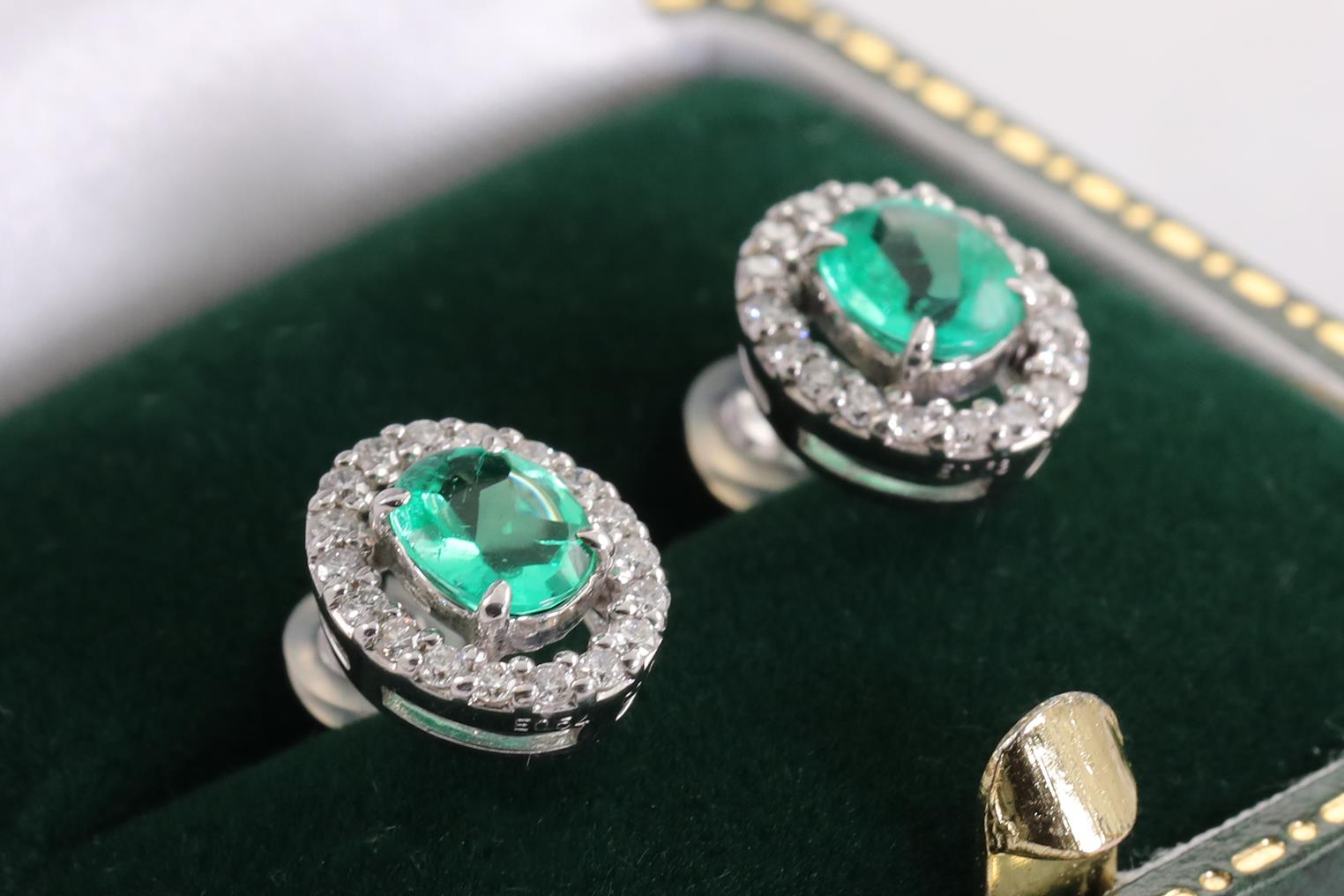 Emerald and Diamond Earrings with oval shape Emeralds totalling 1.17cts and round shape Diamonds totalling 0.40cts (Estimated grading: G-H SI). 14ct white gold with gold and silicon backs. Weight: 2.5g. (Pre-owned)
