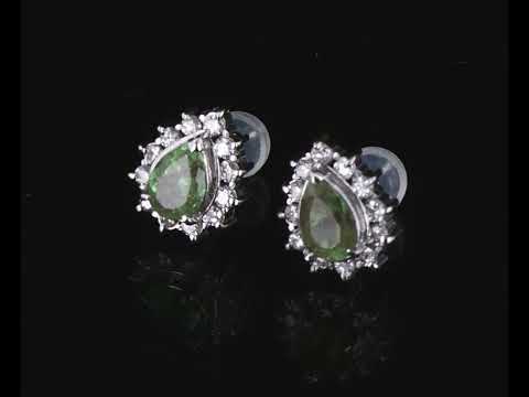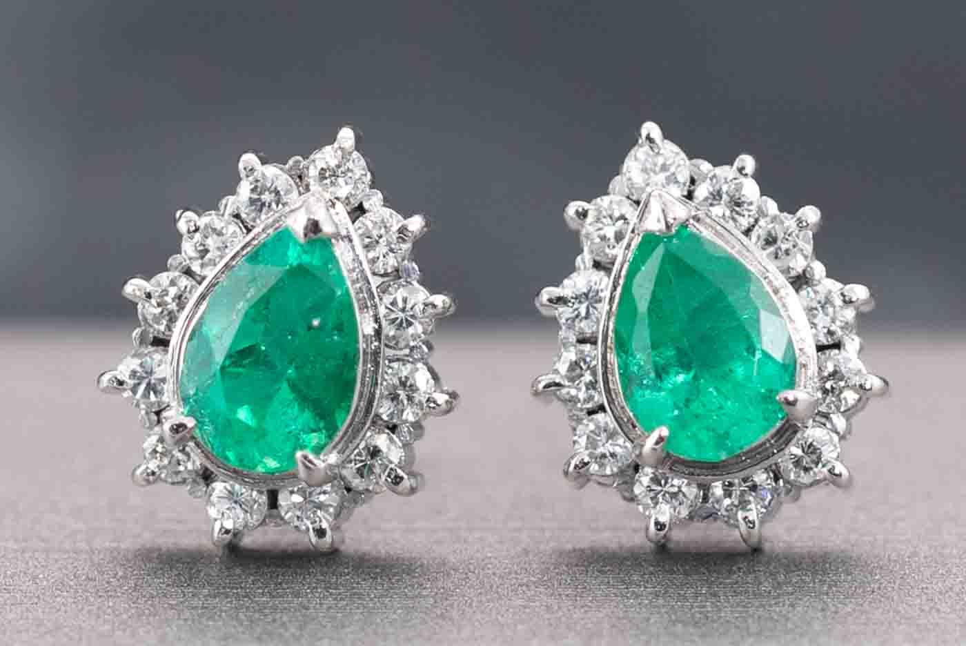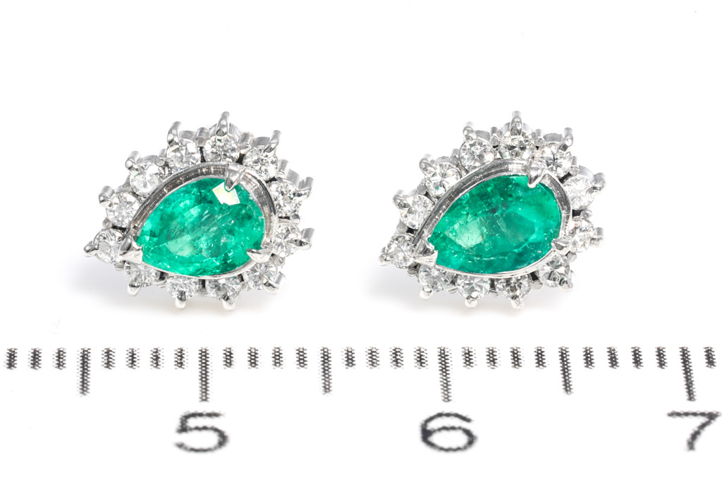 Emerald and Diamond earrings with pear Emerald totalling 0.69cts and Diamonds totalling 0.29cts. Platinum. Weight: 2.4g. (Pre-owned)