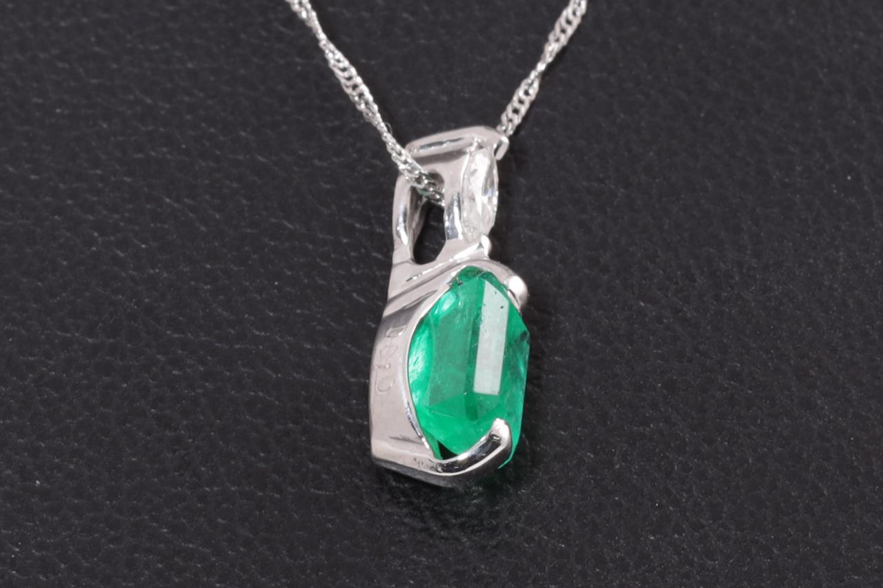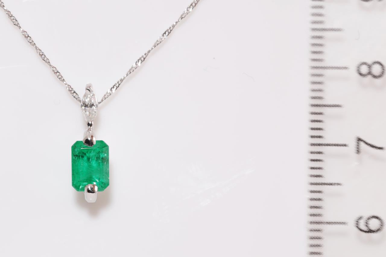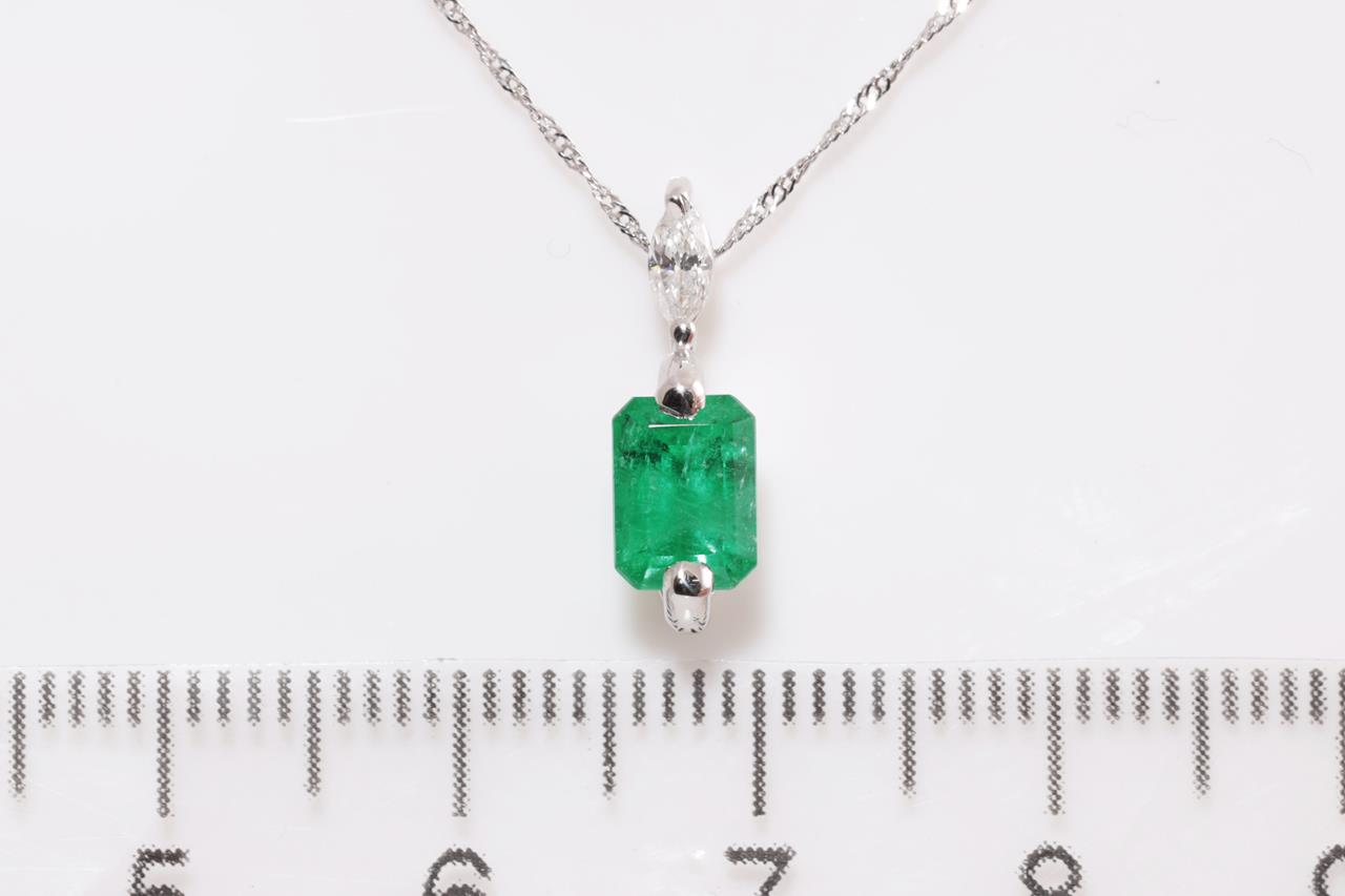 Emerald and Diamond pendant with emerald cut Emerald of 0.95ct and marquise cut Diamond of 0.10cts. Platinum with 40cm chain. Weight: 1.9g (Pre-owned)