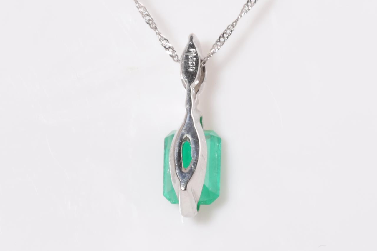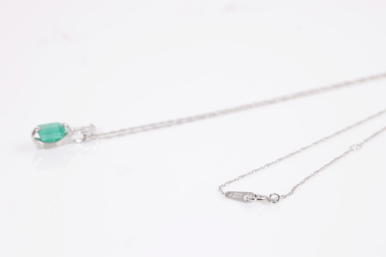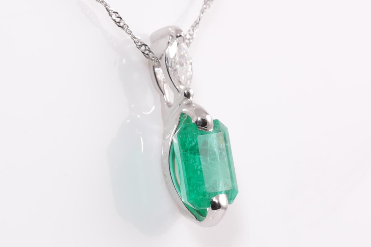 Emerald and Diamond pendant with emerald cut Emerald of 0.95ct and marquise cut Diamond of 0.10cts. Platinum with 40cm chain. Weight: 1.9g (Pre-owned)