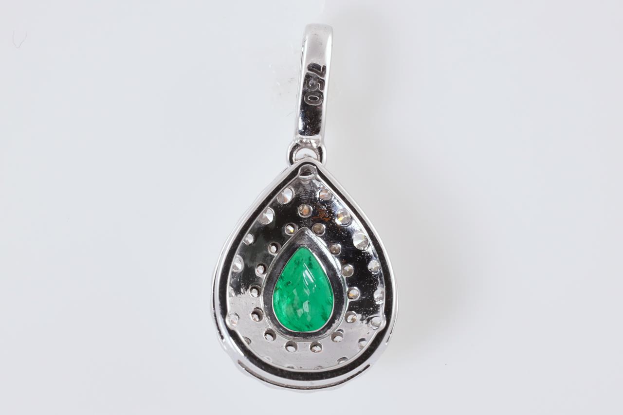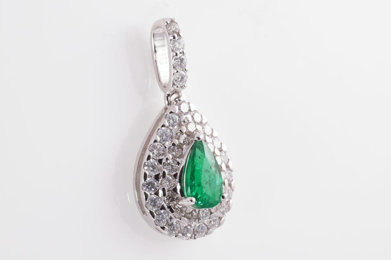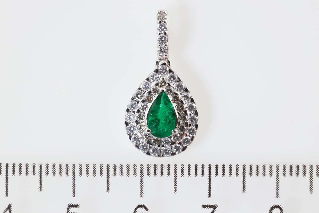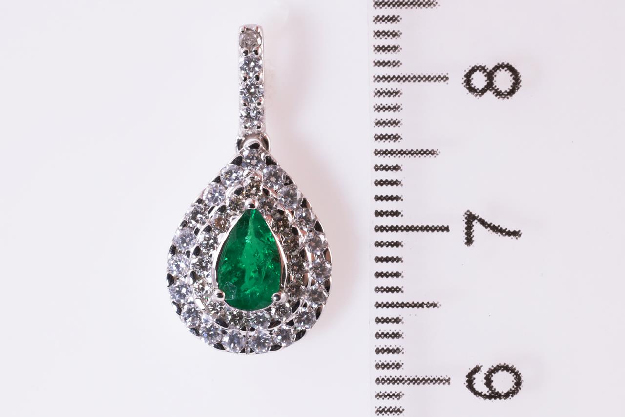 Emerald and Diamond Pendant with centre pear shape Emerald of approximately 0.60ct and round Diamonds totalling approximately 0.46cts (Estimated Grading: G-H SI). 18ct white gold. No chain supplied. Weight 1.7g. (Pre-owned)