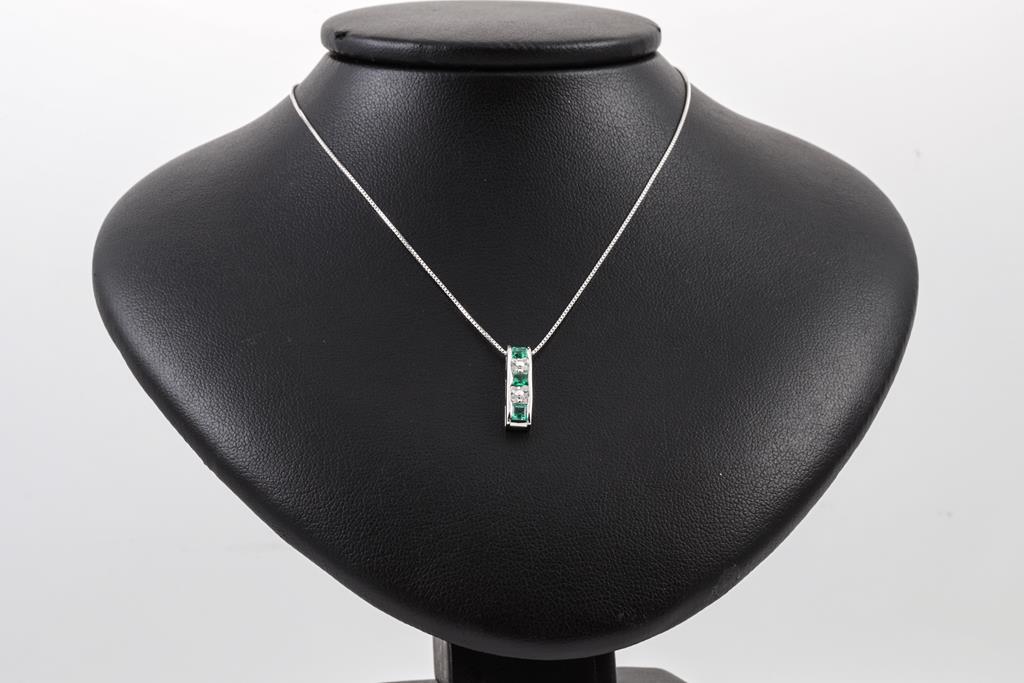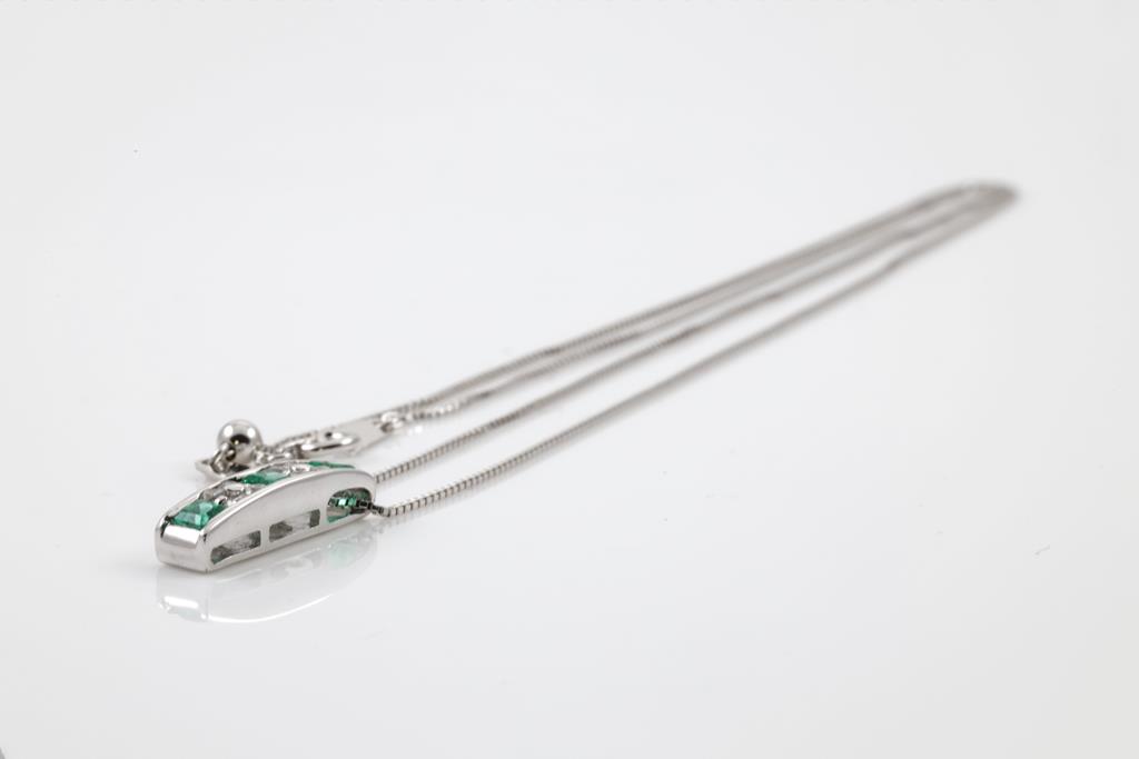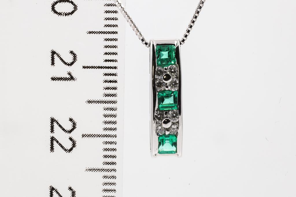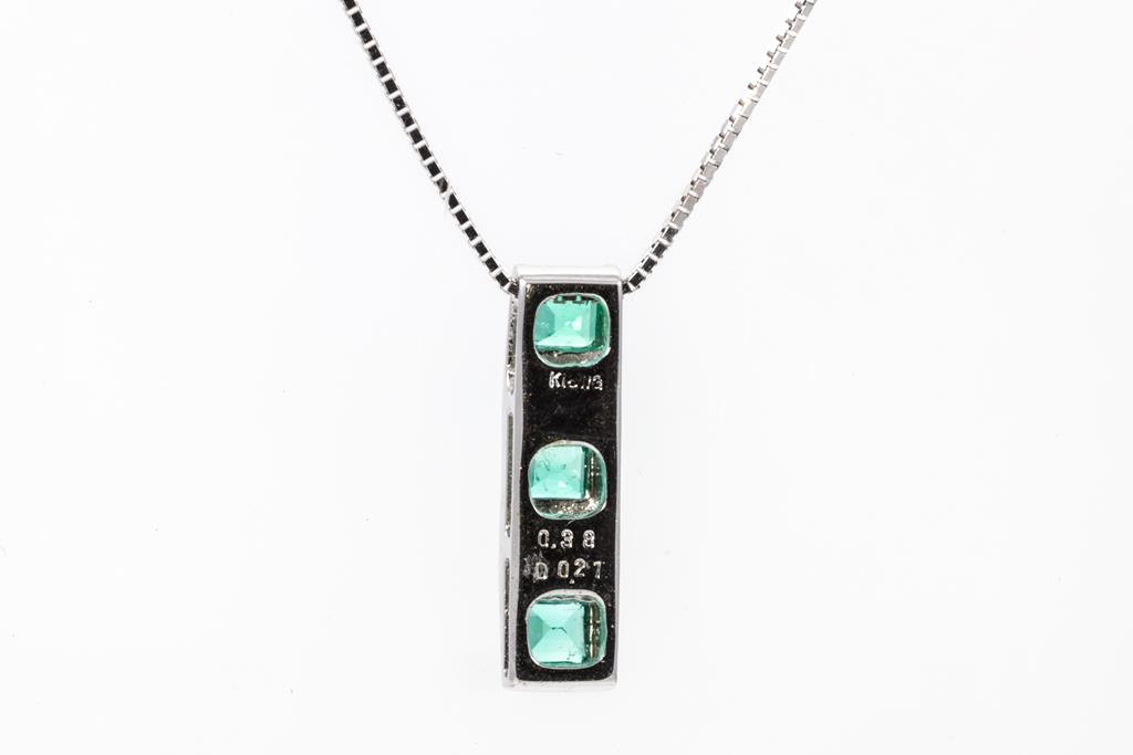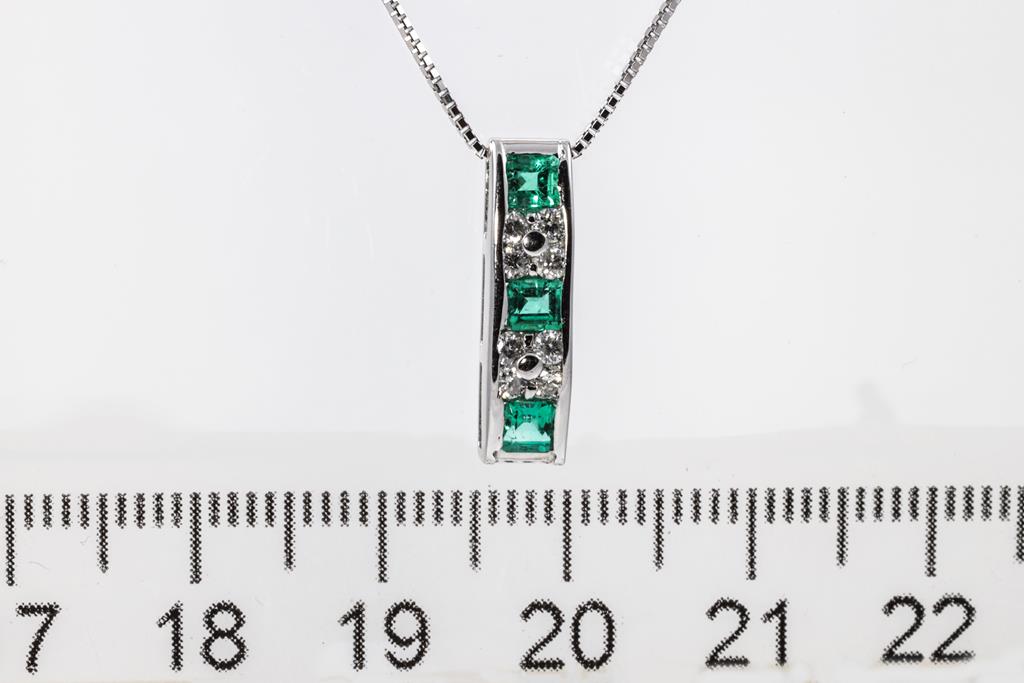 Emerald and Diamond Pendant with square emerald cut Emeralds totalling 0.38cts and round cut Diamonds totalling 0.21cts. 18ct white gold with 45cm adjustable chain. Weight: 3.8g. (Pre-owned)