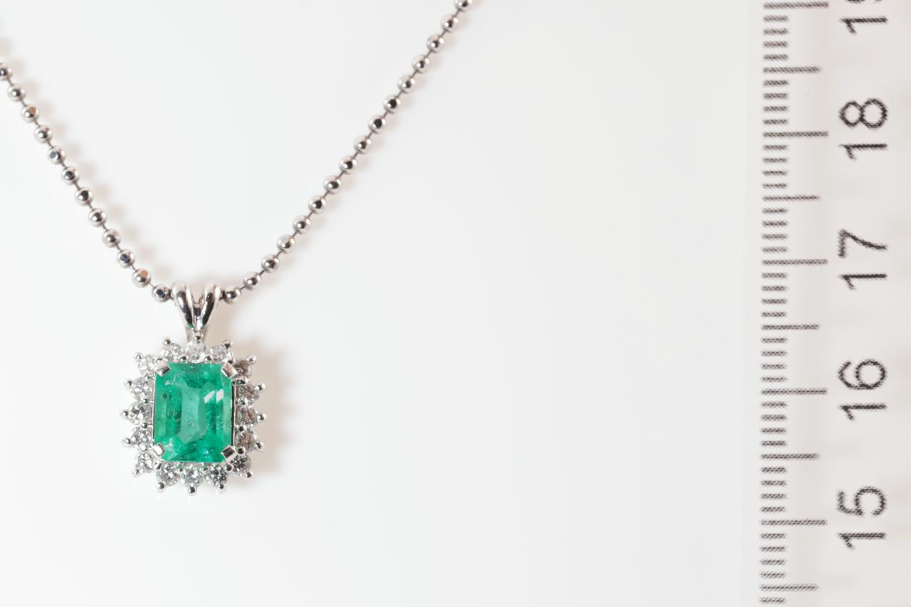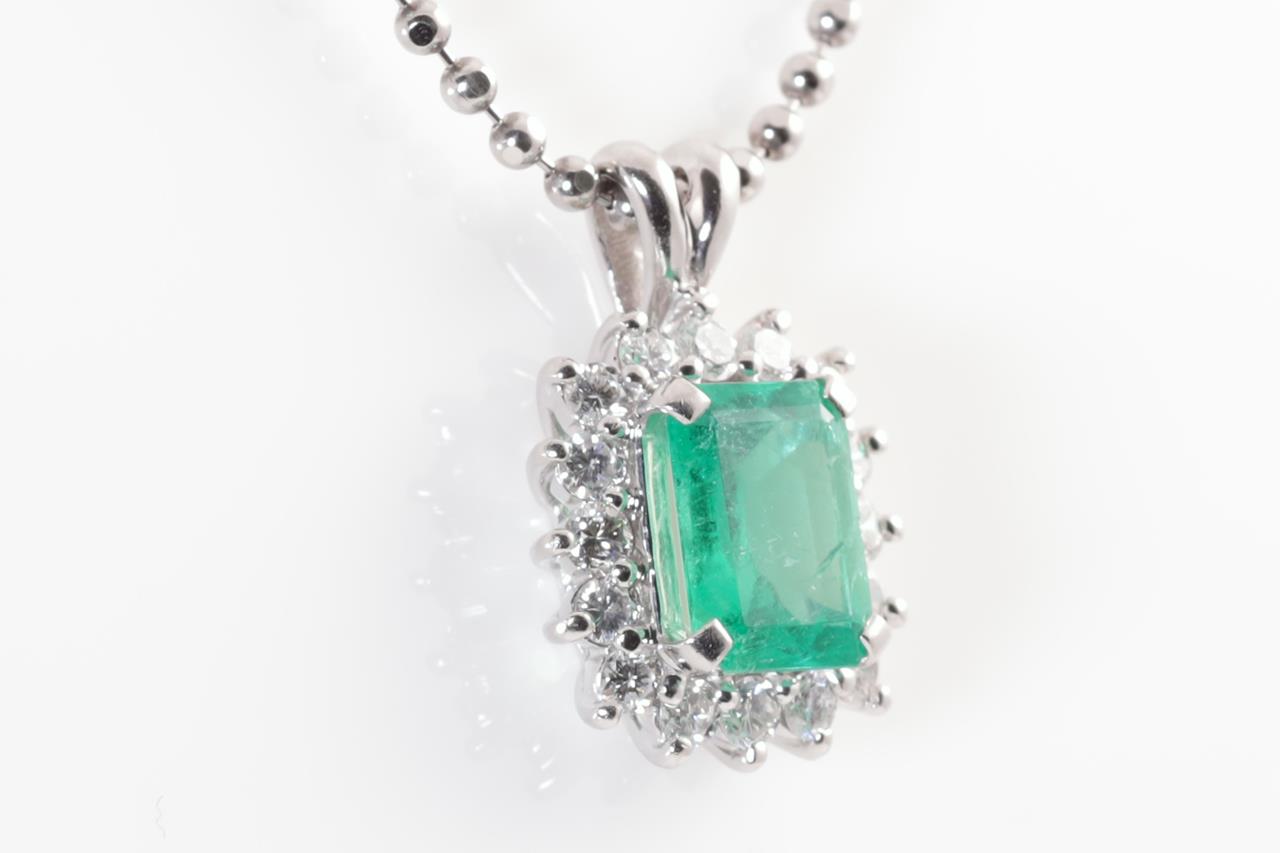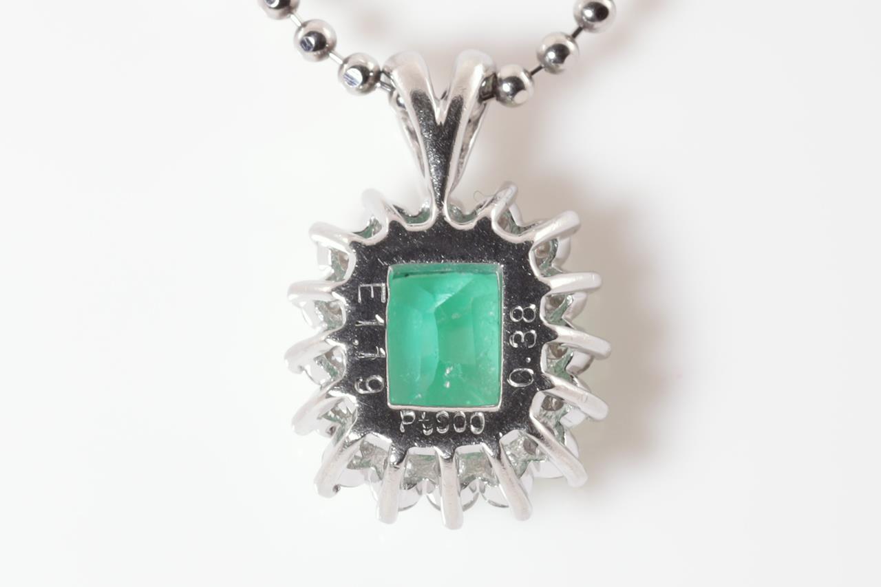 Emerald and Diamond pendant with centre emerald cut Emerald of 1.19cts and surrounding round Diamonds totalling 0.38cts (Estimated grading: G SI). Platinum with 45cm adjustable chain. Weight: 7.9g. (Pre-owned)
