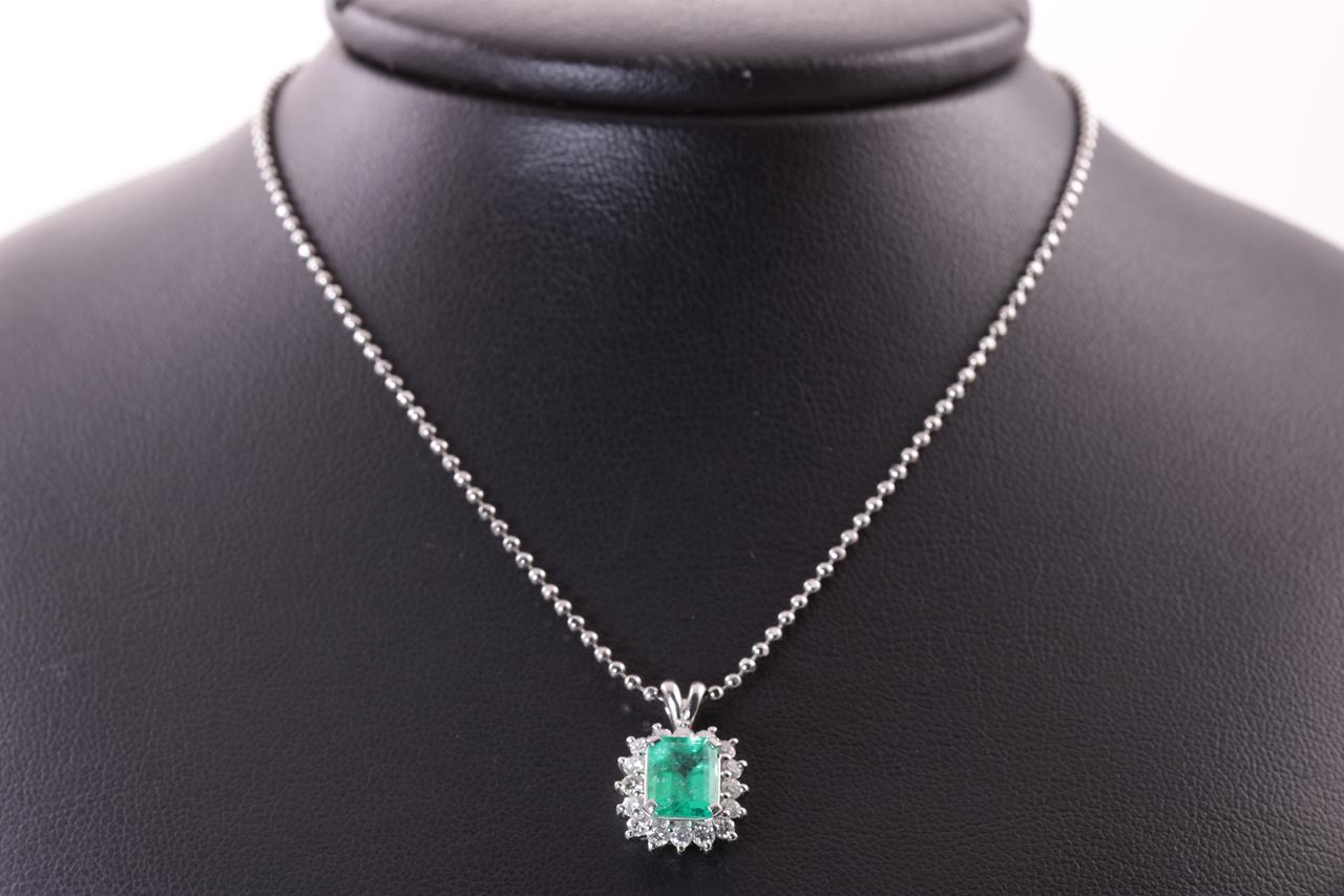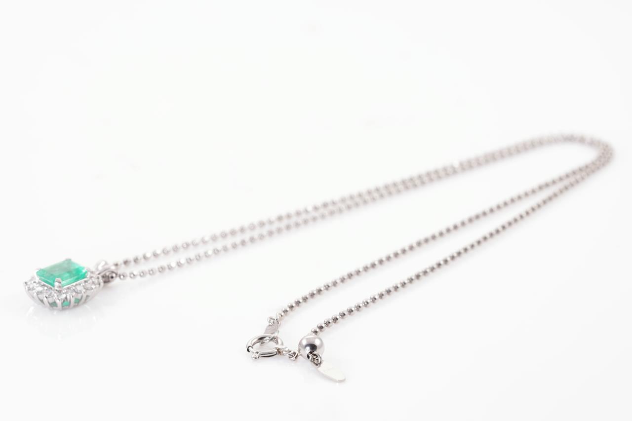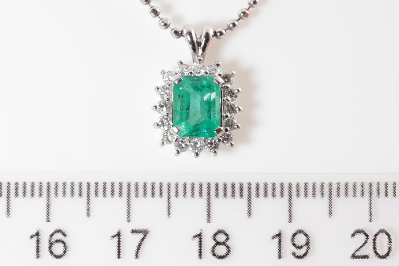 Emerald and Diamond pendant with centre emerald cut Emerald of 1.19cts and surrounding round Diamonds totalling 0.38cts (Estimated grading: G SI). Platinum with 45cm adjustable chain. Weight: 7.9g. (Pre-owned)