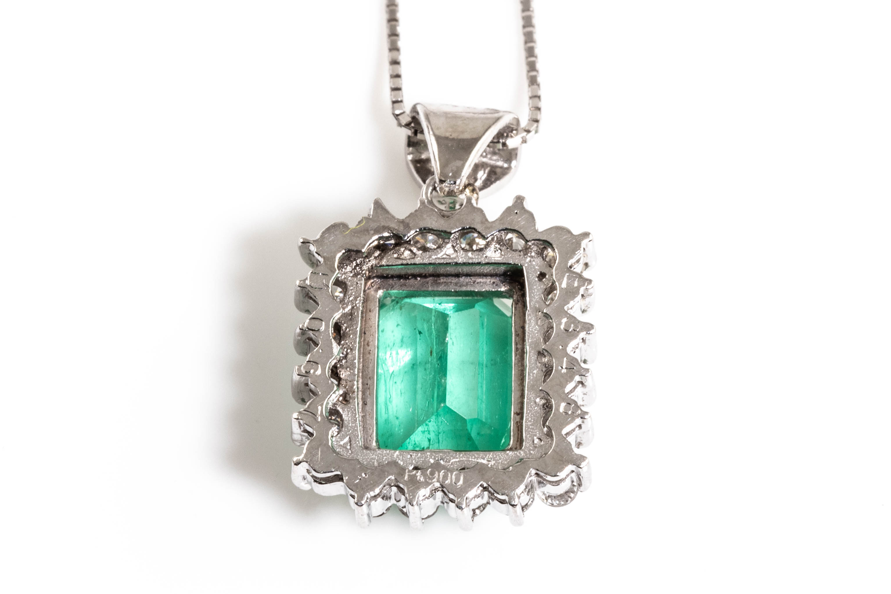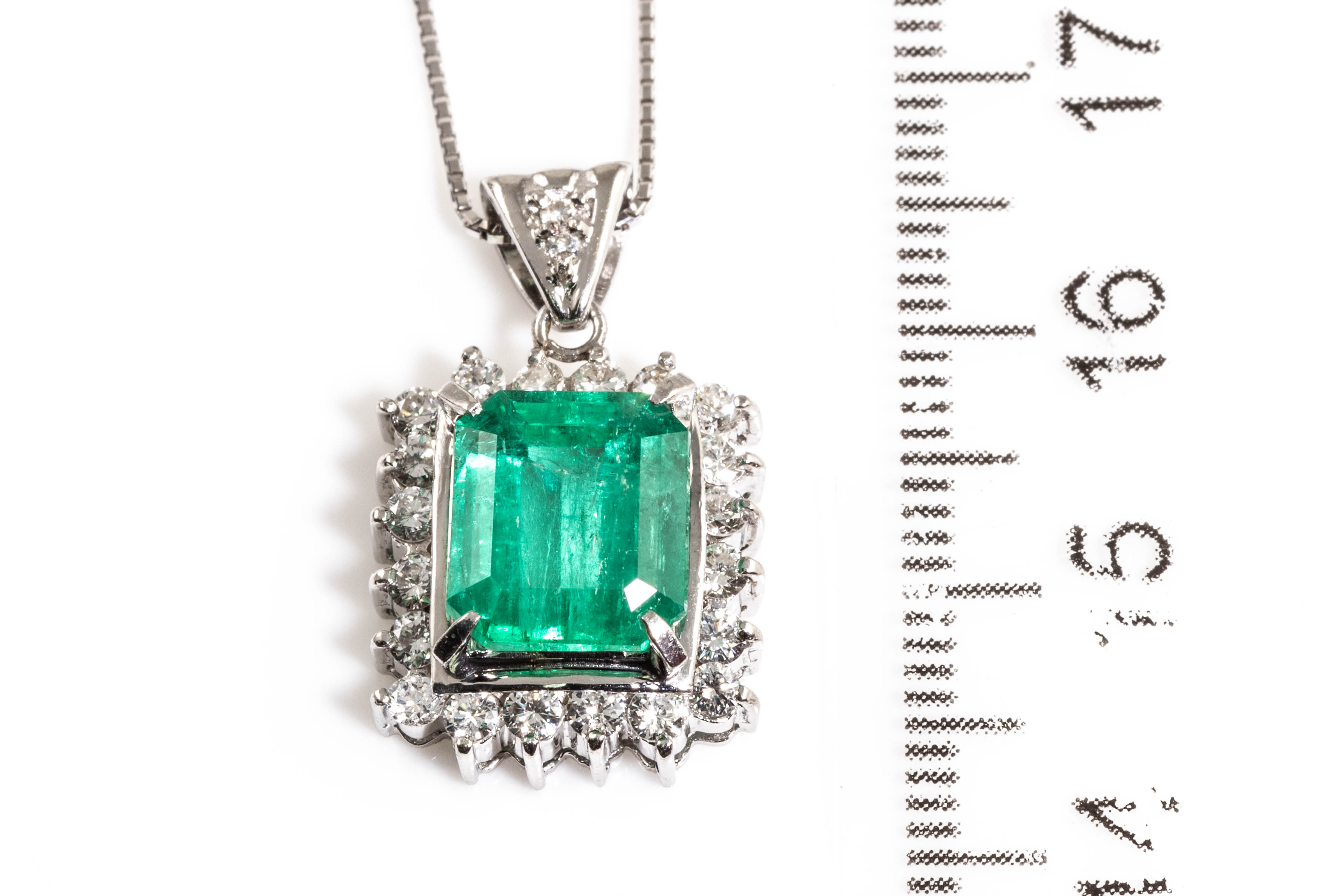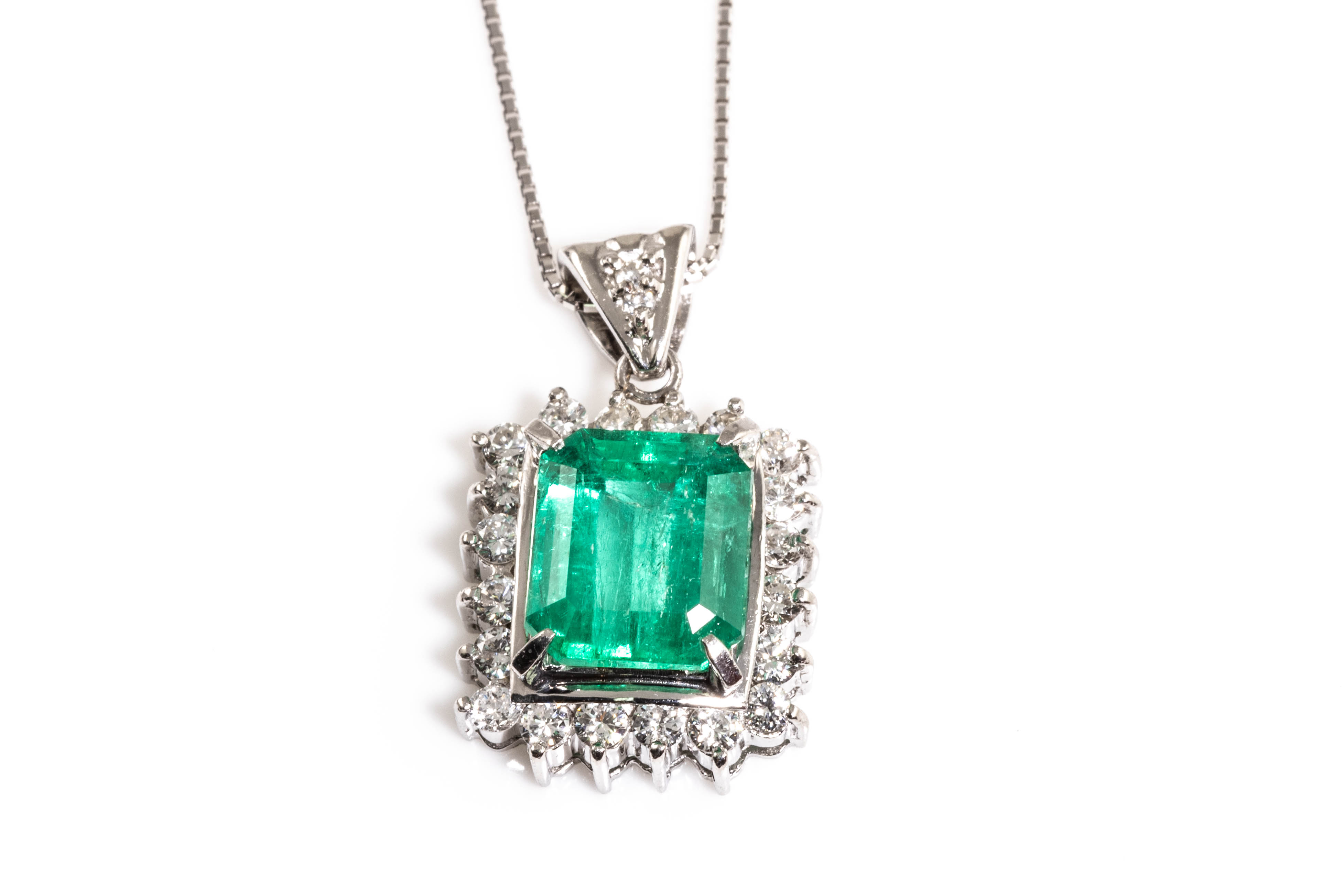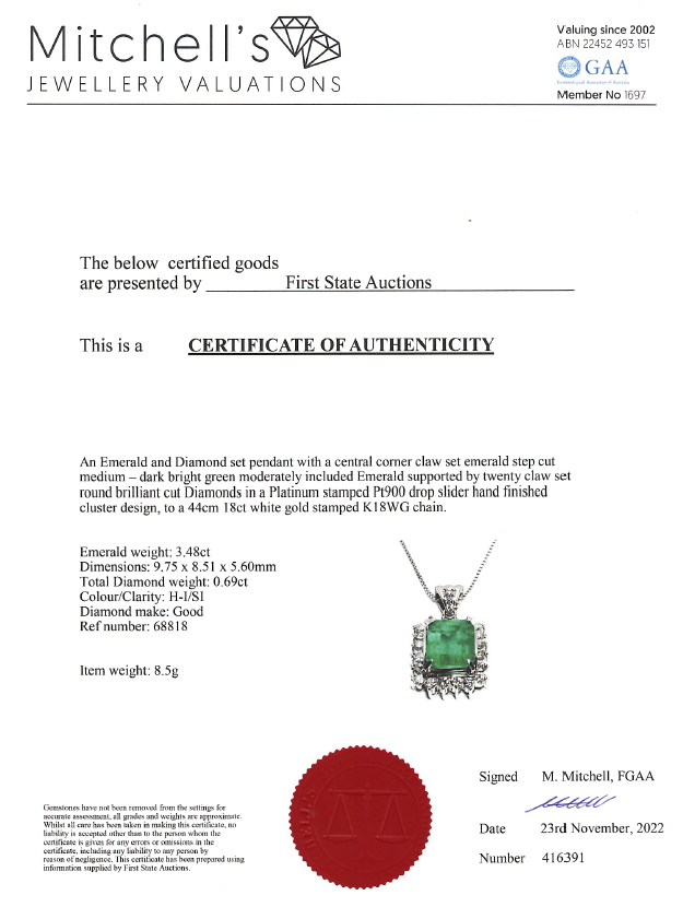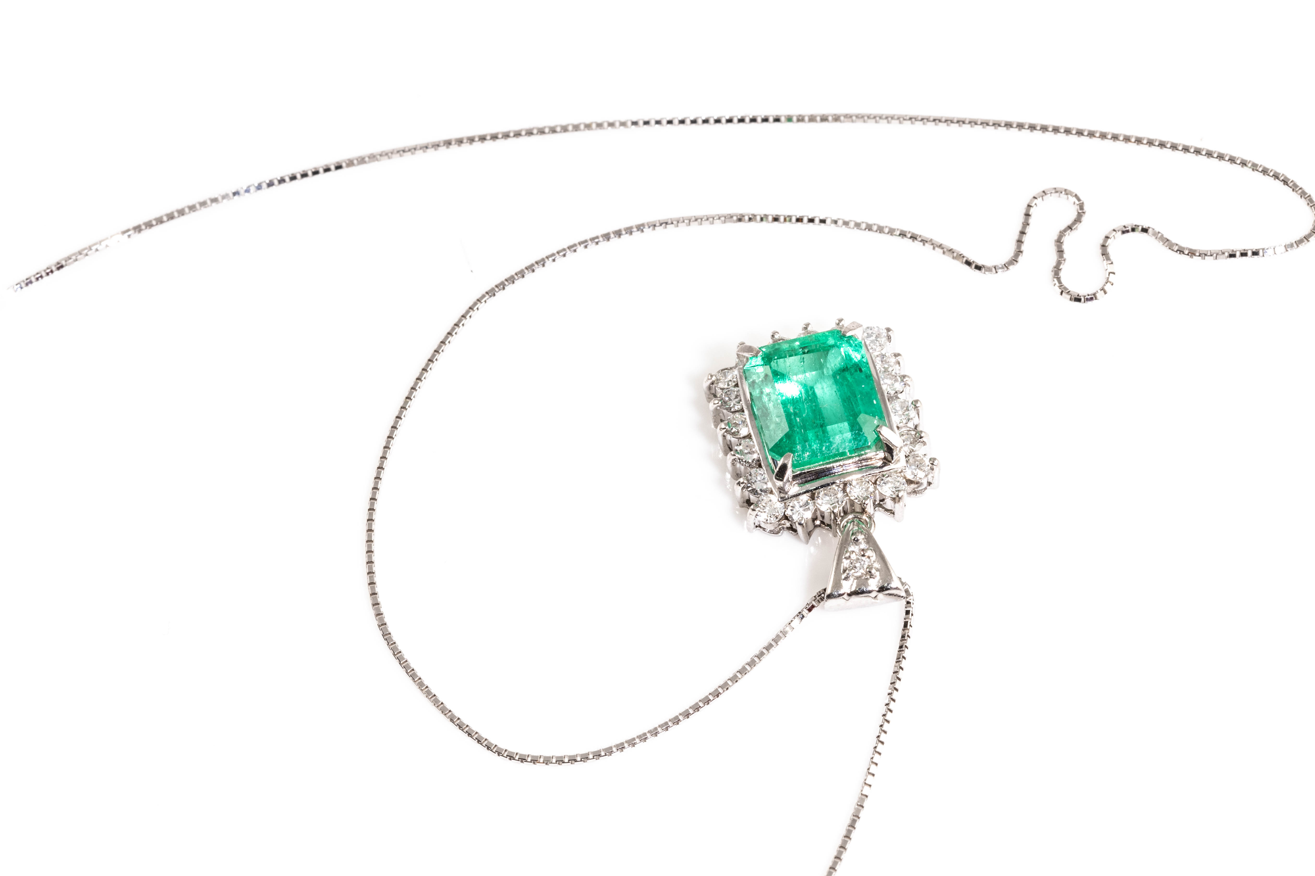 Emerald and Diamond pendant with emerald cut Emerald of 3.48ct and round Diamonds totalling 0.69cts (Estimated grading: H-I SI). Platinum with 18ct white gold 44cm adjustable chain. Weight: 8.5g. With Certificate #416391. (Pre-owned)
