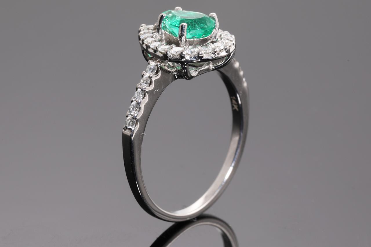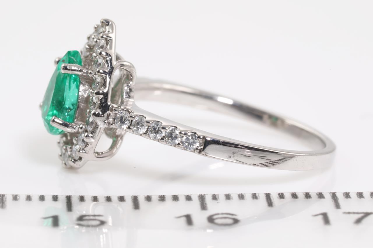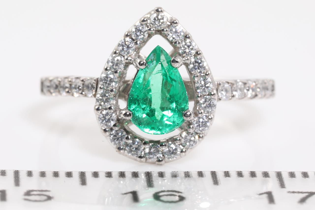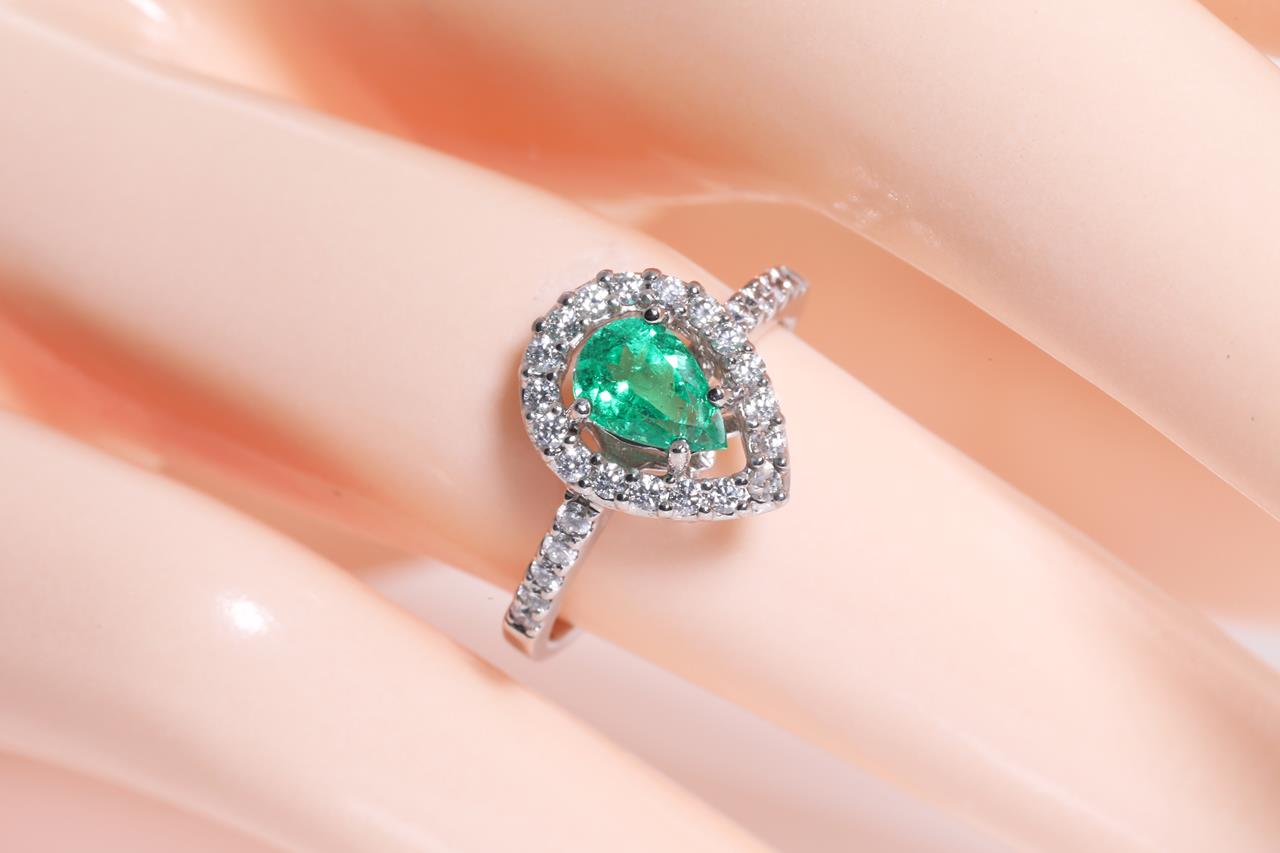 Emerald and Diamond Ring with pear cut Emerald approximately of 0.61ct and round Diamond totalling approximately 0.29cts. 14ct white gold. Ring size J. Weight 2.6g. (Pre-owned)