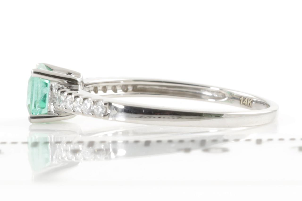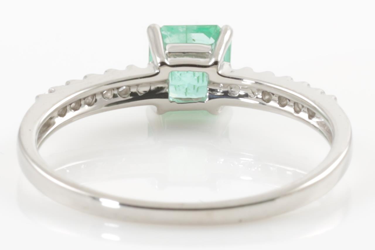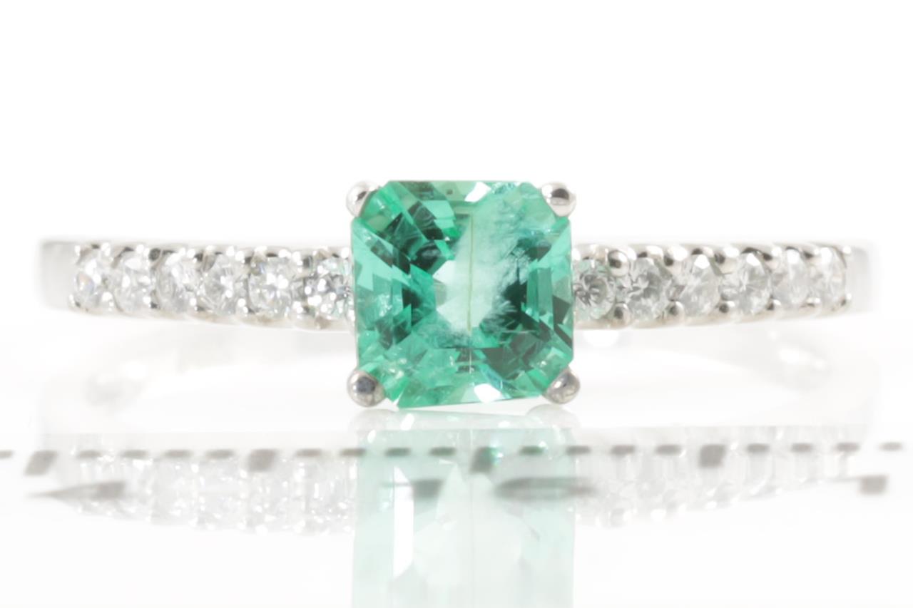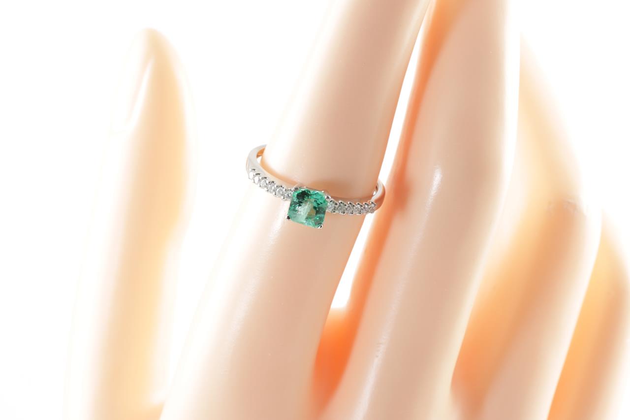 Emerald and Diamond Ring with square cut Emerald (with surface reaching natural inclusions) of approximately 0.61ct and round Diamond totalling approximately 0.13cts. 14ct white gold. Ring size N 1/2 - can be resized up by a maximum of 3 sizes, down with ring clip. Weight 1.7g. (Pre-owned)