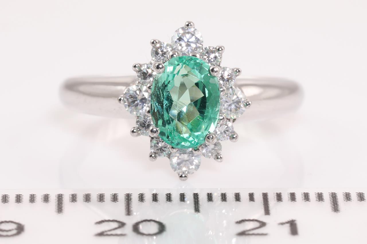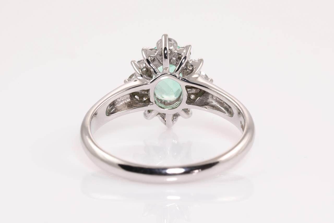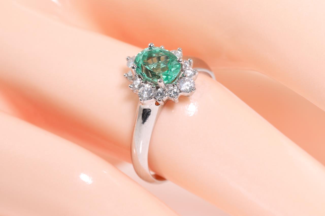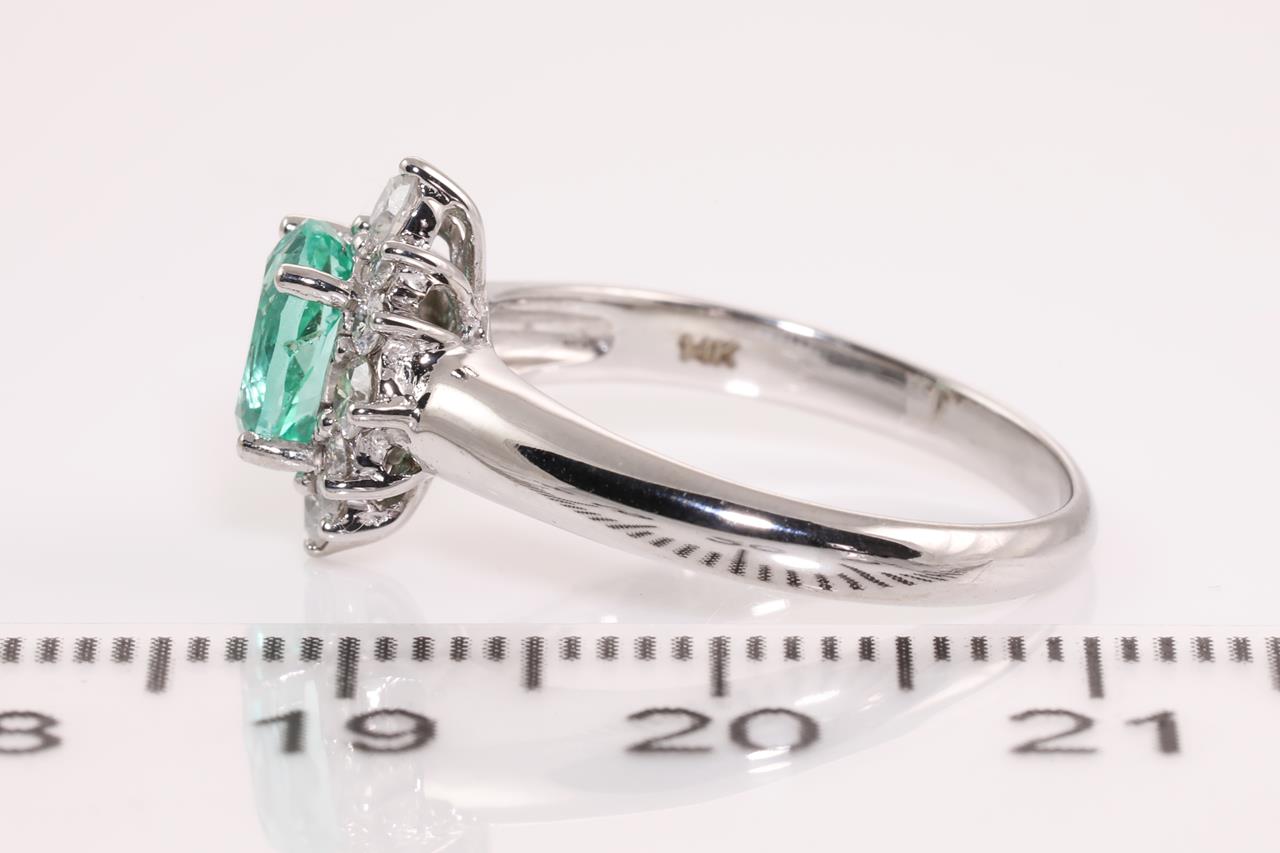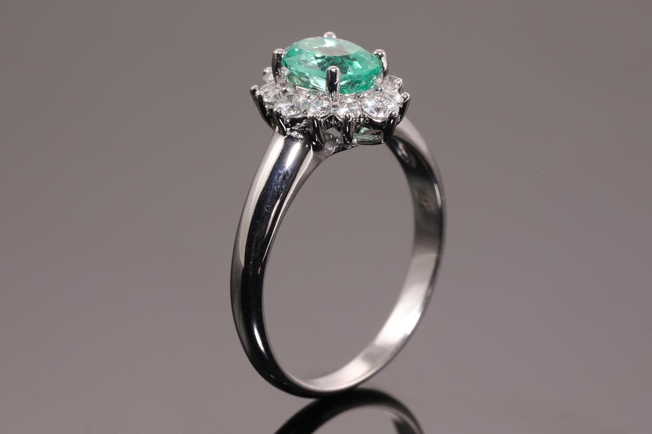 Emerald and Diamond Ring with oval cut Emerald of approximately 0.86ct and round Diamonds totalling approximately 0.32cts (Estimated grading: H-I SI). 14ct white gold. Ring size L. Weight 2.9g. (Pre-owned)