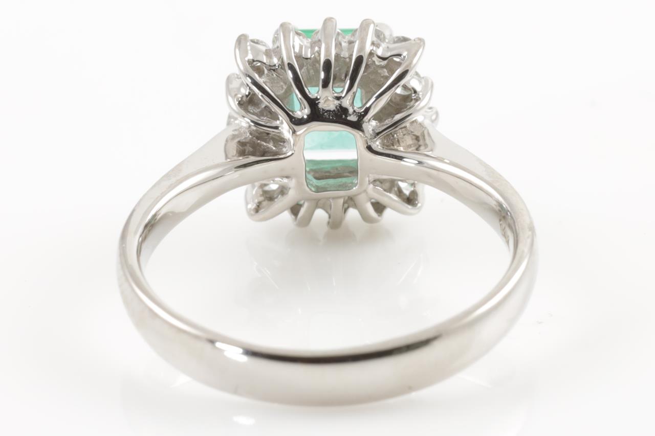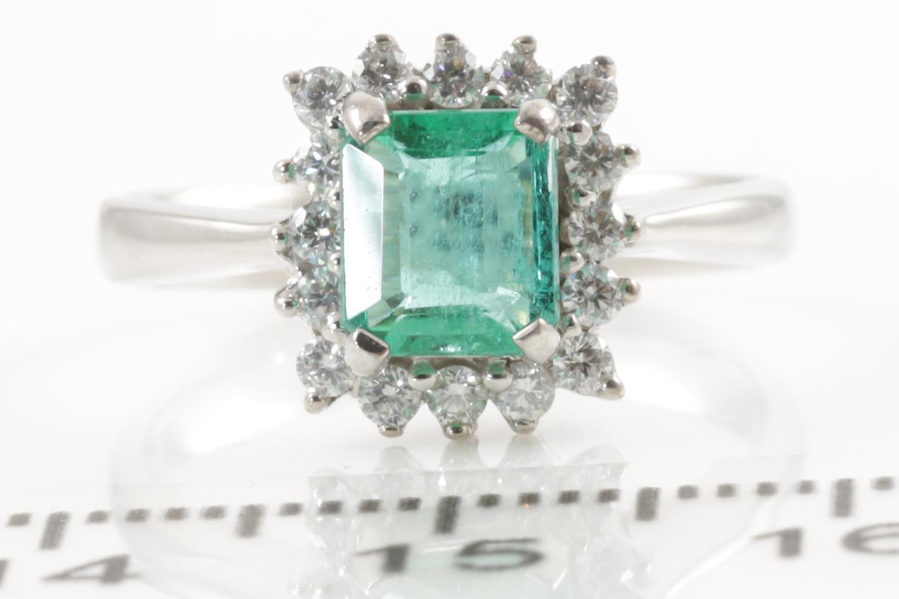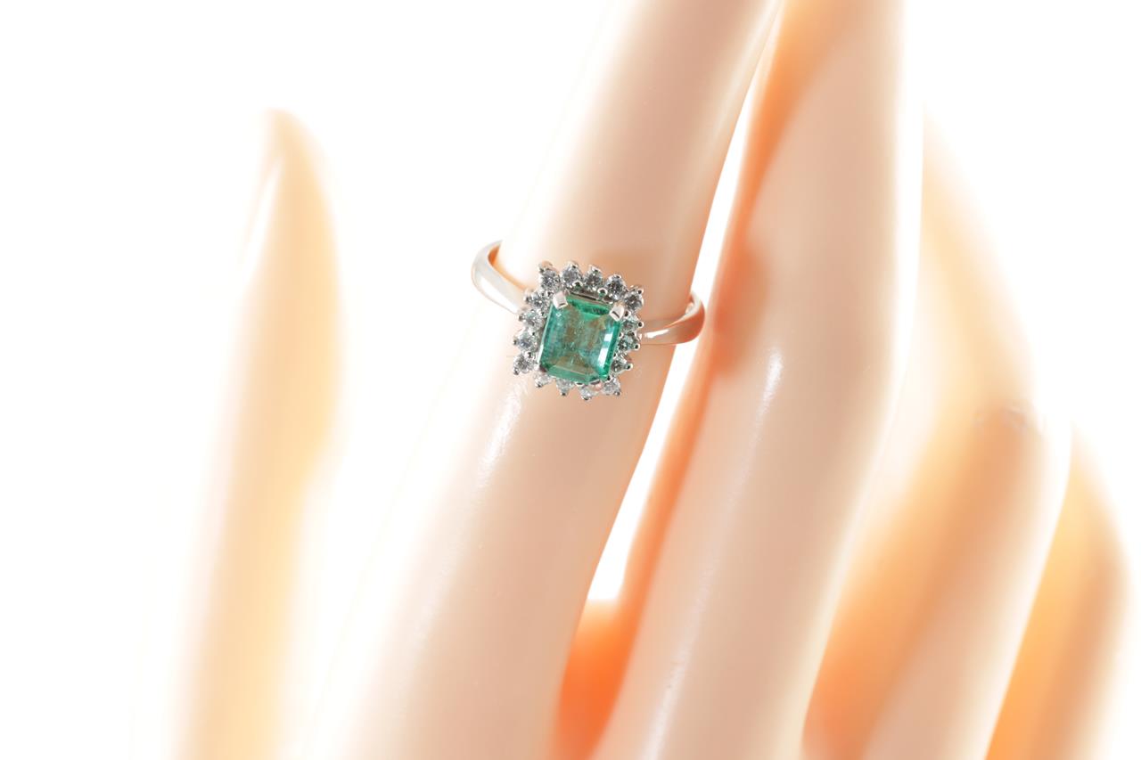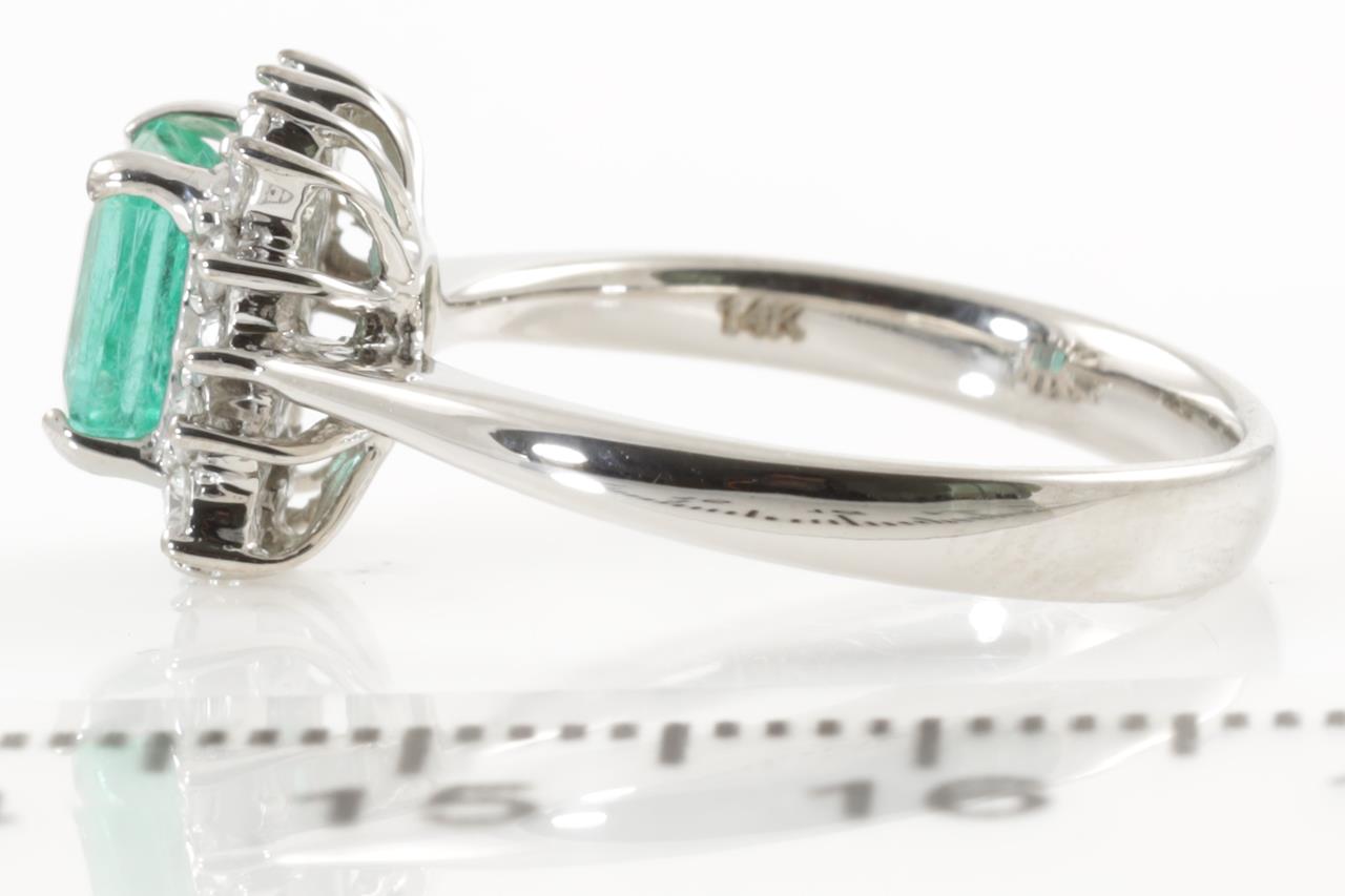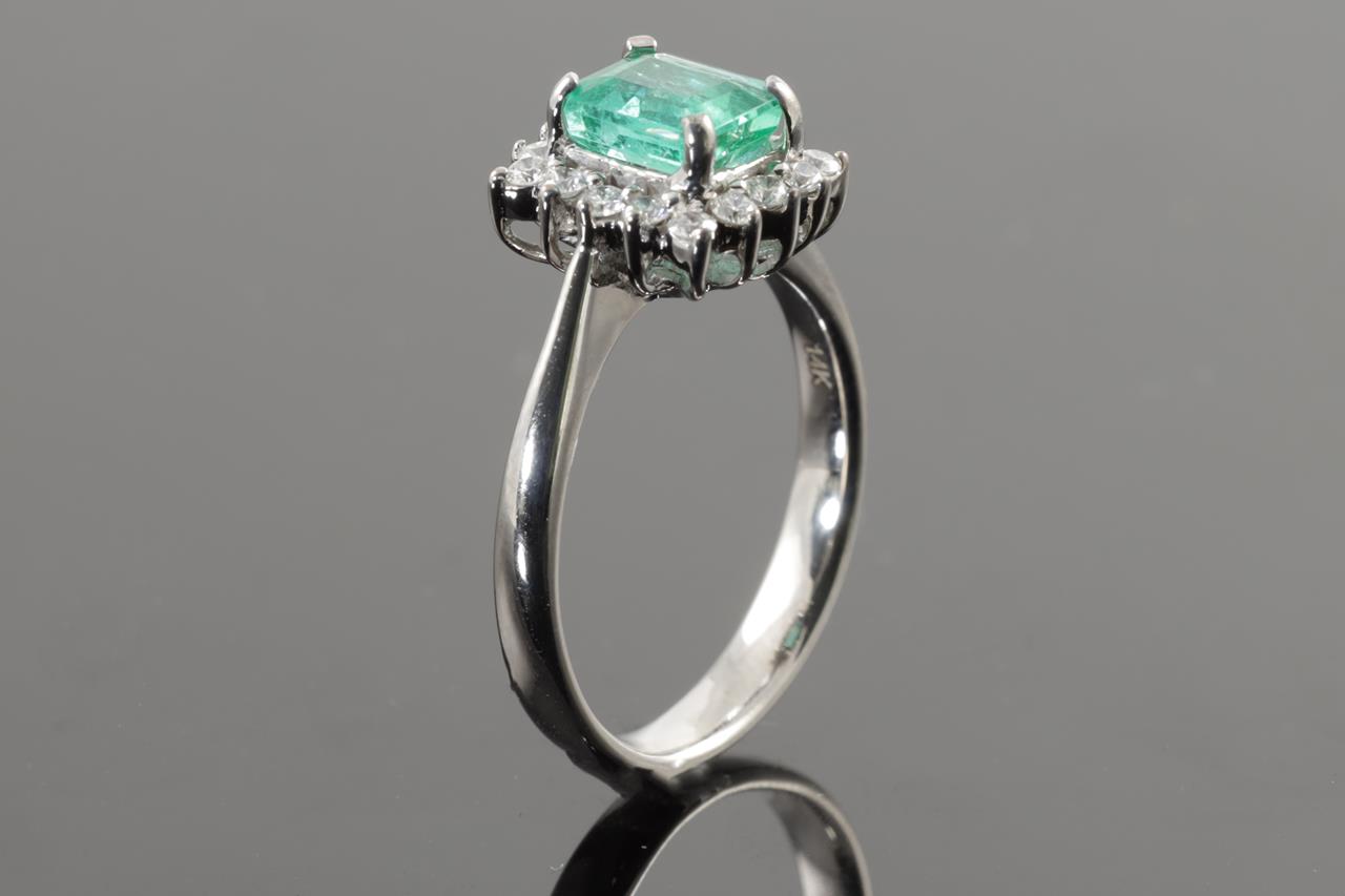 Emerald and Diamond Ring with emerald cut Emerald of approximately 1.00ct and round Diamonds totalling approximately 0.26cts. 14ct white gold. Ring size K1/2. Weight 3.4g. (Pre-owned)