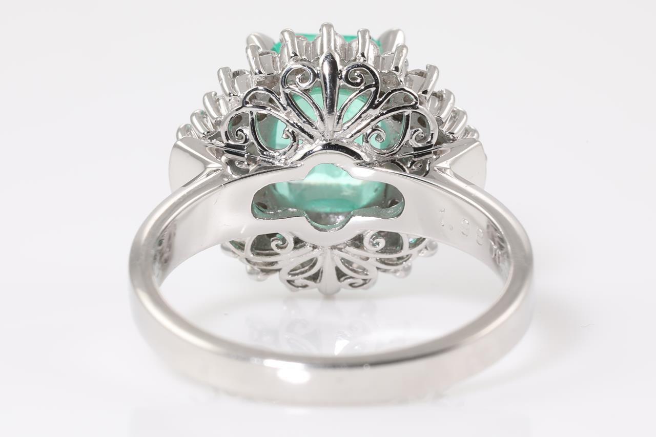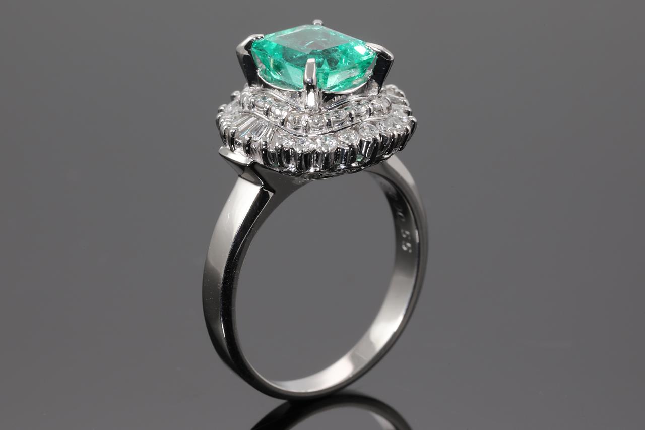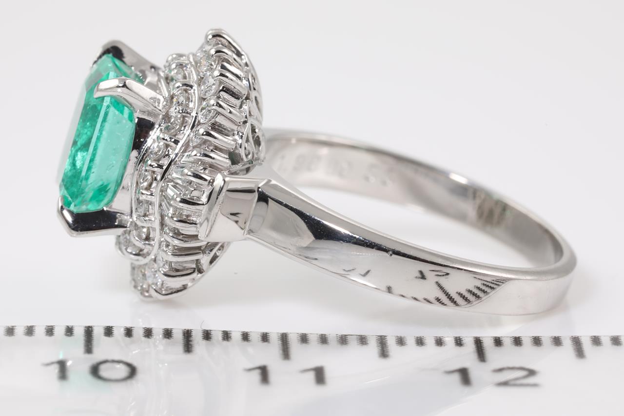 Emerald and Diamond Ring with emerald cut Emerald of 1.98ct and Diamonds totalling 0.55cts (Estimated grading: G-H SI-P1). Platinum. Ring size: L1/2. Weight: 9.3g (Pre-owned)