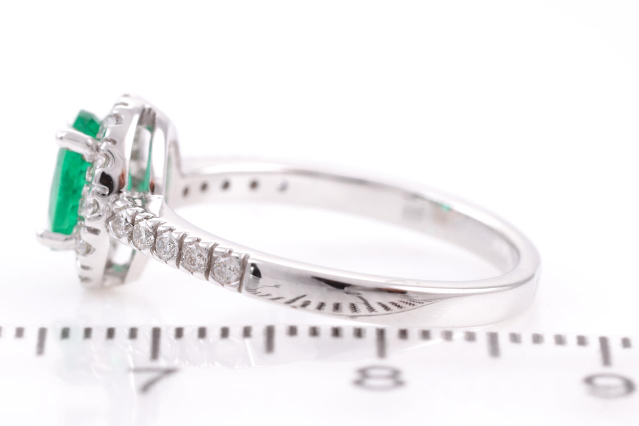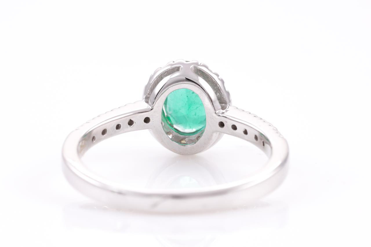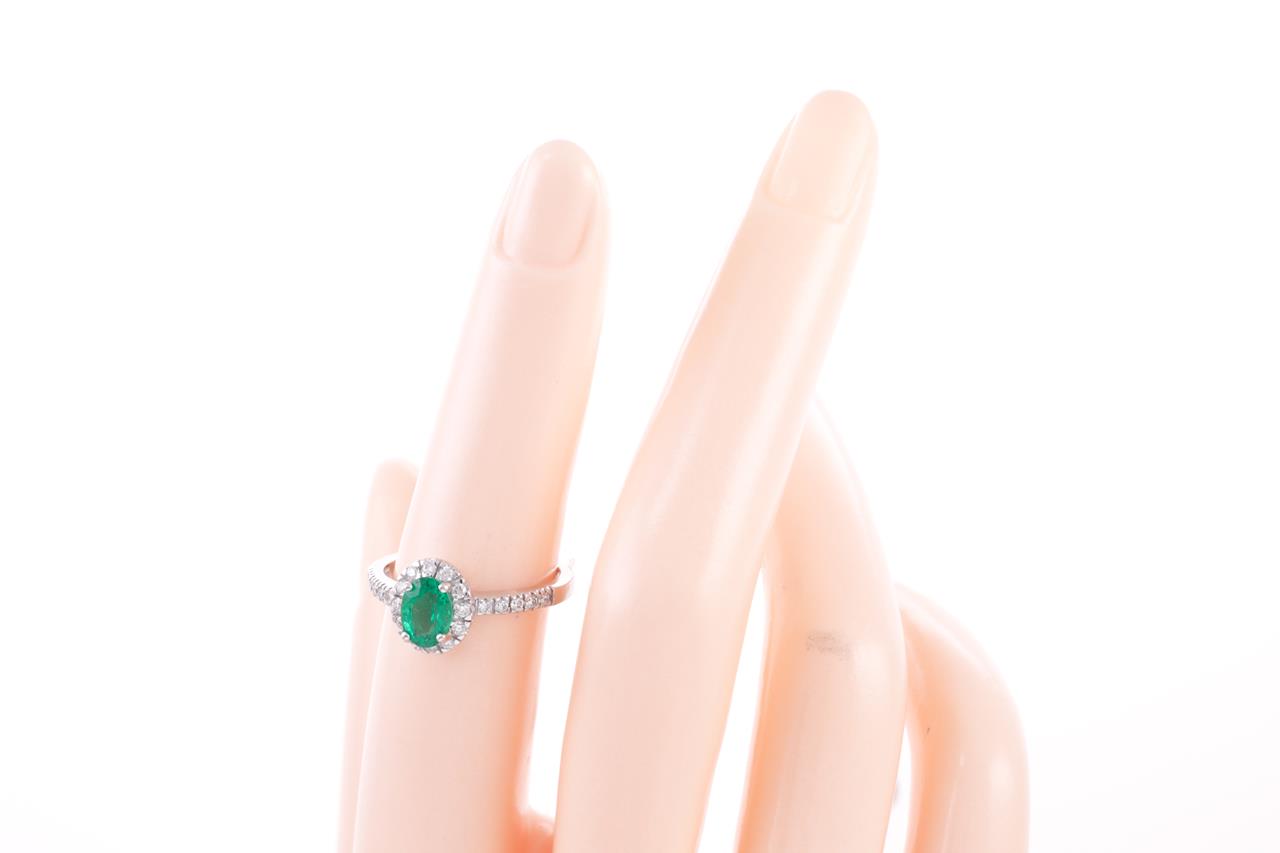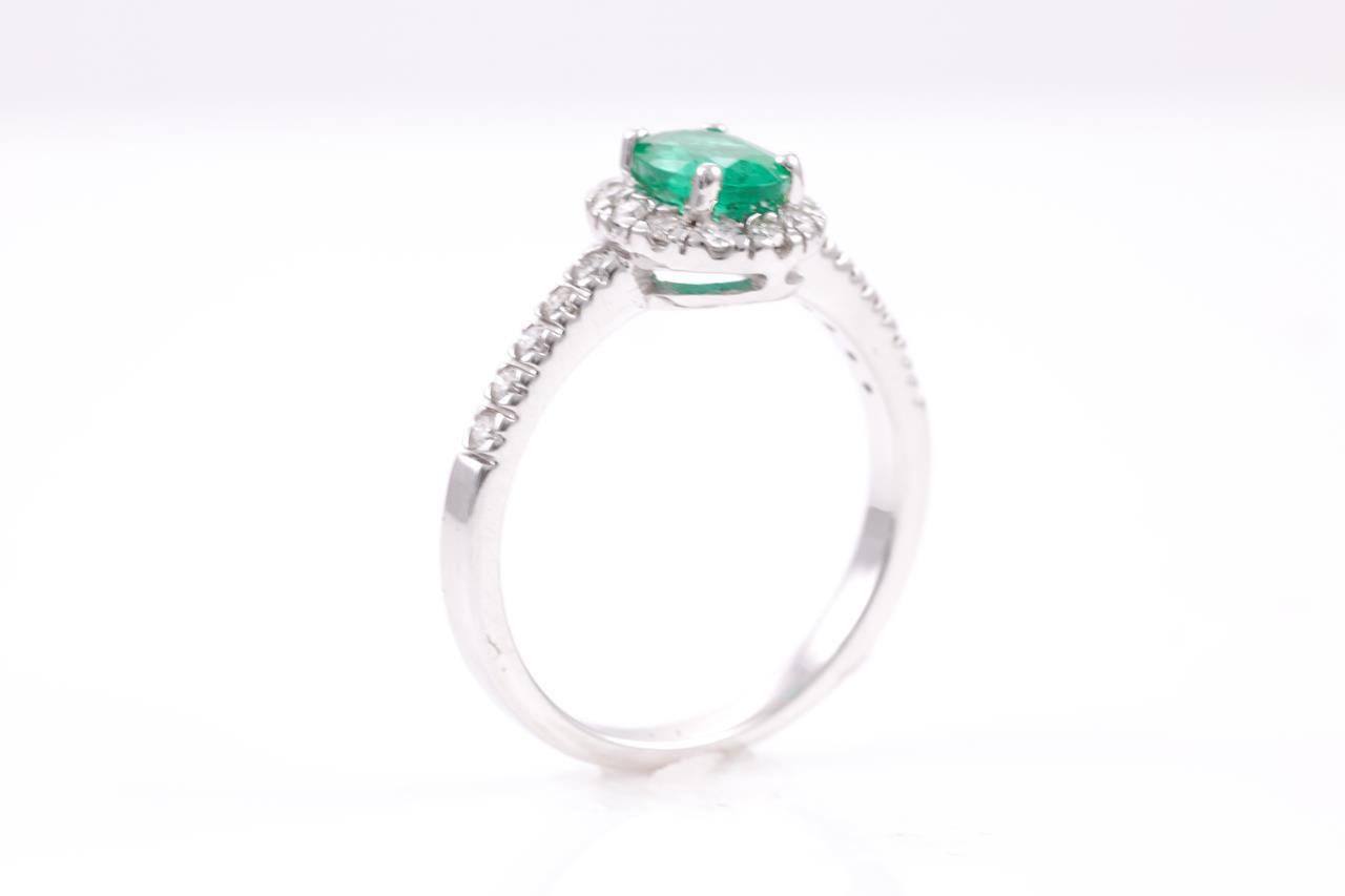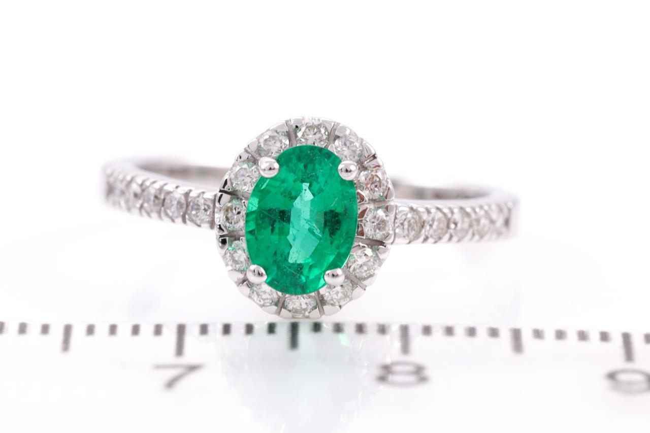 Emerald and Diamond Ring with centre oval cut Emerald of approximately 0.78ct and round Diamonds totalling approximately 0.35cts (Estimated Grading: G-H SI). 18ct white gold. Ring size L. Weight 3.2g. (Pre-owned)