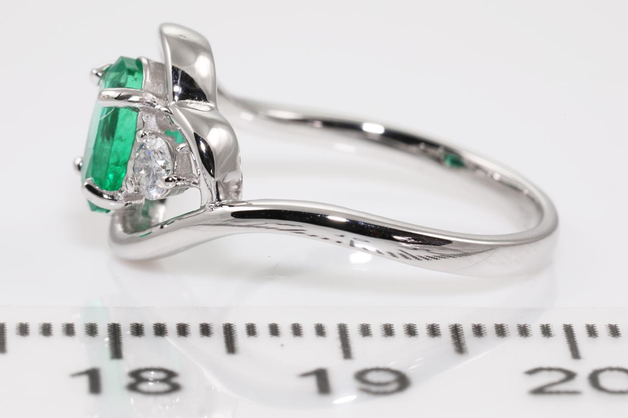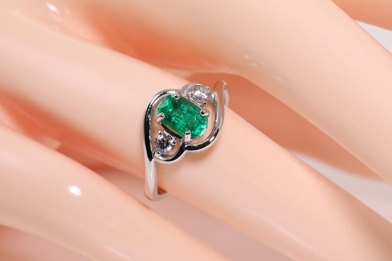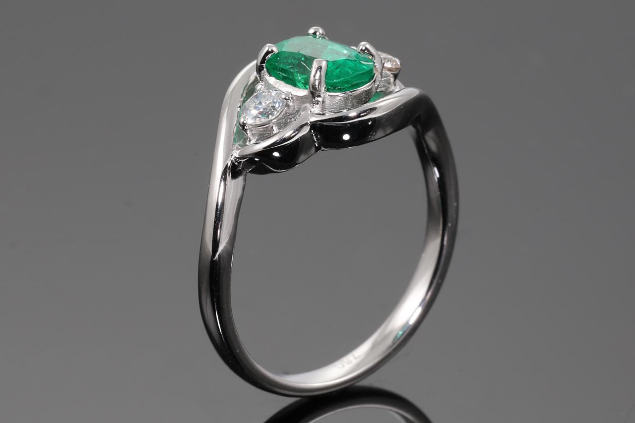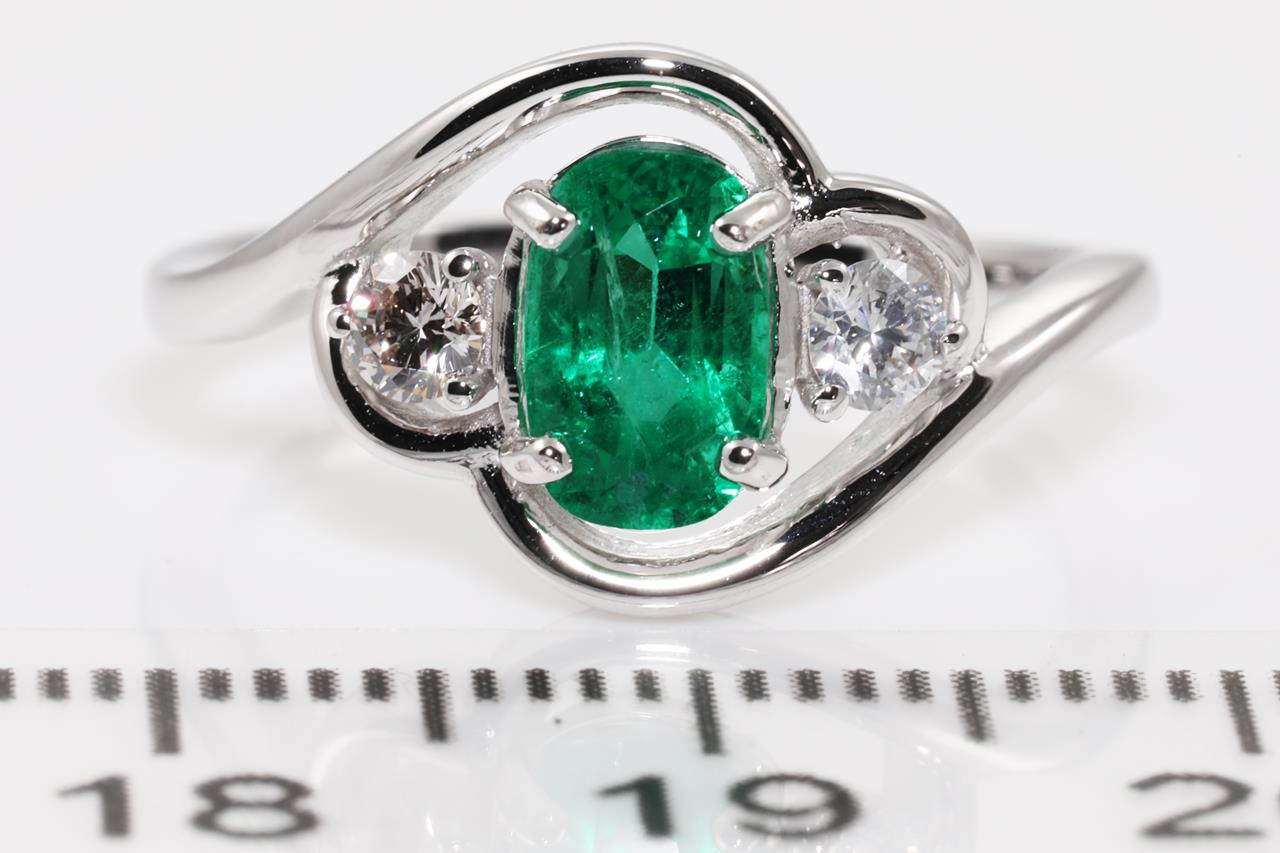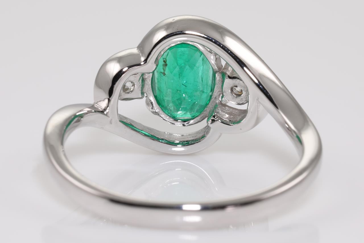 Emerald and Diamond Ring with centre oval Emerald of approximately 0.95ct (with surface reaching inclusions) and Diamonds totalling approximately 0.22cts (Estimated grading K-L SI). 18ct white gold. Ring size L. Weight 3.4g. (Pre-owned)