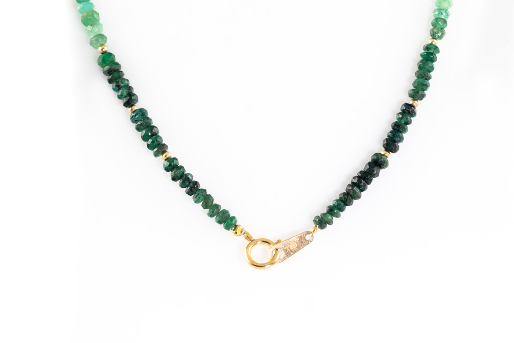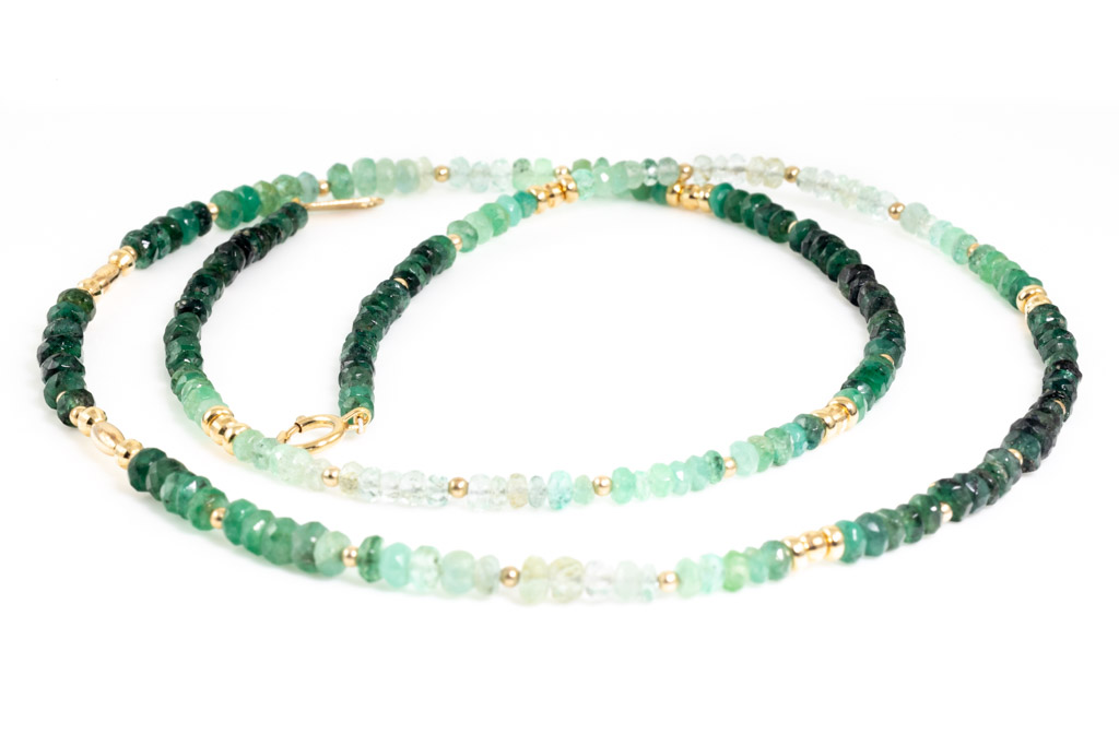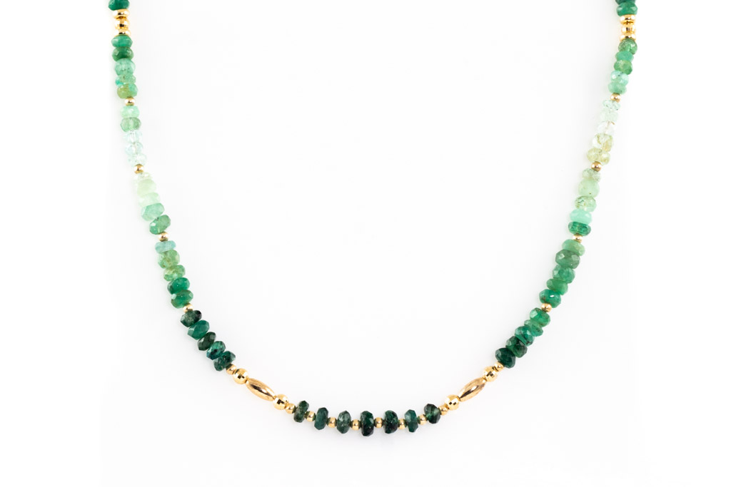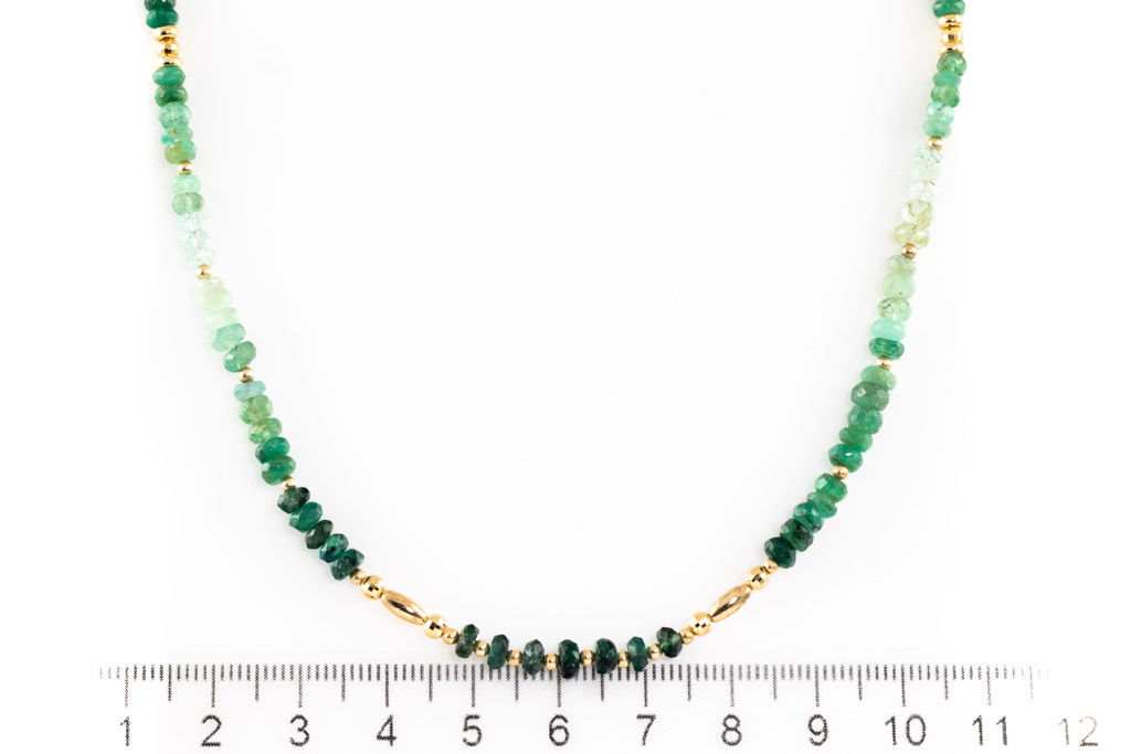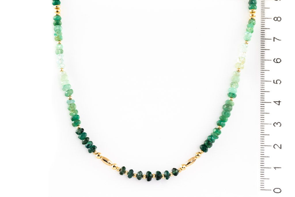 Emerald bead necklace with light to dark green Emerald beads. 18ct yellow gold. Length: 58cm. Weight: 10.9g. (Pre-owned)